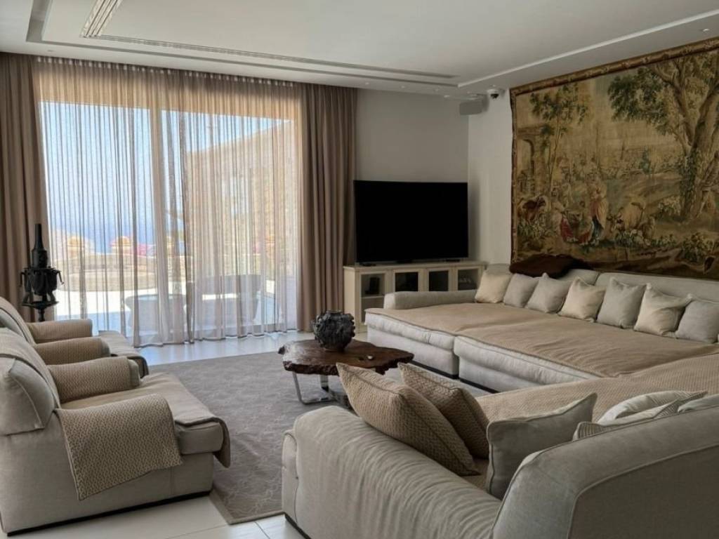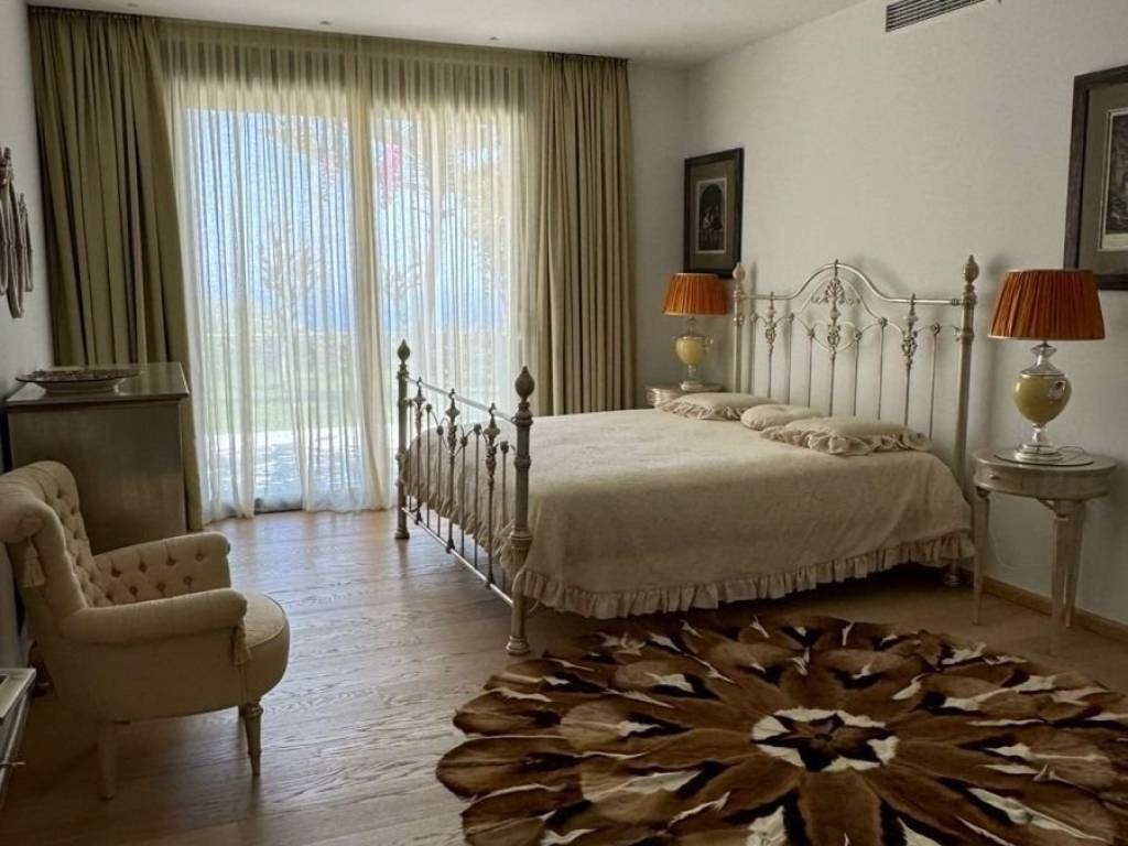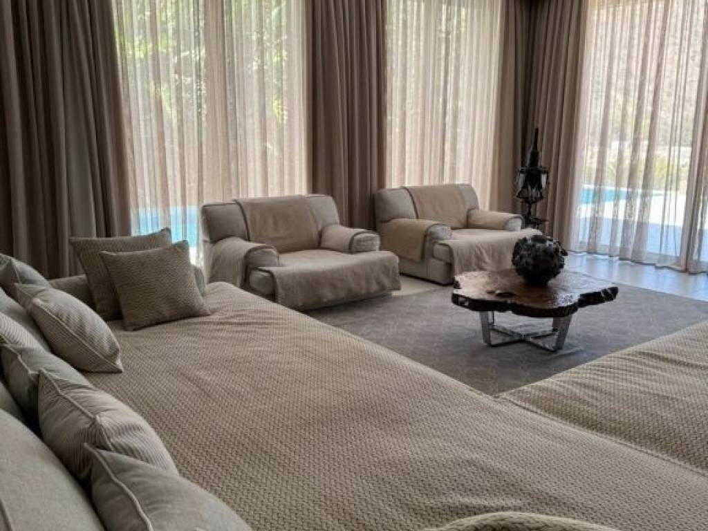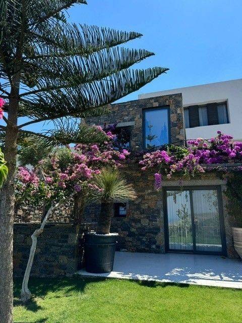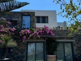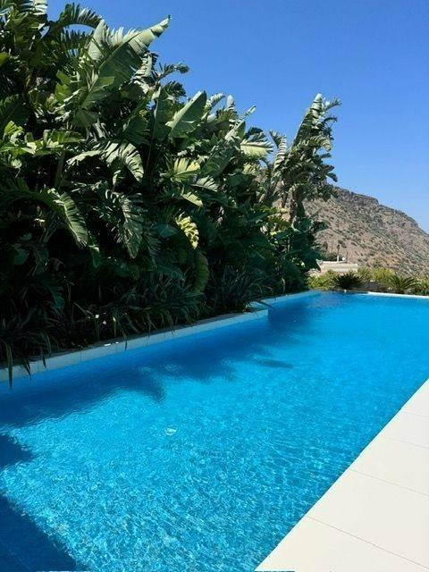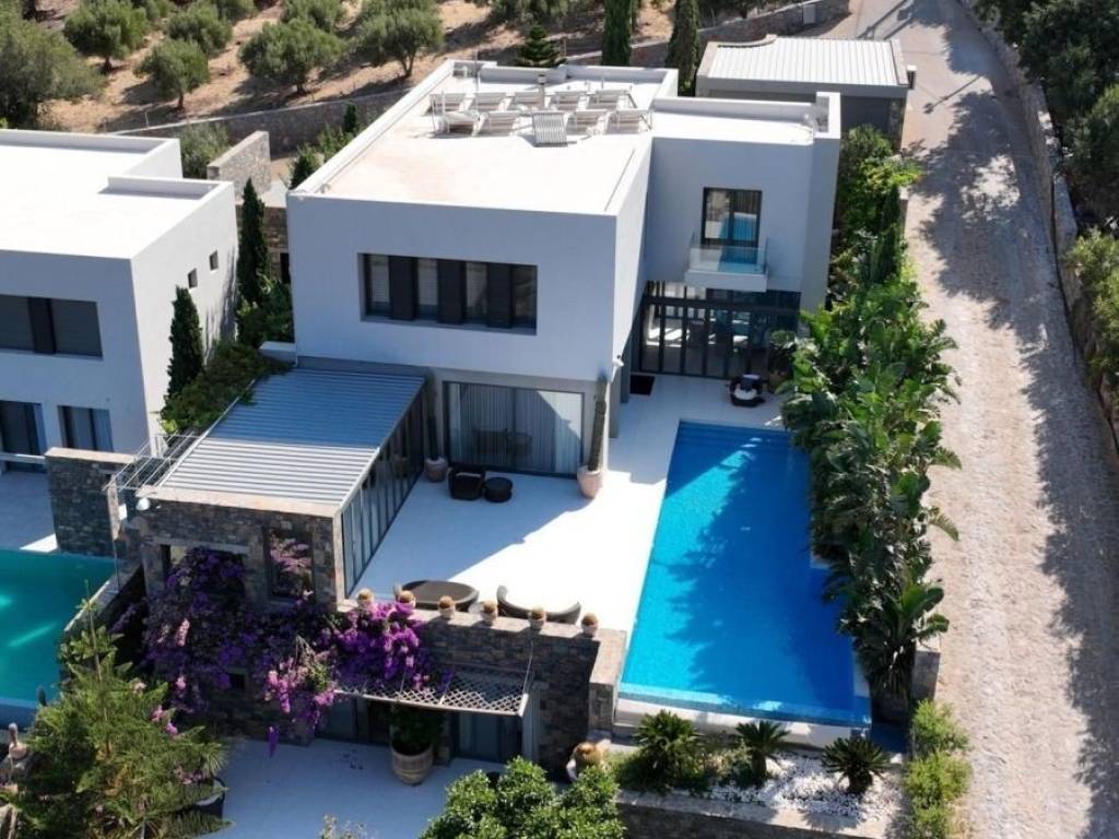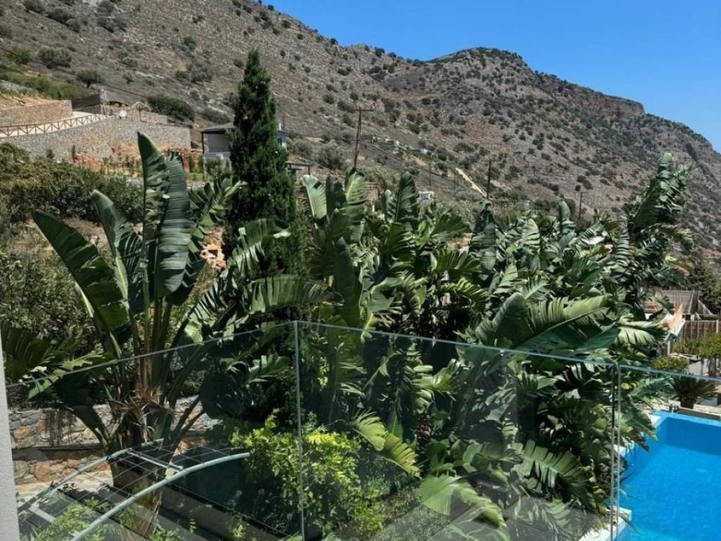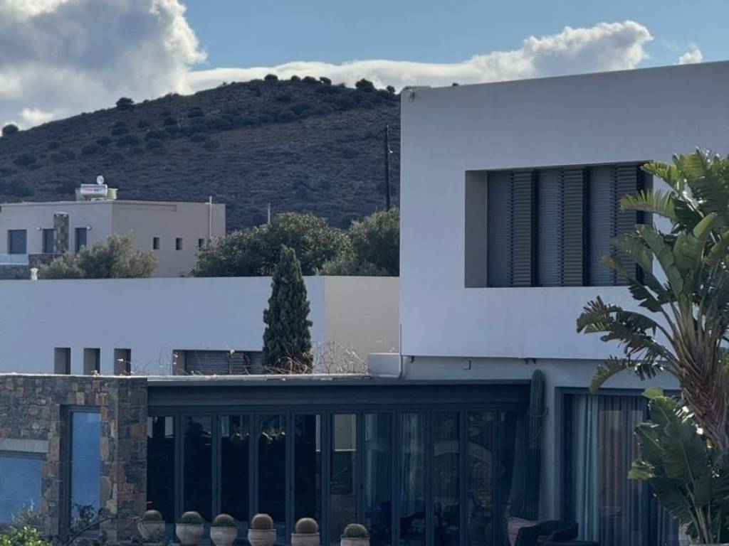 An elegantly furnished villa of 470m2 is available for sale just 1km far from the sea and Plaka, 6km from Elounda, 15km from Aghios Nikolaos the capitol town of Eastern Crete and 78km from the international airport of Heraklion. This villa is a part from a complex of five villas in total. It is developed in three levels. The upper level has 3 bedrooms with dressing areas and bathrooms with large showers. The master bedroom has access to a balcony and the area of the bedrooms is about 30 m2. The floor covering is oak parquet. On the middle level there is a living room with an adjoining kitchen with access to a barbecue area and a glazed dining area. The glazed dining area has an air conditioning system, as well as the opening of the entire glazing area. Also there are a large stove- fireplace, a laundry room and a bathroom. The lower level has 2 bedrooms with separate bathrooms and dressing areas with access to the garden. Additionally, there is a guest house of 50m2 beneath the main villa, complete with a kitchen, bedroom, and bathroom. The furniture is with custom-made pieces from Italy and America, rare artwork, and numerous antiques. Additionally there are a gym equipment, as well as a spacious, air-conditioned garage for two vehicles, an underground fresh water tank of 50 cubic meters and a BBQ . In the external area there is a heated infinity pool of 5x15 meters, while from every corner of the house you can enjoy the magnificent view to Elounda bay and the Spinalogka island. A well-maintained garden with fruit trees: pomegranate, apricot, lemon, orange, tangerine, grapefruit, grapes and a rare collection of large cacti. The feeling of relaxation, contact with the blue sea, comfort and modern luxury are the hallmarks of this deluxe villa.