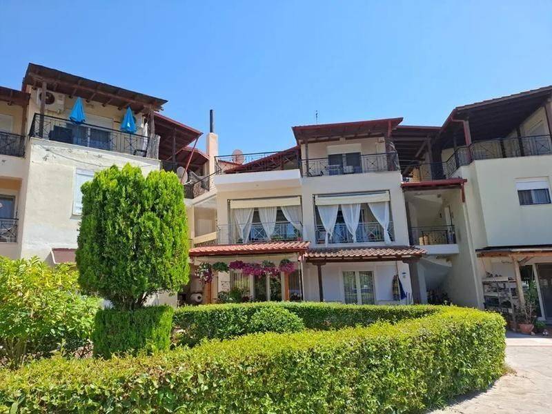 Located in Hanioti, very close to the village center, this spacious 108 sq.m. home is ideal for year-round living or holidays. It features: 3 spacious bedrooms 1 large full bathroom Designer kitchen and open-plan living area Two large verandas Additional highlights include: 3 storage rooms Heating system, eco-friendly energy fireplace, solar panels, and A/C inverters Fully furnished with electrical appliances Private parking space The layout allows for an easy conversion into two separate apartments, making it a smart investment choice. Just 250 meters from the sandy beach and within walking distance of shops, cafes, and amenities. Price: €340,000