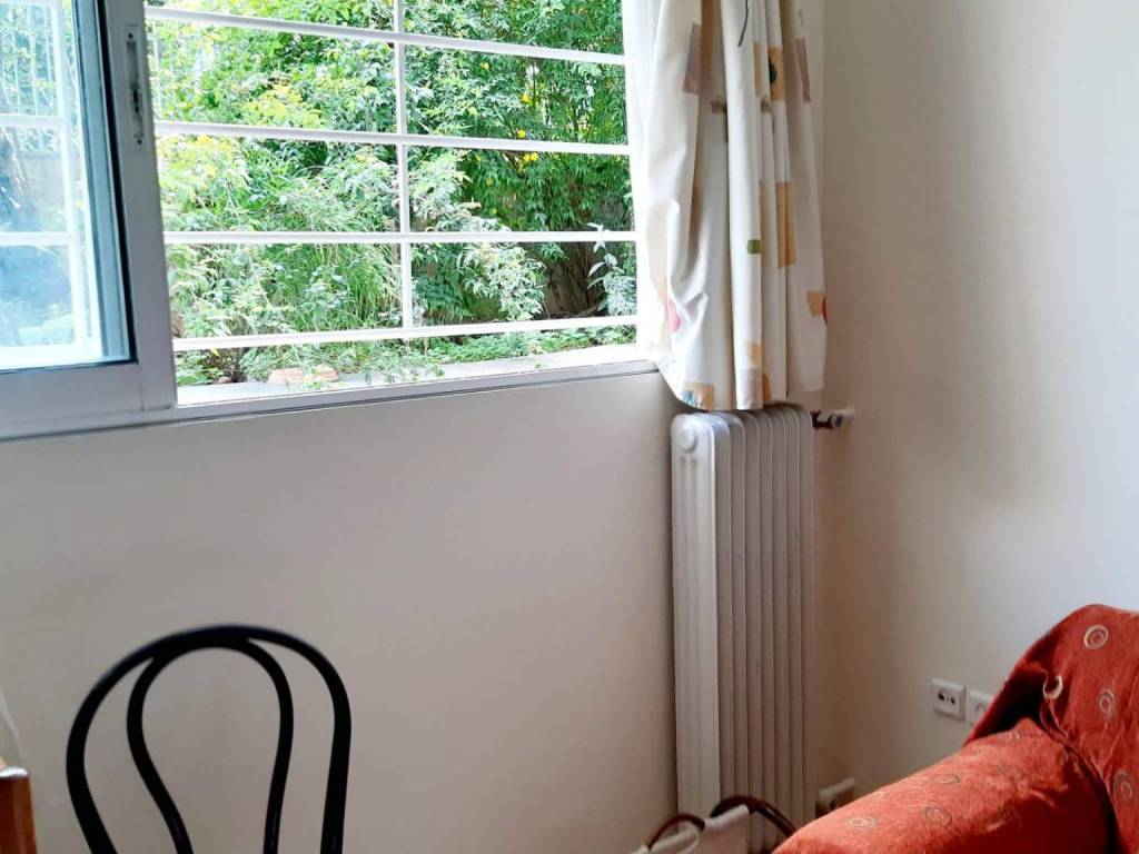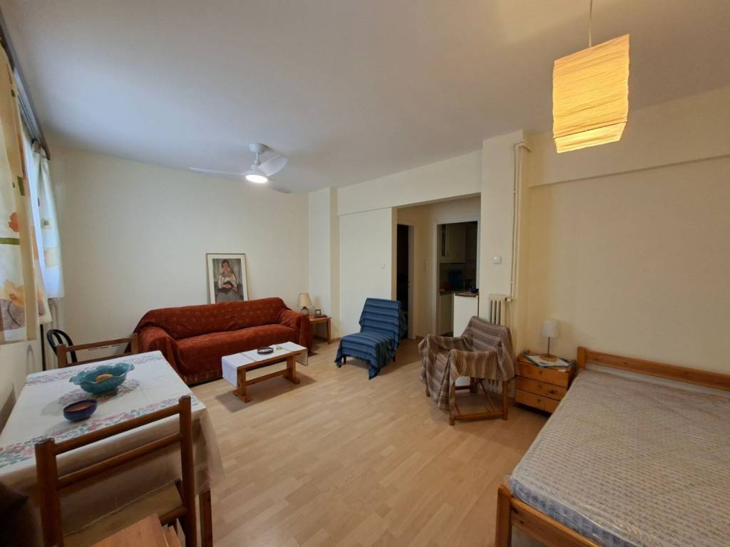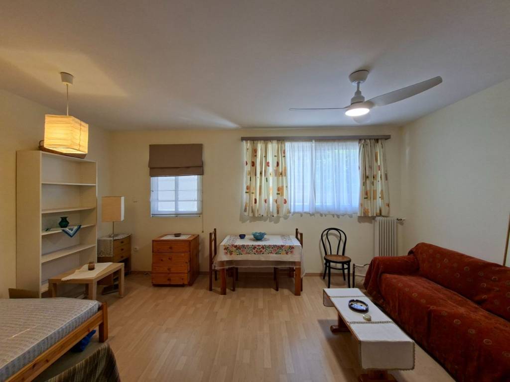 Semi-basement studio apartment in Ilisia, 38 sq m. Overlooking a garden that has an entrance from a pedestrian street, which borders a park. Located 4 minutes from the Megaro Mousikis metro station. Sunny, renovated, fully furnished and equipped with all the necessities.