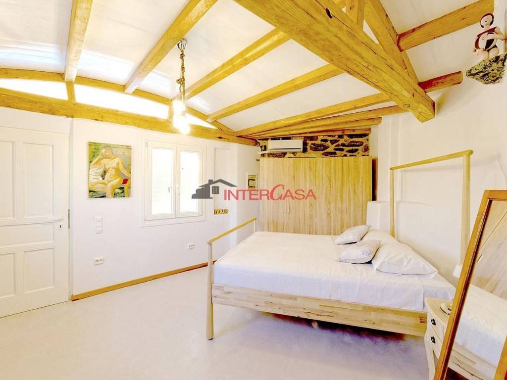 Stone-built detached house for sale, with swimming pool and fantastic view to the west, total area 220 sq.m. on a plot of 4500 sq.m. in the most beautiful spot in Agios Ioannis. It consists of a main house, 2 studios of 30 sq.m. and 35 sq.m. respectively, garage, cellar, warehouse and cistern of 20 cubic meters.