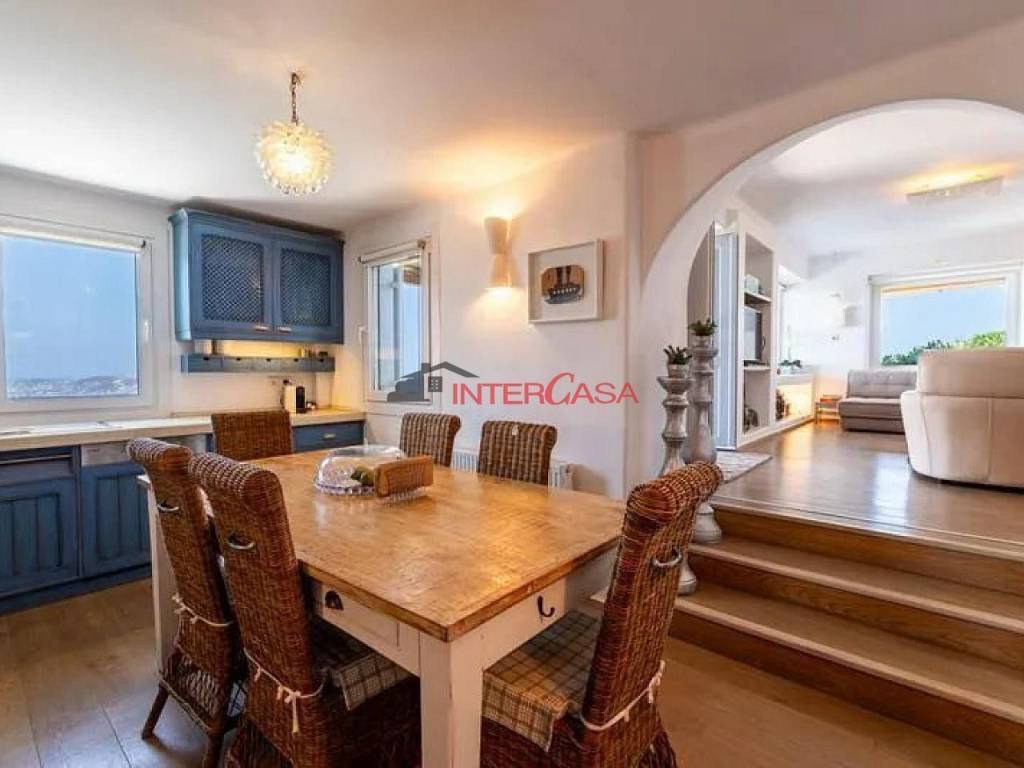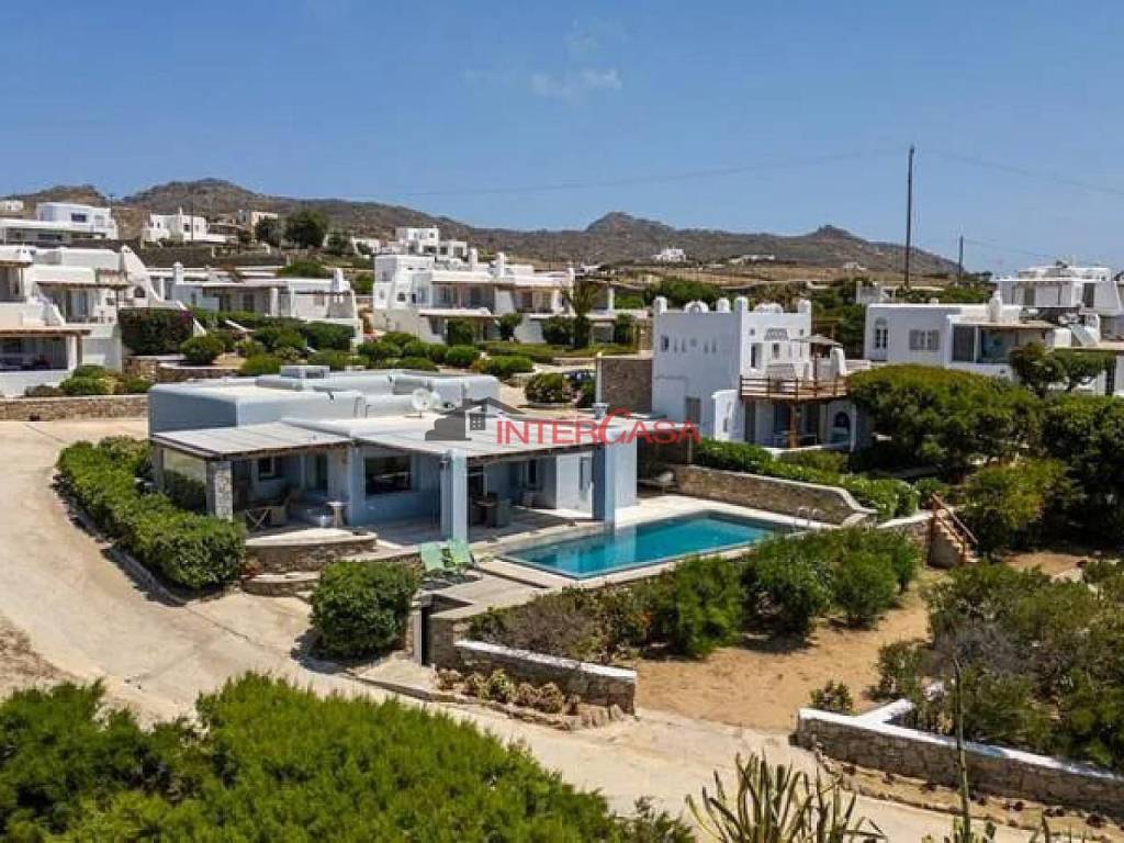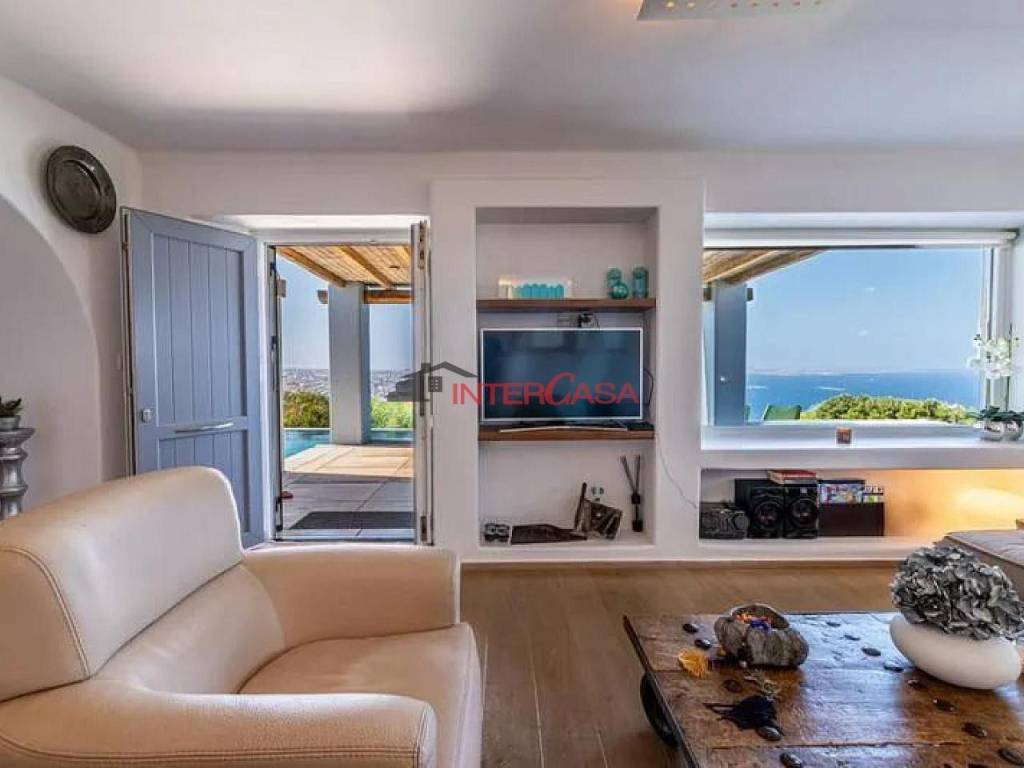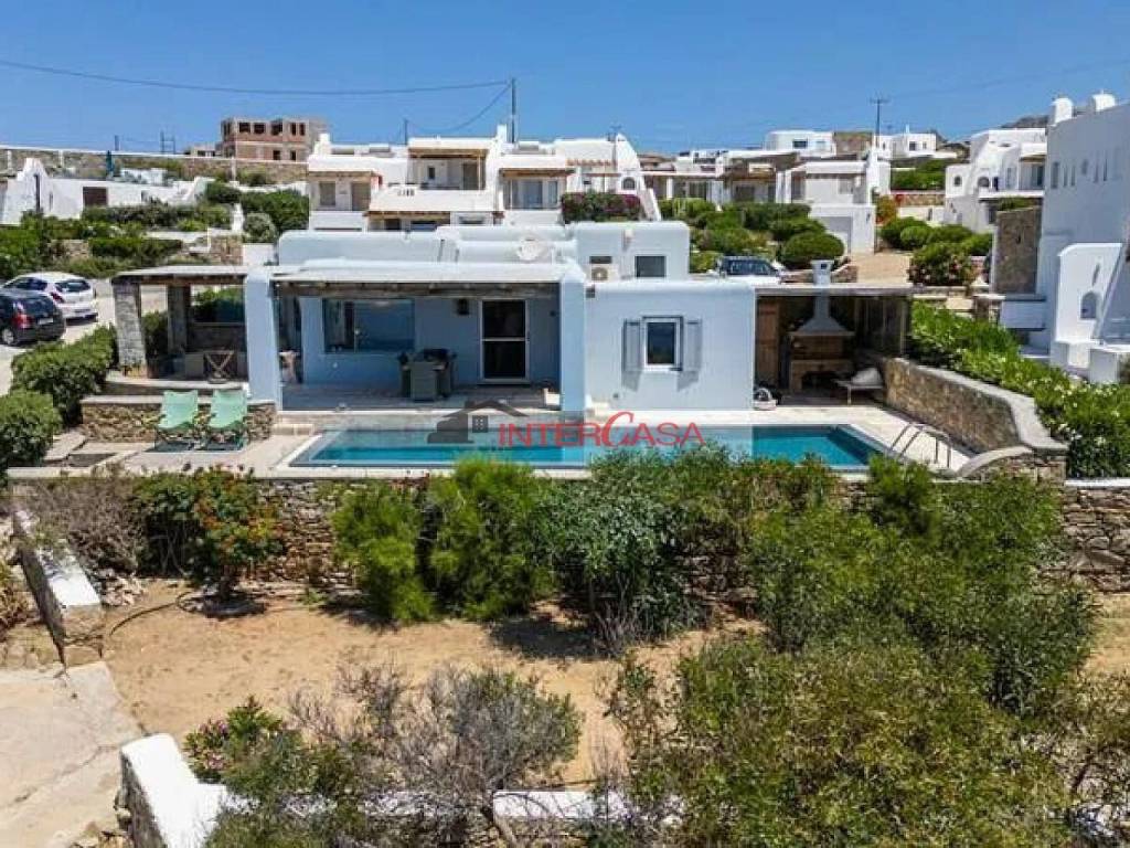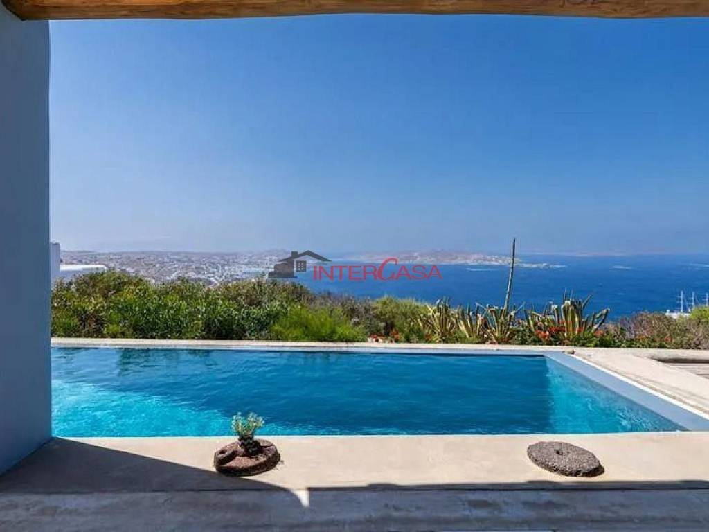 Villa For Sale in Mykonos, 135 sq.m., plot 706 sq.m., 3 bedrooms, 2 bathrooms, Fully Equipped Kitchen, WC, Sea view, Mykonos Town and Windmills View, Sunset View, parking, Security Door, Cable TV, Internet, TV, Balcony, Terrace, BBQ, Outdoor dining and lounge area, Swimming pool, Garden