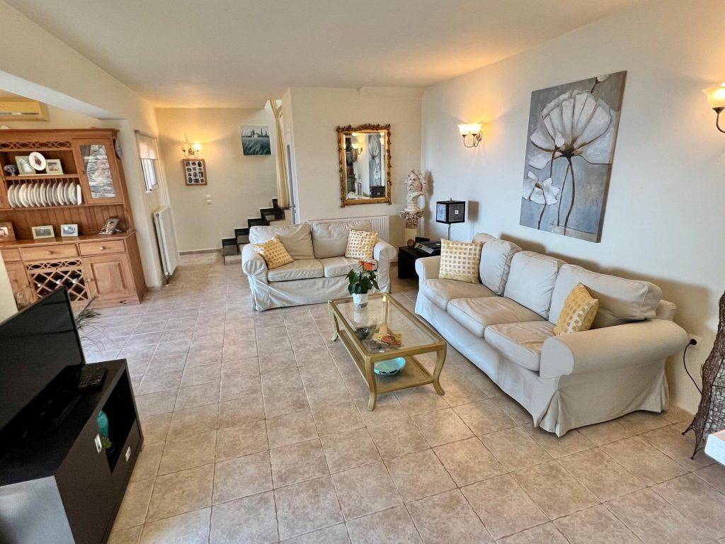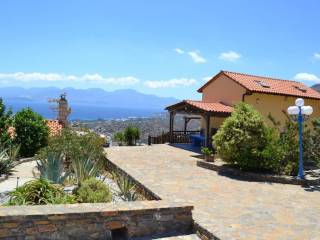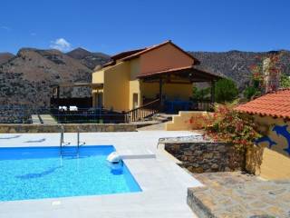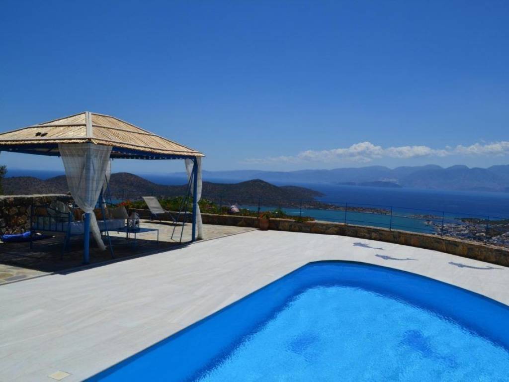 Perched on a commanding hillside above the prestigious resort of Elounda, this modern, semi-detached two-bedroom villa occupies a commanding position with unobstructed panoramas. Completed in 2008, the residence sits on an expansive 2,500 sq. meter landscaped plot, offering a rare degree of privacy and space for this sought-after location. From its elevated position, the property commands sweeping, panoramic views across the villages of Elounda, the shimmering Gulf of Mirabello, and the distant Sitia Mountains. The villa is thoughtfully distributed across three levels, blending modern comfort with traditional charm: Lower Level: An airy, open-plan living and dining area paired with a fully equipped kitchen featuring beautiful stone worktops, a built-in oven/hob and an extractor fan. Large double sliding doors open directly onto a shaded, covered terrace. A guest W/C completes this floor. Middle Level: A bright hallway leads to the Master Suite, which boasts custom fitted wardrobes and an en-suite shower room. Private sliding doors open to a wide, covered balcony overlooking the sea. Upper Level: A characterful second bedroom featuring wooden ceilings, a dedicated dressing room, and an en-suite shower room. This room opens to a private, sun-drenched balcony with truly breathtaking views. The exterior is designed to embrace the Mediterranean climate, featuring: – A private swimming pool framed by a poolside pergola and sun terraces. – A dedicated BBQ area set within beautiful gardens to the front, side, and rear. – Secure, gated entry surrounded by stone walls. – Practical features including oil central heating, full air conditioning, double glazing, an alarm system, and ample private parking. Offered partly furnished, this villa represents a turn-key opportunity in one of Crete’s most exclusive postcodes. The resort of Elounda and its sandy beach is about a 7-8 minute drive from the property. The province capital of Agios Nikolaos is about a 20-minute drive away and the international airport of Heraklion is roughly an hour’s drive away.