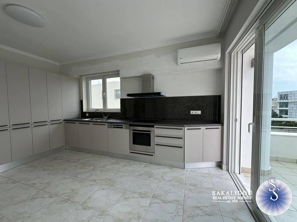 Voula, Kato – 3rd-floor apartment, 150 sq.m., with spacious verandas. It consists of a large living room with a fireplace, a fully equipped closed kitchen, 3 bedrooms (one is a master), 2 bathrooms, and a WC. It features large verandas, underfloor heating, an alarm system, 1 parking space and a storage room.