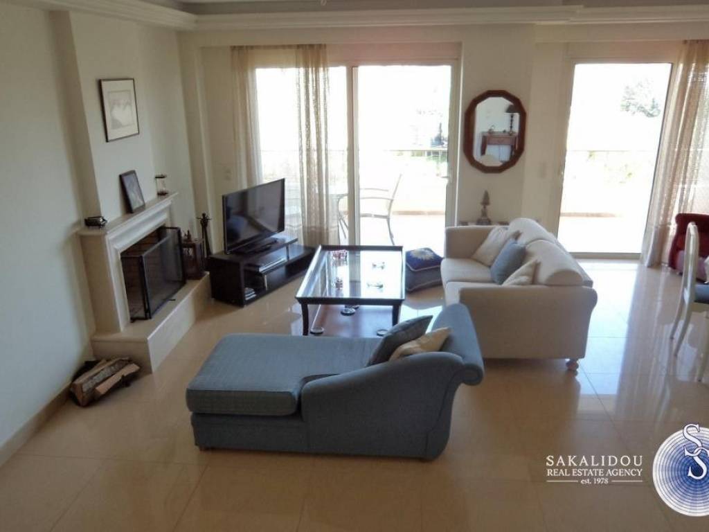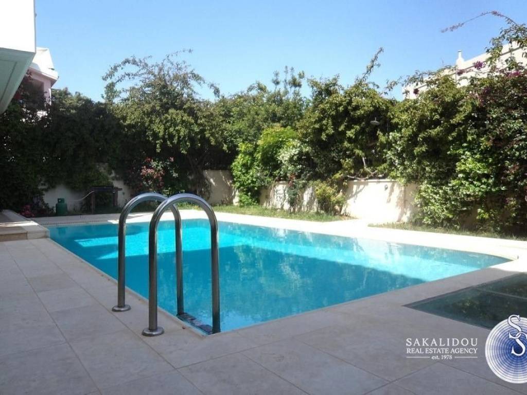 VARKIZA, Asirmatos, ground floor maisonette 230sqm , with garden and pool in quiet residential area. Living room - dining room, separated fully equipped modern kitchen, 4 bedrooms (1 master), 3 bathrooms , wc, playroom with fireplace, kitchenette and separated entrance. It also has an internal lift, independent heating, central a/c system, solar water heater, boiler, garage, storage spaces and a large roof storage.