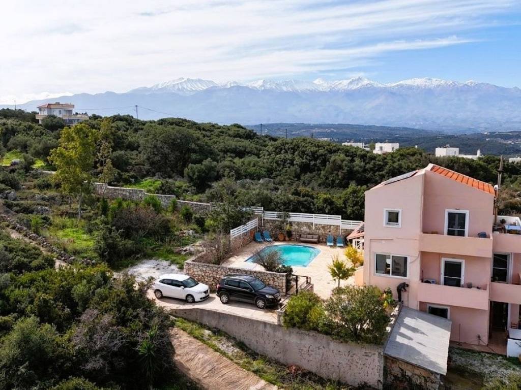 Set on an elevated 1,800 m² plot in the highly desirable village of Plaka, this impressive 200 m² property offers privacy, sustainability, and breathtaking panoramic sea and mountain views. Combining a main residence with a fully self-contained one-bedroom studio, a swimming pool, and a productive organic orchard garden, this home is ideal for comfortable family living, hosting guests, or generating rental income. The main house features two well-proportioned bedrooms, bright living areas, and a welcoming atmosphere enhanced by reverse-cycle air conditioning (heating and cooling) and a wood-burning stove, making it suitable for year-round living. Large openings frame the stunning sea views, allowing natural light to flood the interiors and creating a strong connection with the outdoors. On the lower level, the property includes an exceptional one-bedroom apartment, complete with its own kitchen, full-sized bathroom, and private living space. This area is perfect for guests, extended family, or independent rental use while still being seamlessly connected to the main house. Outside, the home is surrounded by a mature orchard garden with a variety of fruit and nut trees, offering a peaceful, green setting and a taste of self-sufficient living. The concrete swimming pool is perfectly positioned to enjoy the open sea views, while generous outdoor areas provide space for relaxation and entertaining. The plot is fully fenced, making it ideal for families with children or dog owners seeking a secure outdoor environment. Designed with sustainability in mind, the property benefits from a large solar power system with its own batteries, allowing near off-grid living while remaining connected to the mains electricity supply. Additional features include solar water heating, an 18,000-litre backup water storage system, and the property is offered fully furnished, ready for immediate use. This is a rare opportunity to acquire a versatile, eco-conscious home in Plaka with exceptional views, flexible accommodation, and strong lifestyle and investment appeal. FEATURE HIGHLIGHTS Plot size: 1,800 m² House size: 200 m² 2 bedrooms in main house + 1-bedroom self-contained studio 3 bathrooms Concrete swimming pool Panoramic sea and mountain views Fully fenced plot (ideal for dogs) Large solar power system with batteries (grid-connected) Solar water heating 18,000-litre water backup system Reverse-cycle air conditioning throughout (heating & cooling) Wood-burning stove Fully furnished Orchard garden with fruit & nut trees Peaceful setting in Plaka village