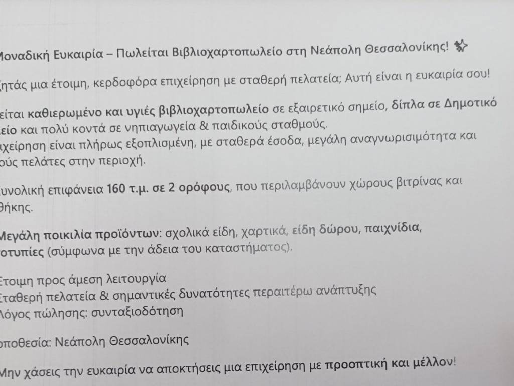 ΠΩΛΕΙΤΑΙ ΕΠΙΧΕΙΡΗΣΗ Βιβλιοπωλείο 80 τμ. ισόγειο και 80 πατάρι στην Νεάπολη ΘΕΣΣΑΛΟΝΙΚΗΣ 20000 ΕΥΡΩ Πωλείται έτοιμη κερδοφόρα επιχείρηση σε κεντρικό δρόμο της Νεάπολη. Το κατάστημα στο οποίο στεγάζεται η επιχείρηση αποτελείται από 2 επίπεδα . 2310729408 6977414202 ΠΟΛΙΤΗΣ ΑΘΑΝΑΣΙΟΣ Αμπελώνων 45 Αμπελόκηποι Όλες οι πληροφορίες βασίζονται σε πληροφορίες που έχει προσκομίσει ο εντολέας. Η εταιρεία και οι συνεργάτες λειτουργούν στα πλαίσια εσωτερικού κανονισμού πιστοποιώντας την ποιότητα των παρεχόμενων υπηρεσιών σύμφωνα με τον νόμο περί μεσιτείας της Ελληνικής και Ευρωπαϊκής νομοθεσίας. Μέλος Σ.Μ.Α.Σ.Θ Το κτηματομεσιτικό γραφείο ΠΟΛΙΤΗΣ ΣΑΚΗΣ εδρεύει στους Αμπελόκηπους, Αμπελώνων 45. Αναλαμβάνουμε την αγοραπωλησία και μίσθωση του ακινήτου σας, την ανακαινισή του, καθώς και την έκδοση στεγαστικών δανείων. Διαθέτουμε μεγάλο αριθμό ακινήτων παντός τύπου (κατοικίες, εξοχικά, επαγγελματικά και επενδυτικά ακίνητα, γη). Στη διάθεσή σας για οποιαδήποτε συνεργασία ανάθεσης ή ζήτησης ακινήτων, καθώς και για κάθε απορία και συμβουλή στην αγοραπωλησία και μίσθωση του ακινήτου σας.