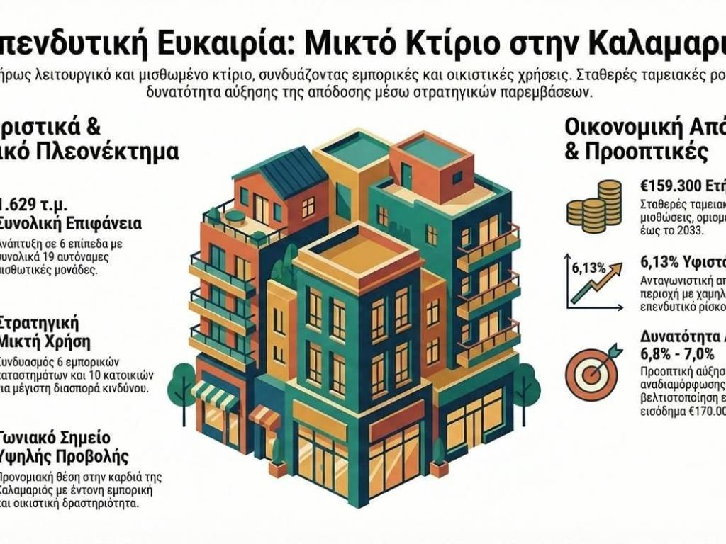 Rare Investment Opportunity: High-Yield Mixed-Use Building (6.13%) in the Heart of Kalamaria A prime mixed-use investment property is available for sale, strategically located on a main avenue in one of the most highly sought-after corner spots in Kalamaria. Boasting a dual frontage that ensures maximum commercial visibility, this fully leased property represents a stable and secure investment with immediate cash flow. Its privileged location offers direct access to the waterfront, a metro station, and public transportation, as well as a quick connection to the airport. These features significantly enhance its long-term value and ensure steady rental demand. Key Features: Total Area: 1,629 sq.m. (approx. 1,480 sq.m. net internal area). Levels: Developed across 6 levels (Basement, Ground Floor, Mezzanine, 1st, 2nd, and 3rd floors). Rental Units: 16 independent units. Usage Breakdown: 6 retail shops (230.09 sq.m.) on the ground floor, 1 storage room (24.39 sq.m.), and 10 residential units (ranging from 45 to 167 sq.m.) on the upper floors. Condition: Built in 1968, in excellent working condition (Energy Class C, Structural Assessment/YASVE: Green). Includes an elevator and balconies. Investment & Financial Profile (Base Case): Annual Income: €159,300 (Monthly: €13,276) from active leases, some of which extend through 2032-2033. Current Gross Yield: Approximately 6.13%. Risk Profile: Medium to low, thanks to excellent tenant diversification across commercial and residential uses. Value-Add Potential: An architectural proposal for the remodeling of the 1st floor (281.99 sq.m.) is already in place. Implementing this proposal could optimize the property's commercial value, increasing the potential annual income by €10,000–€15,000 (reaching a total of €170,000–€175,000). Under this scenario, the gross investment yield would jump to 6.8%–7.0%. Ideal for institutional investors and property management companies seeking a balanced asset with secure returns and room for further growth. The images provided are for illustrative purposes only and do not depict the actual property or its location. www.goldrealestate.gr , Gold Real Estate Group . Telephone from landline toll free for all of Greece 8001007744 and landline 2351077744 .On our website we have over 5000 properties with photographic material and each property that is subject to your needs. Like our page on facebook: https://www.facebook.com/goldrealestate/, to be the first to see all our new properties. 2351077744;8001007744 GOLD REAL ESTATE - CERTIFIED BROKERAGE - REAL ESTATE CONSULTANTS - CERTIFIED APPRAISERS - REAL ESTATE MANAGERS - JUDICIAL ASSESSORS - YEAR OF ESTABLISHMENT 2005