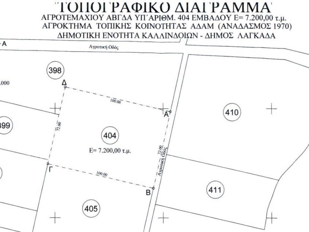 The property is buildable according to the topographic plan, with 72 meters frontage on an agricultural road and easy access from the provincial road. Flat terrain, suitable for agricultural use or future development. Located in a quiet rural area, approximately 35–40 minutes from Thessaloniki city. Clear ownership titles. Topographic plan available.