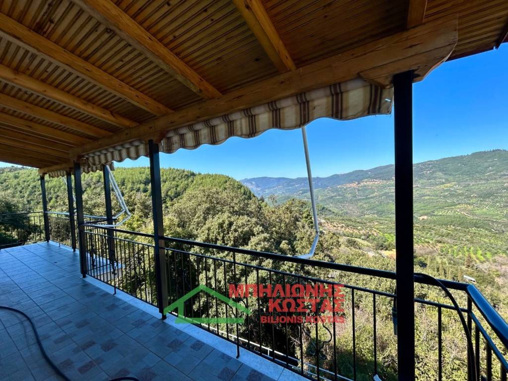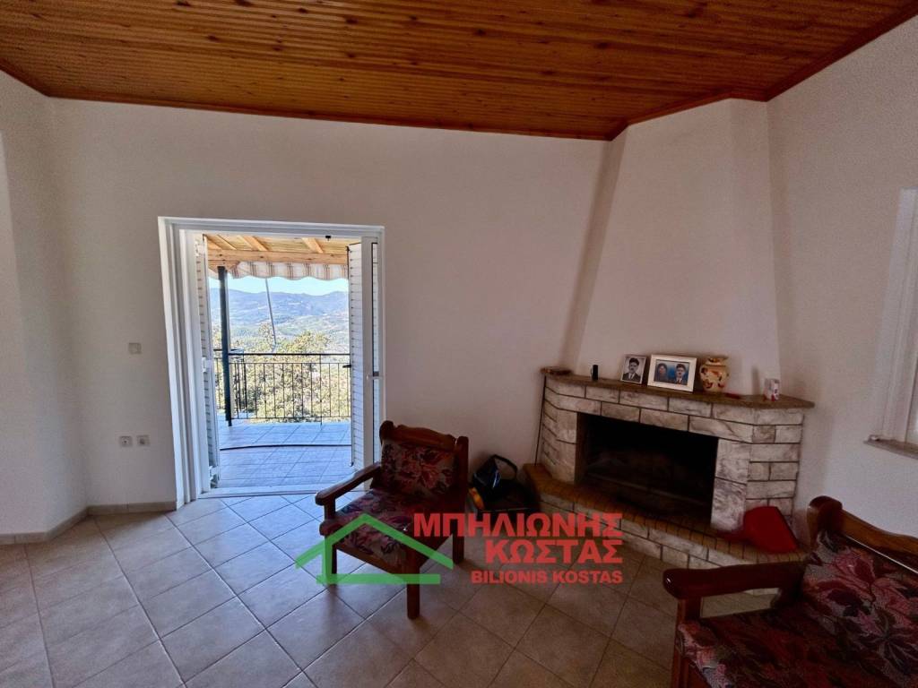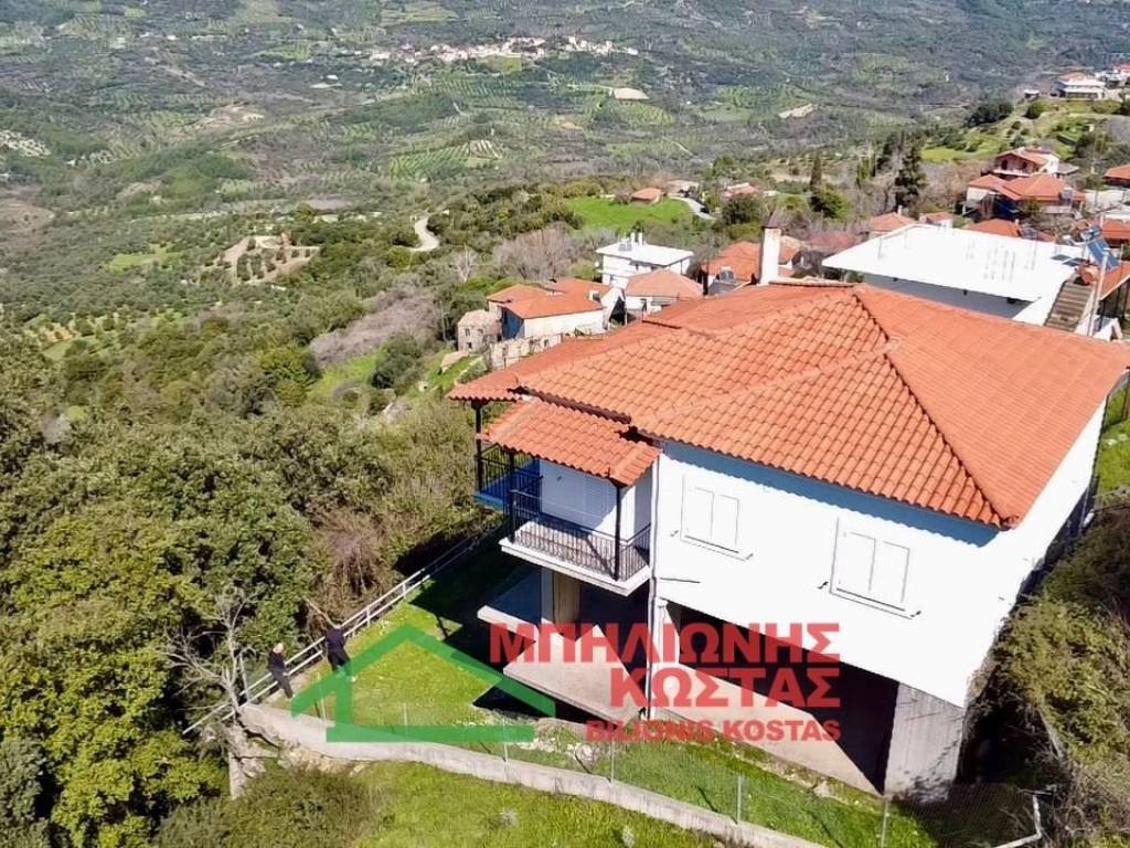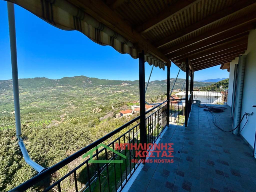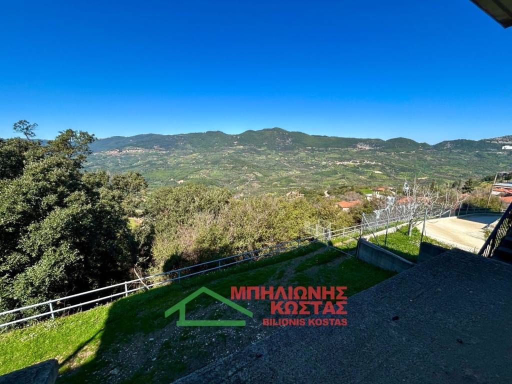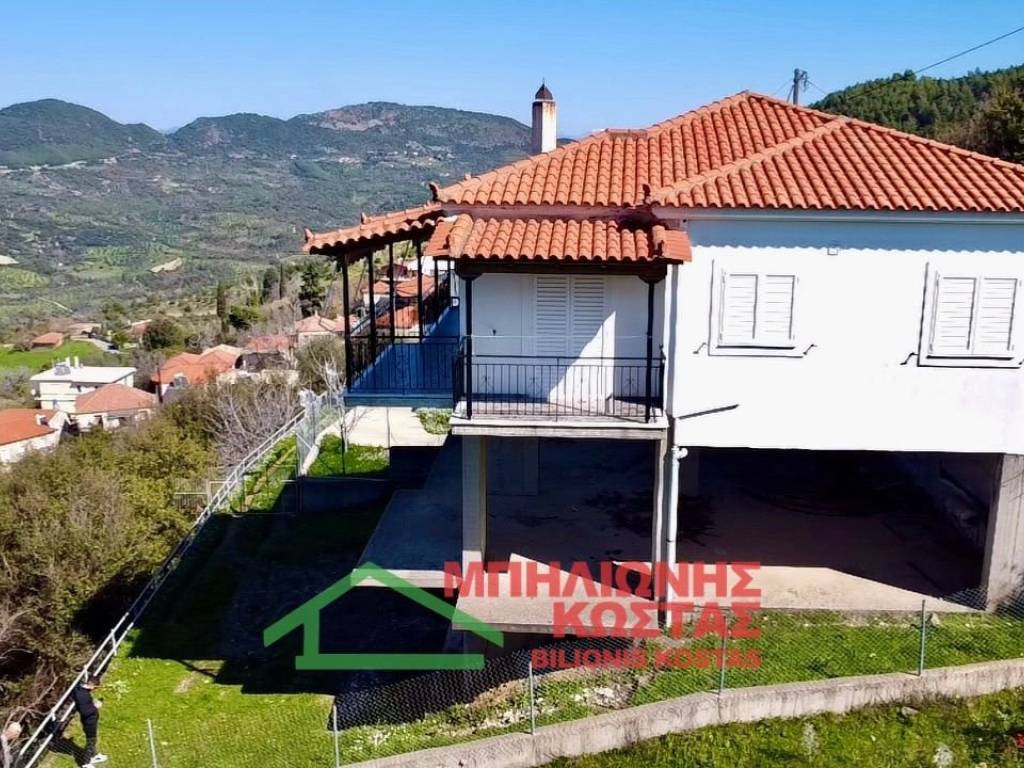 Detached House 199 sq.m. with Panoramic Views in Milea, Ilia For sale a two storey detached house of total surface 199 sq.m. on a 283 sq.m. plot in the mountainous village of Milea, Ilia. The building permit was issued in 2002 and the property features a tiled roof, offering durability and architectural harmony with the natural surroundings. The main residence is developed on the upper floor of 99 sq.m., accessed via an external staircase. Upon entering, there is a spacious and bright living room with fireplace, forming the central living area of the home. At the rear, the kitchen with dining area is arranged in an open layout, creating a functional and comfortable everyday living space. The entire living area communicates with a wide balcony equipped with awnings, offering unobstructed panoramic views of the lush green landscape, hills and open horizon. The elevated position of the property ensures privacy, openness and uninterrupted natural scenery, which is one of its strongest commercial advantages. To the left of the entrance, a hallway leads to two comfortable bedrooms and two bathrooms with WC. All rooms benefit from windows and natural daylight, ensuring excellent ventilation and brightness throughout the day. The house has infrastructure and the ability to connect an oil boiler. The ground floor, also 99 sq.m., is currently unfinished at concrete stage. This provides significant development potential, allowing the creation of a second independent residence, guest accommodation, rental unit or auxiliary spaces. Its completion can substantially increase the overall market value of the property. The plot has access via a concrete road directly connected to the main asphalt road of the village, ensuring easy year round accessibility. The outdoor area offers the possibility to landscape a garden, create outdoor seating areas or private parking. This property is suitable for permanent residence in a peaceful natural environment, as a holiday home with panoramic views, or as an investment opportunity with the prospect of developing two independent living units. Distances: 10 km from the sea 11 km from Lake Kaiafas 8 km from Zacharo, Ilia 13 km from Krestena, Ilia 17 km from Ancient Olympia, Ilia 31 km from Pyrgos, Ilia 30 km from Kyparissia, Messinia 69.5 km from Kyllini port 63 km from Kalamata, Messinia