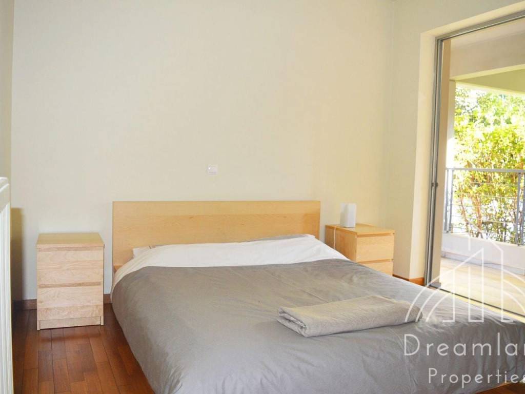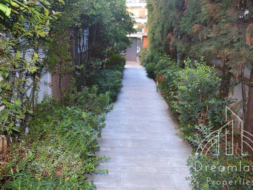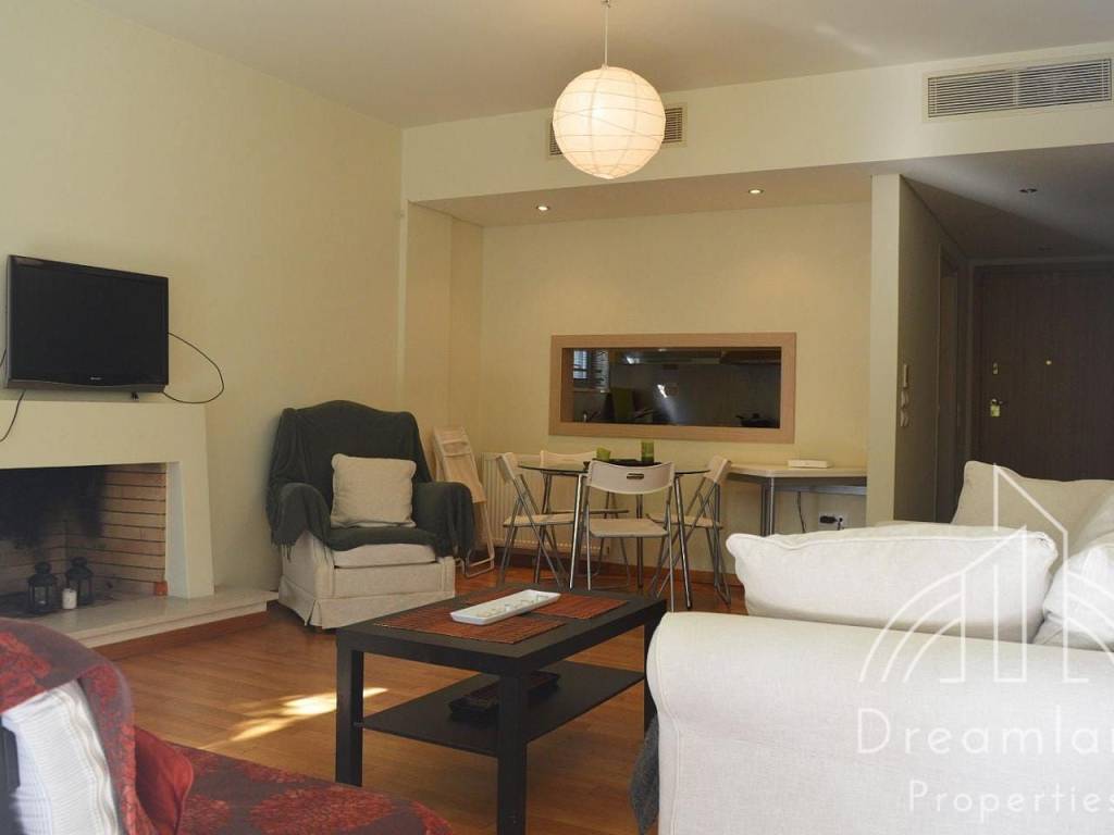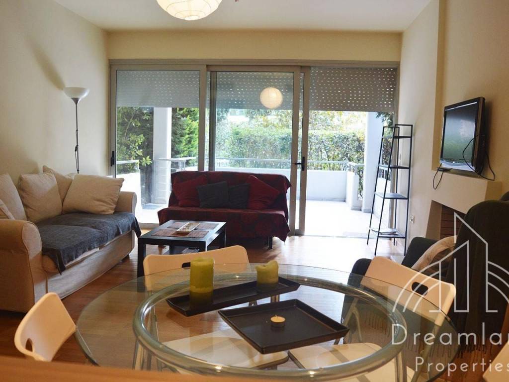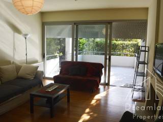 GLYFADA Center, Whole-Floor Apartment 90 sq.m., Ground Floor, 2 Bedrooms, '06 Construction, Bathroom, W.C., Autonomous Heating with Petrol, Air Conditioning, Fireplace, Security Door, Underground Parking Spot, Storage Unit, Garden, Excellent Condition, Wooden Floors Throughout the Apartment, Top Location, Central and Quiet Spot in the Center of Glyfada, Bright, Price 590.000 Euros (Listing code: 4153).