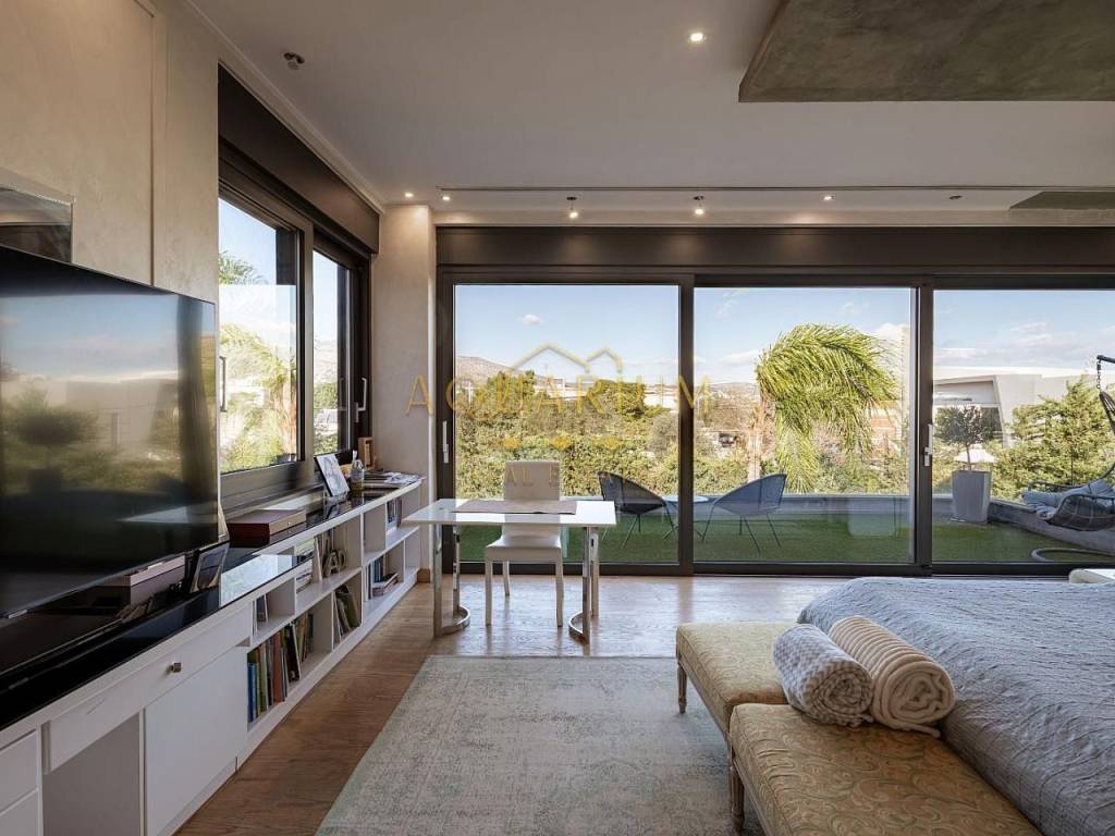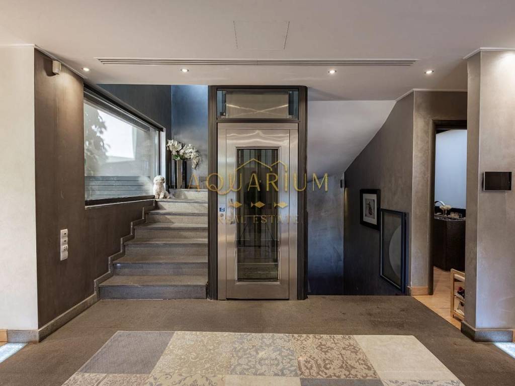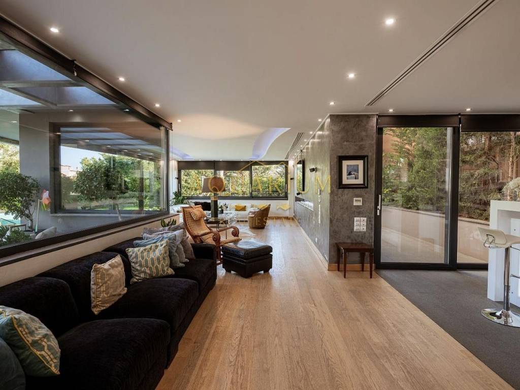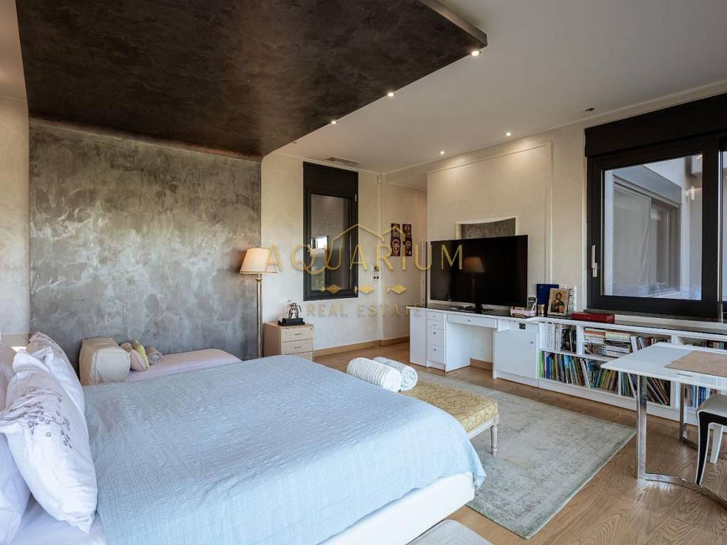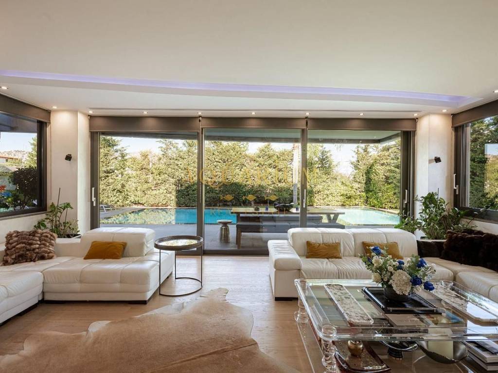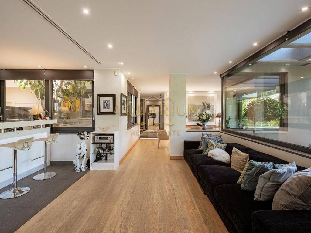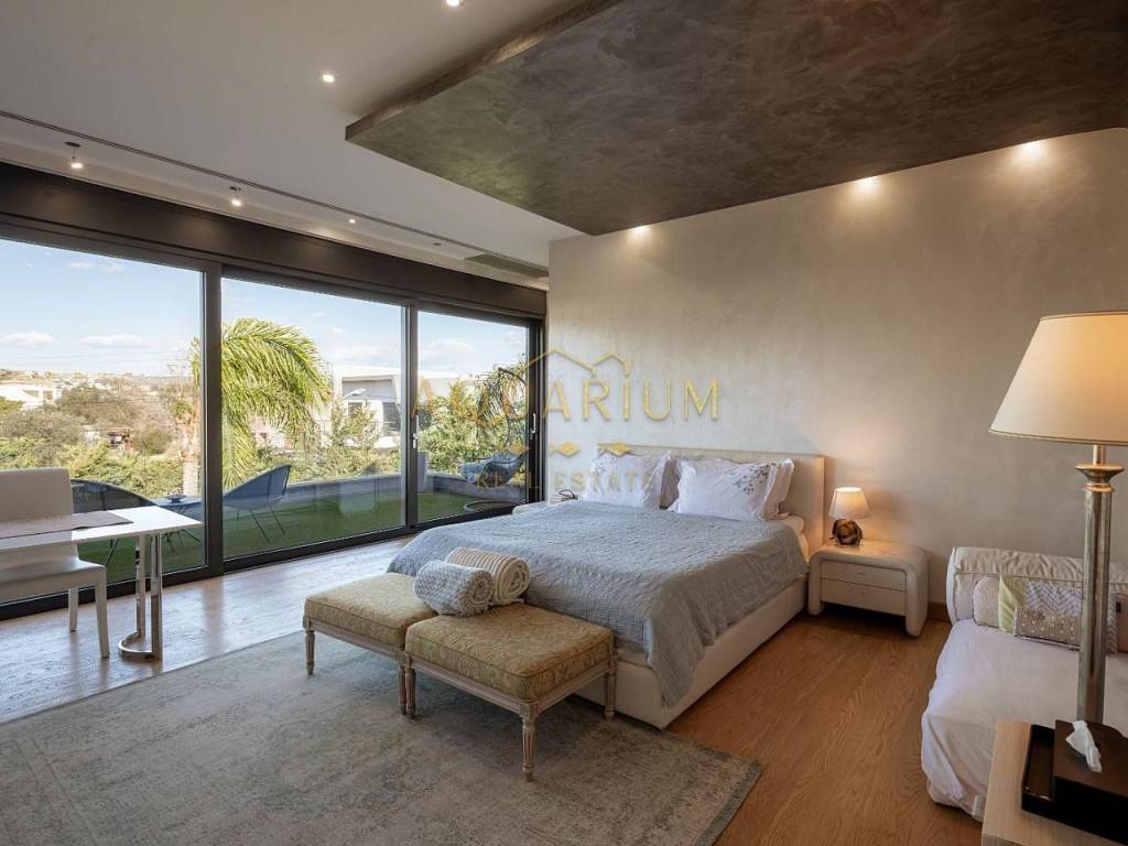 VARKIZA- Three-level villa 800 sq m. with swimming pool. Consists of: -Basement with 2 master bedrooms, office, home cinema, gym with glass on the pool, bathroom, 4 parking spaces, storage rooms, 2 patios that allow natural light, and a 2nd entrance that serves the pool. -Ground floor with reception area, living room, kitchen, dining room, bar, WC -1st floor with 1 large master bedroom with 2 walk in closets and a comfortable balcony, 2 more masters and 1 additional bedroom. It has a large courtyard with swimming pool and living room, internal elevator, and is available fully furnished and equipped. Located in a quiet area, just 3 minutes from the sea, and 2 minutes from the Center of Vari.
