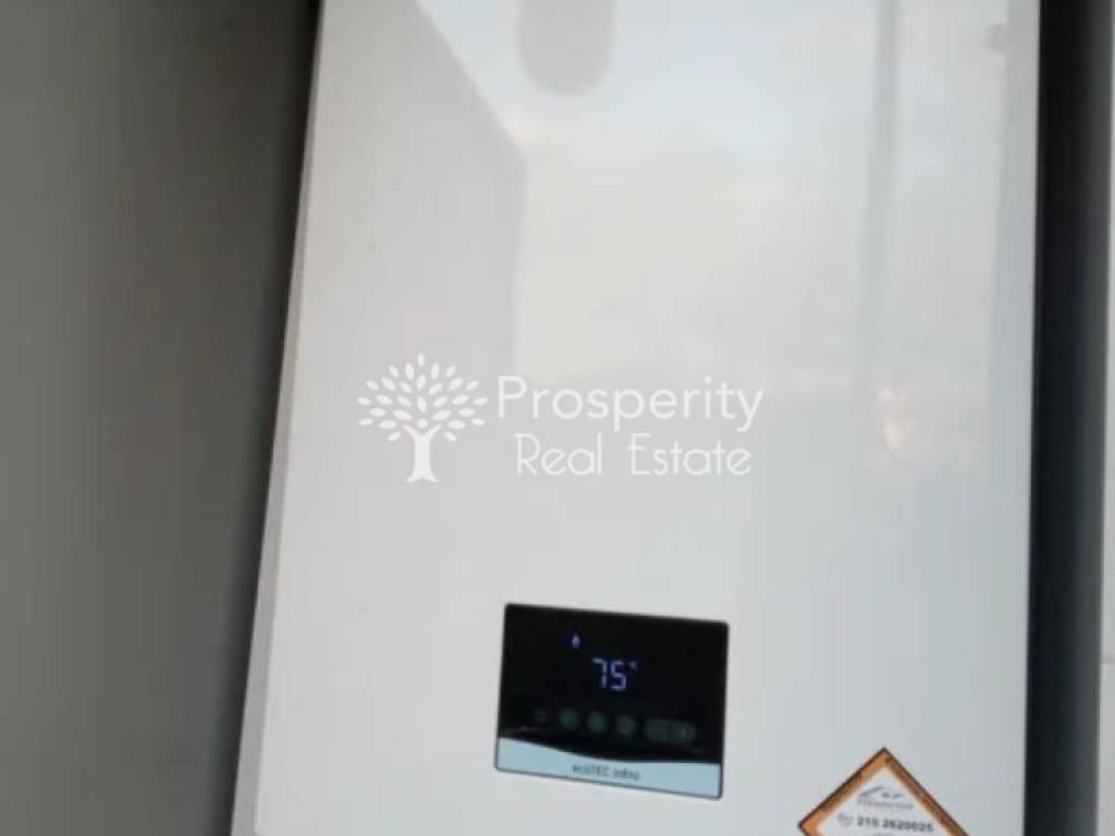Heating is autonomous natural gas with a new supply line, piping network, and radiators, while natural gas also provides hot water throughout the year. In addition, the apartment features two inverter air-conditioning units, a solar water heater, awnings, and enhanced energy efficiency due to its position within the building.