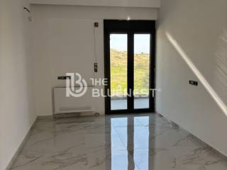 Upon entering, you are welcomed into a bright and spacious living room. On the left is a separate kitchen with storage space, offering practicality and convenience. The ground floor also includes a bedroom with a built-in wardrobe and a balcony overlooking the open horizon.