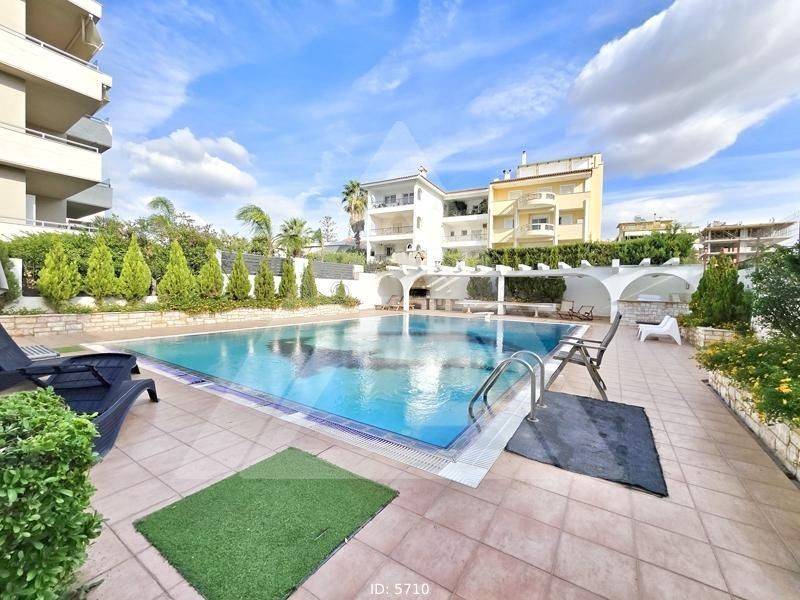 Voula, Kalymniotika - Apartment 104sqm bedrooms 3, levels 1, 2nd, excellent condition, year built 1998, energy class C, living room, kitchen, bathroom, wc, heating type: autonomous (oil), parking covered, quiet, dual aspect apartment, luminous, corner, frontage, storage space 9sqm, solar heater, fireplace, balconies, large balconies, balcony 25sqm, tents, elevator, garden, built in appliances, aluminum frames, double glazed windows, wood & tile floors, separate kitchen, secure door, alarm, video doorbell, swimming pool, residential zone, southern orientation, access from asphalt, close to bus stop (up to 100m), close to sea (up to 1000m).