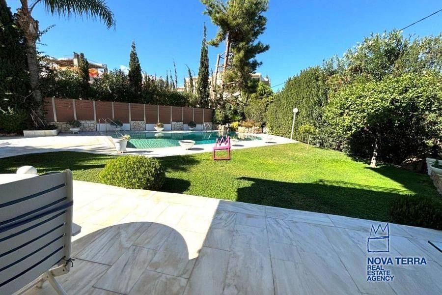 Luxury House for Sale in Voula - Pigadakia, 640 sq.m on a 1100 sq.m plot, built in 2000. Features 5 bedrooms, balcony, 5 bathrooms, fire place, garden, kitchen, living room, swimming pool, and more. Includes 5 master bedrooms with marble and wooden flooring, air conditioning, oil heating, and floor heating. Security features such as alarm system and security door. Parking area with garage for 2 cars. Energy class A. Pets allowed. Property ID: 51119. Visit www.nova-terra.gr for more information.