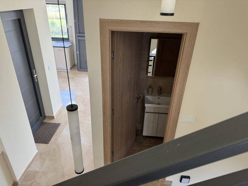 On the ground floor there is a bright open-plan living room with kitchen. Large doors lead to a spacious balcony with views to the olive groves, mountains and the sea. There is also a guest WC on this level. The lower level includes two bedrooms, both with direct access to the backyard. On this floor there is also a bathroom with a walk-in shower.