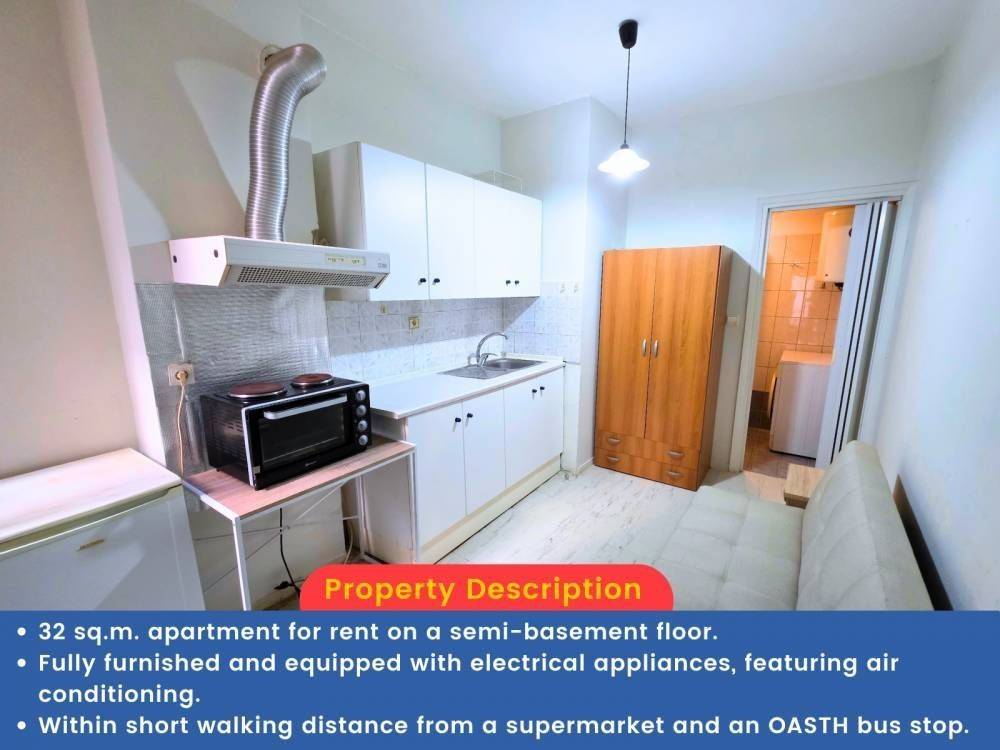 An apartment is available for rent on a semi-basement floor, rear-facing, in the area of Charilaou, near the intersection of 25th Martiou and Papanastasiou. It is a practical option for a student or employee.