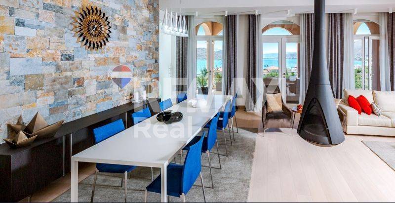 A three-level luxury villa is available for sale in the area of ​​Elounda, Lasithi. It is an independent residence with a total covered area of ​​642m2 on a plot area of ​​4014 m2. On the first level there are 3 bedrooms, 3 bathrooms, a single living room-kitchen area, and storage space. The second level has a spacious hall, modern kitchen, living room - dining room with fireplace, 2 bedrooms, 2 bathrooms, 1 WC . The third level has 1 master bedroom with its own bathroom, with unlimited views of the sea, the pool and the outdoor areas. of the property. The independent villa has been built with the best materials, is of modern construction and layout, has autonomous heating, solar, PVC frames, alarm, triple glazing, closed parking. The semi-outdoor area of ​​4014 m2 has an elevated swimming pool with an unlimited view to the sea, lawn. tree-planted garden, terrace with sitting area, just 130 meters from the sea. Also within the plot there is an independent apartment - guest house, with a single living room - kitchen, 1 bedroom and a bathroom. In front of the property there is a private beach with exclusive access. Suitable for any private or professional use.