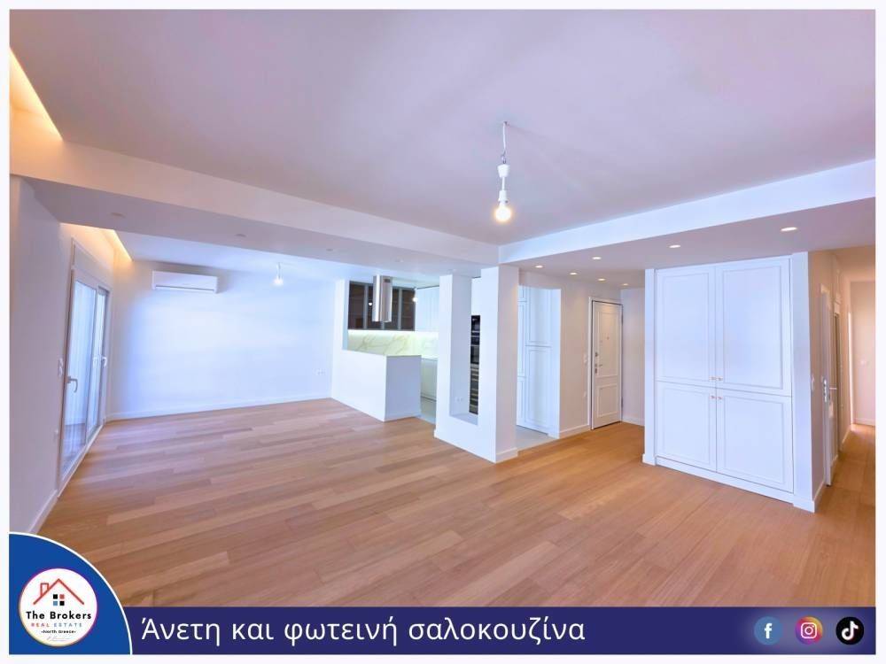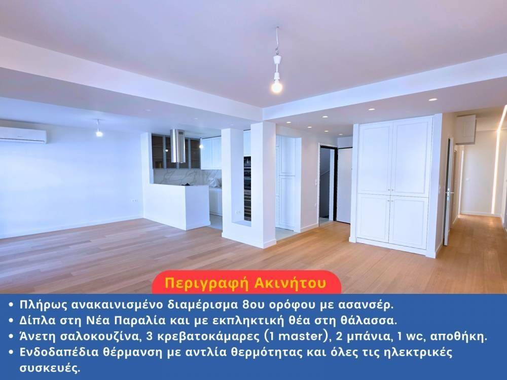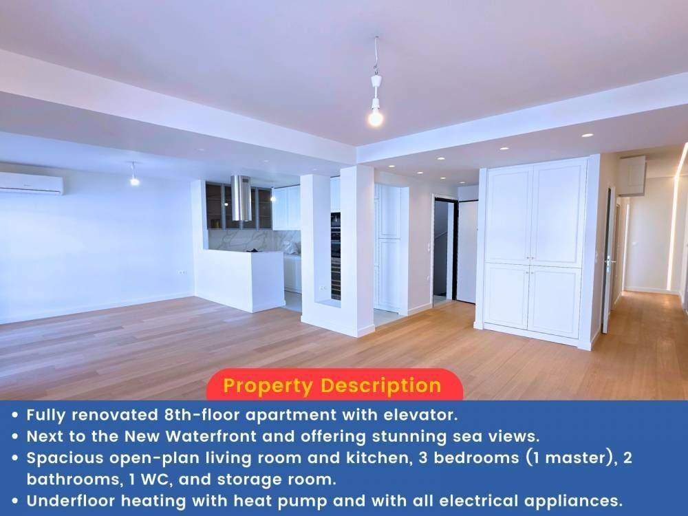 For sale an exceptional, bright 135 sq.m. apartment on the 8th and top floor of a residential building with elevator, radically and fully renovated, in a prime location of Thessaloniki, next to the sea.