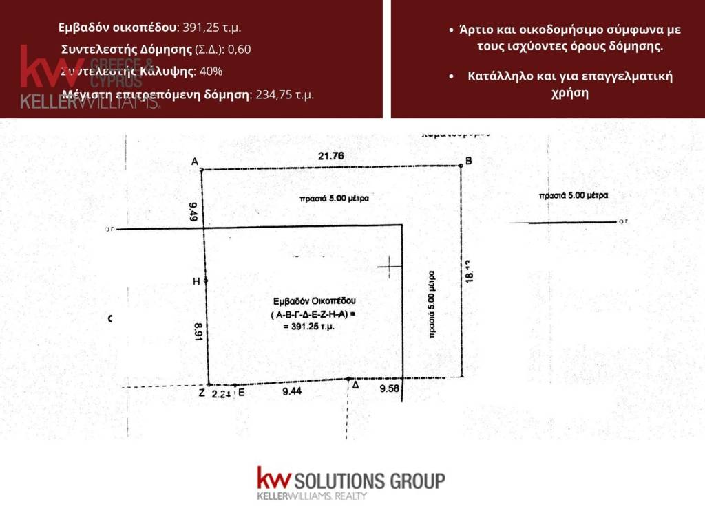 Exclusively managed by KW Solutions Group. A corner plot is available for sale in the area of Acharnes, located within a residential zone with General Residency land use, suitable for residential or commercial development. The plot has a total area of 391.25 sq.m., a frontage of 21.76 m and a depth of 18.33 m, offering highly functional geometry and ease of development. Regarding the urban planning characteristics, the Building Factor is 0.60, the Coverage Ratio is 40%, the Maximum Buildable Area is 234.75 sq.m. and the Maximum Allowed Coverage is 156.50 sq.m. The property is a corner lot with excellent accessibility, situated in a developing residential area, making it ideal for the construction of a private residence, commercial premises, or investment purposes. It represents an exceptional choice for those seeking a plot with clear building terms and immediate development potential in a prime location of Acharnes. For more information: KW Solutions Group, tel.: 2130414087, email: info@solutionsgroup.gr. Necessary for the indication of the property is the presentation of the police ID or passport of ALL those who wish to see the property, before signing (by all) the relevant Indication Order. Finally, ask our Consultant about the Renovation possibilities and the advantages that our group company, "Resolutions - Renovations" offers you. See more on our main site: https://solutionsgroup.gr/