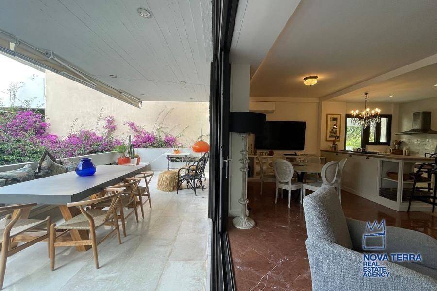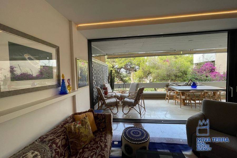 VOULIAGMENI - KENTRO, Apartment,, Rental, 80 sq.m, year built 1990, renovated in 2022, 2 rooms, Ground Floor, Elevated, View: Woodland, Various Characteristics: Balcony, Bath, Furnished, Kitchen, Living room, Refurbished, Flooring: Tile, Heating: Air Conditioning, Access road, Aluminium panels, Bright, Luxury, Painted, Residential area, Security Door, Tents, Energy class: C. property ID: 48109, www.nova-terra.gr