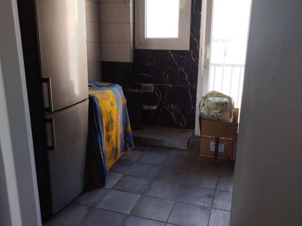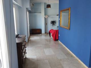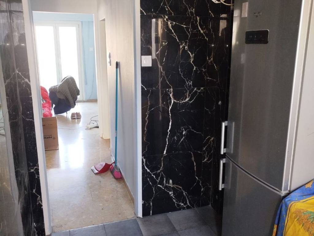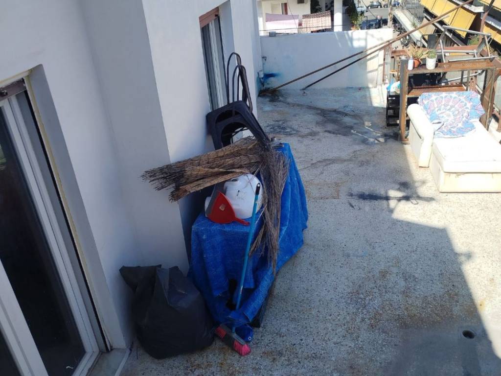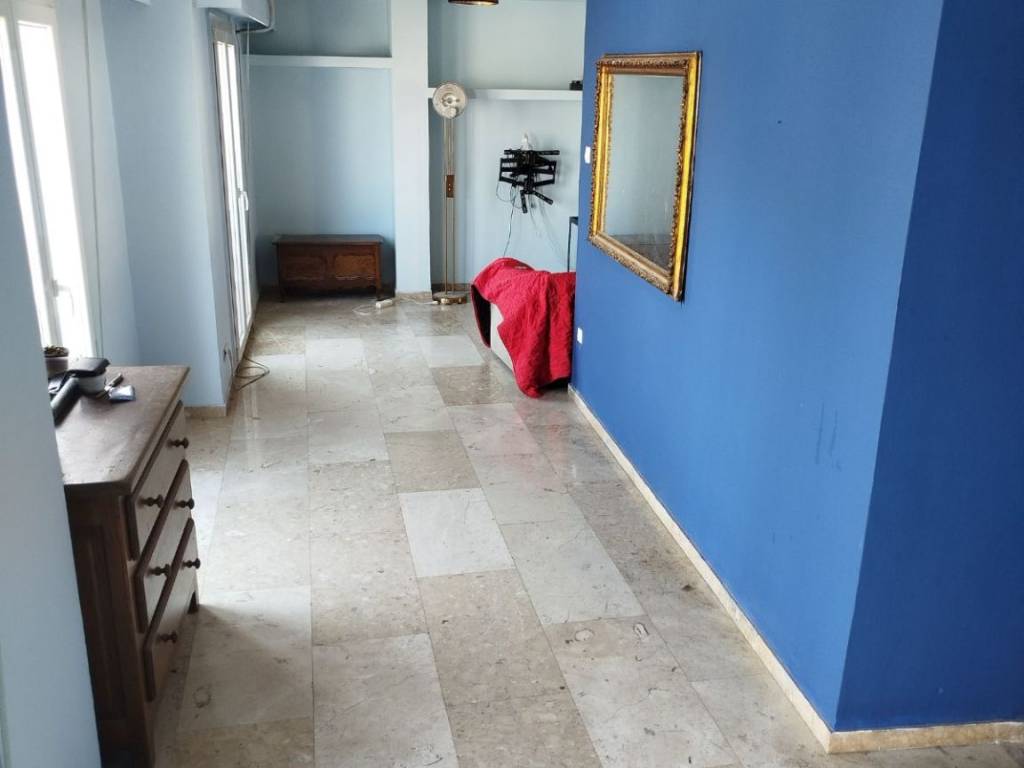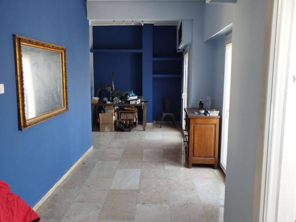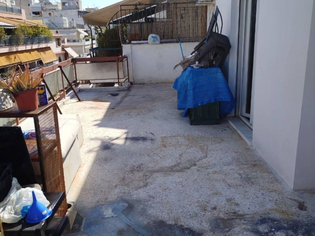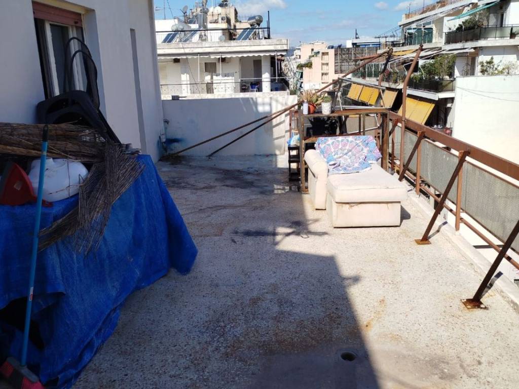 Kallithea Tzitzifies area 4th floor 91m2 and 39m2 balcony/tarasa 2 bedrooms 1 toilet(possible 2) 1 bathroom 1 kitchen Security door All windows and door new Safe area Sun from morning to 3 oclock on this huge balcony Small expences/month Need renovation Possibility to make 2 flats of 45m2 plus 2 access of tarassa(20 m2 each) Airbnb or rent ,also for personal use