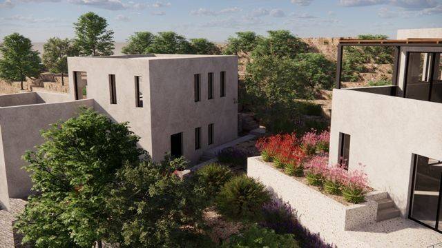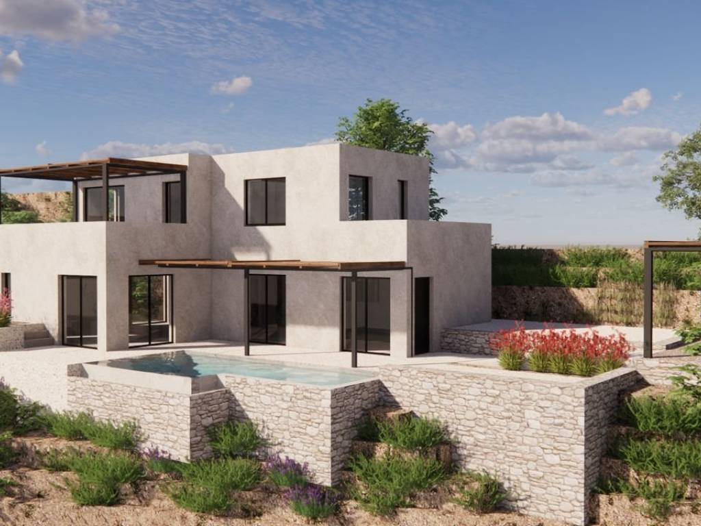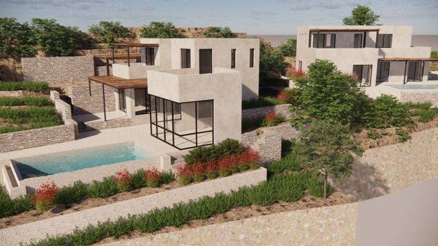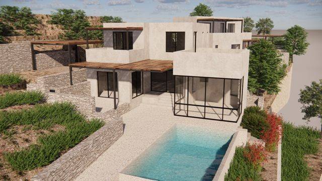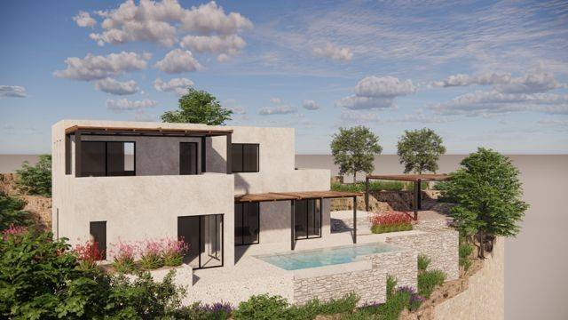 A plot of land is available for sale with a valid building permit for the construction of two modern detached houses with lofts and private swimming pools, located in a privileged setting offering unlimited panoramic views of the Messinian Gulf. The property represents an excellent opportunity both for private use and for investment purposes. The first residence has a total area of 67.46 sq.m. The ground floor includes one bedroom with an en-suite bathroom, a separate living room area, and a kitchen space. An internal staircase leads to the loft, where two bedrooms and two bathrooms are planned. The property also includes a 20 sq.m. basement, which can be used as a storage or auxiliary space. In the outdoor area, a private swimming pool of 30 sq.m. is designed, creating an ideal space for relaxation while enjoying the sea view. The second residence has a total area of 79.08 sq.m. The ground floor features two bedrooms with three bathrooms, along with an open-plan kitchen and living area. An internal staircase leads to the loft, which includes two additional bedrooms and two bathrooms. The residence also offers a 22.71 sq.m. basement, suitable for storage or auxiliary use. The outdoor area includes a private swimming pool of 21.56 sq.m., ideal for outdoor living and leisure. The unique location and the unobstructed panoramic views of the Messinian Gulf make this property a particularly attractive opportunity for those seeking a high-quality residence in a beautiful coastal environment.