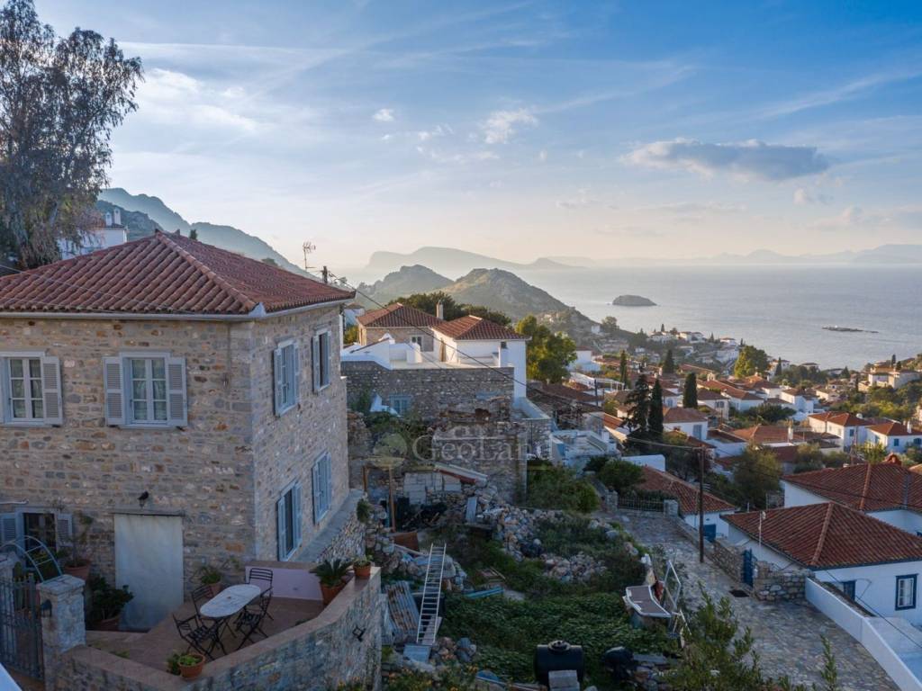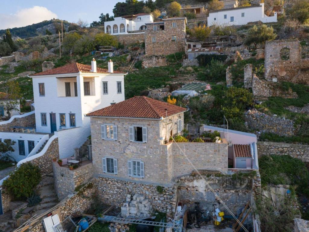 A newly stone built house situated high in Hydra town having panoramic sea views and across to the Peloponnese. Sereti house is only 13 years old, classic in style throughout and is fitted with all modern conveniences. The ground floor has two entrances, one being through an outside courtyard to the side of the property or internally by the staircase. The courtyard is particularly shady and ideal for afternoon relaxing. The ground floor consists of 3 bedrooms, one double, one with 2 singles and the third at present being used as another small living area. There is also a large bathroom and a second WC under the staircase. The first floor can be accessed towards the back of the property from the main pathway through a lovely veranda where the views of Hydra are spectacular! This floor is open plan with kitchen and living room. There is also a fireplace. The roof is open and made in traditional style with wooden beams. The floors are laid with ceramic tiles throughout. A house situated in a quiet neighborhood having stunning views and mountainside towards the rear. Ready to move into.