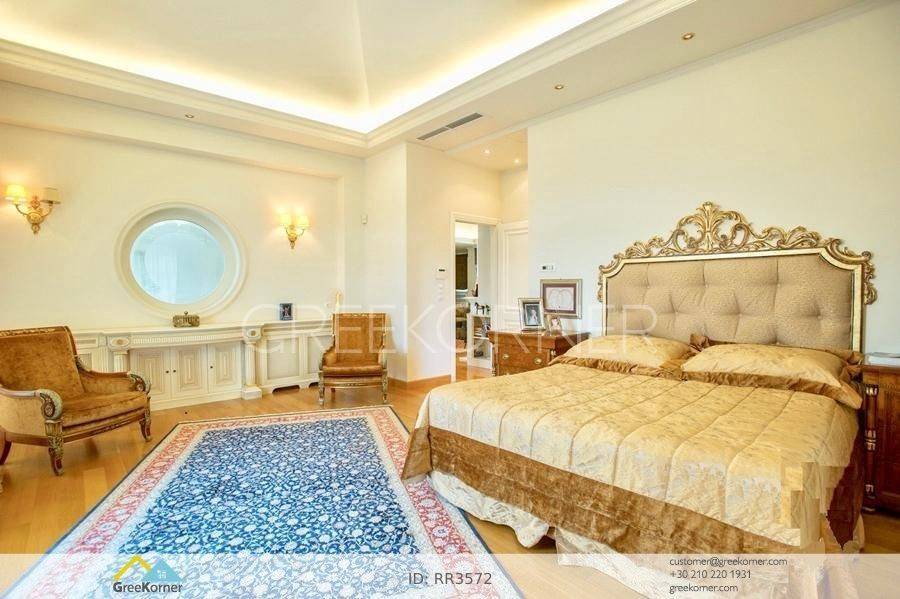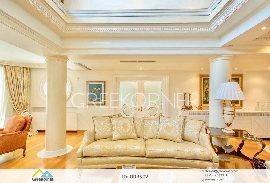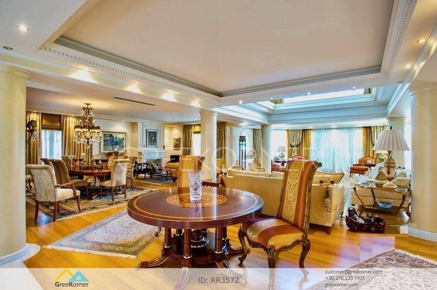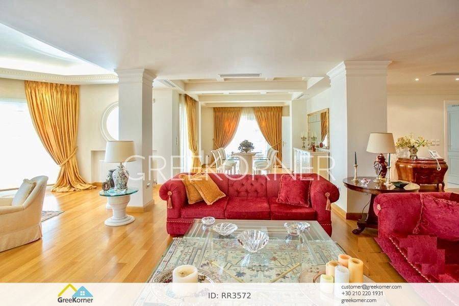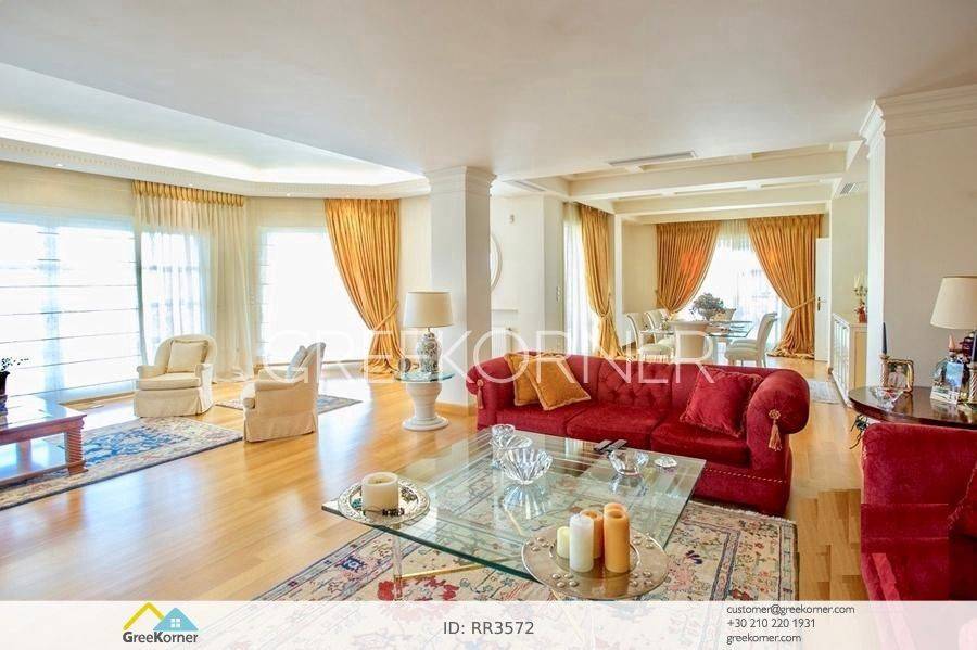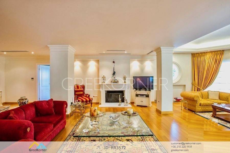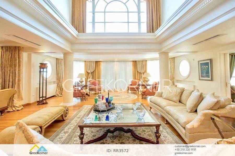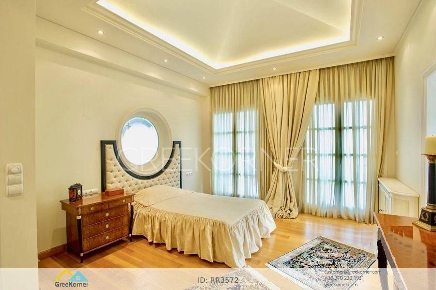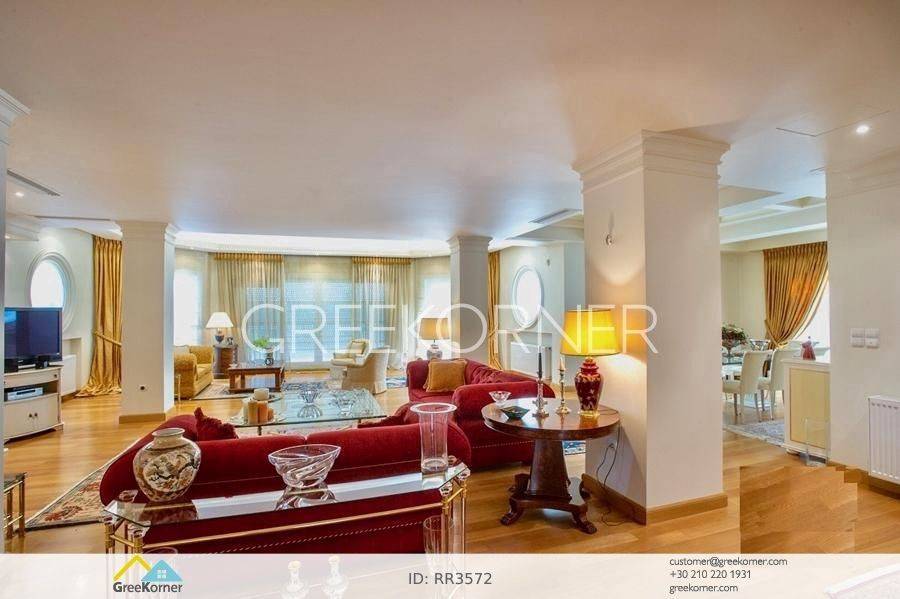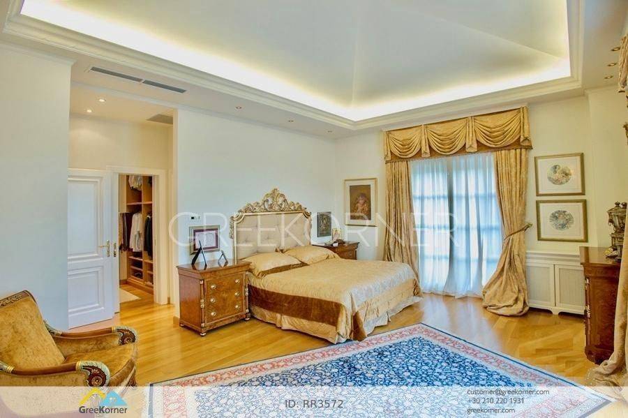 with an impressive heated pool and unobstructed views of the Mesogeia plain and the surrounding hills to the airport, even through the house. Passing through the impressive entrance with the large, double door, we enter the foyer and meet the living and dining areas which, in conjunction with the double height of the patio, gains the impression. It has 7 bedrooms suites with their respective bathrooms, guest WC, 2 kitchens, reception areas with fireplace, office, while in the basement there is an independent apartment and plenty of auxiliary spaces. The house also has a gym, hydro massage, closed garage, autonomous heating and VRV air conditioning and drilling. The verdant landscaped garden is ideal for large-scale entertainment, banquets, parties etc.