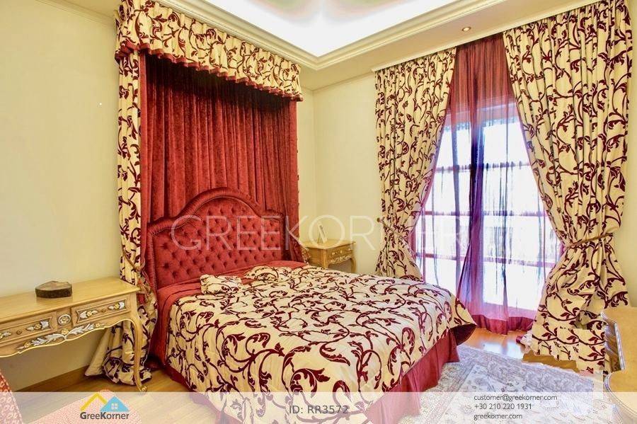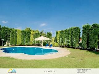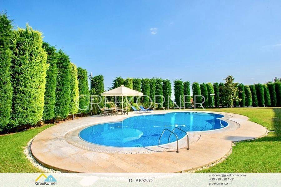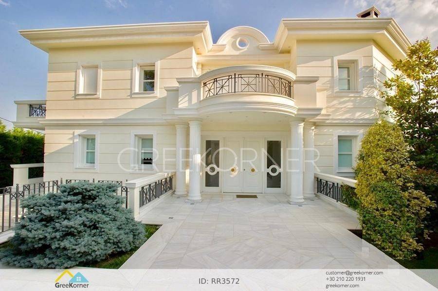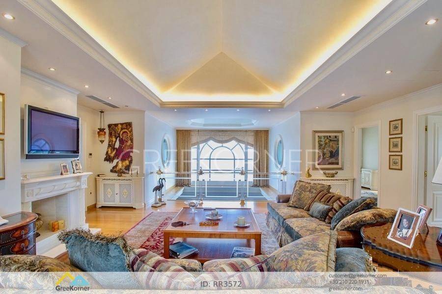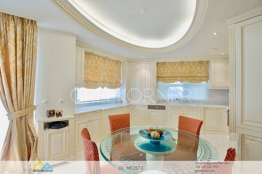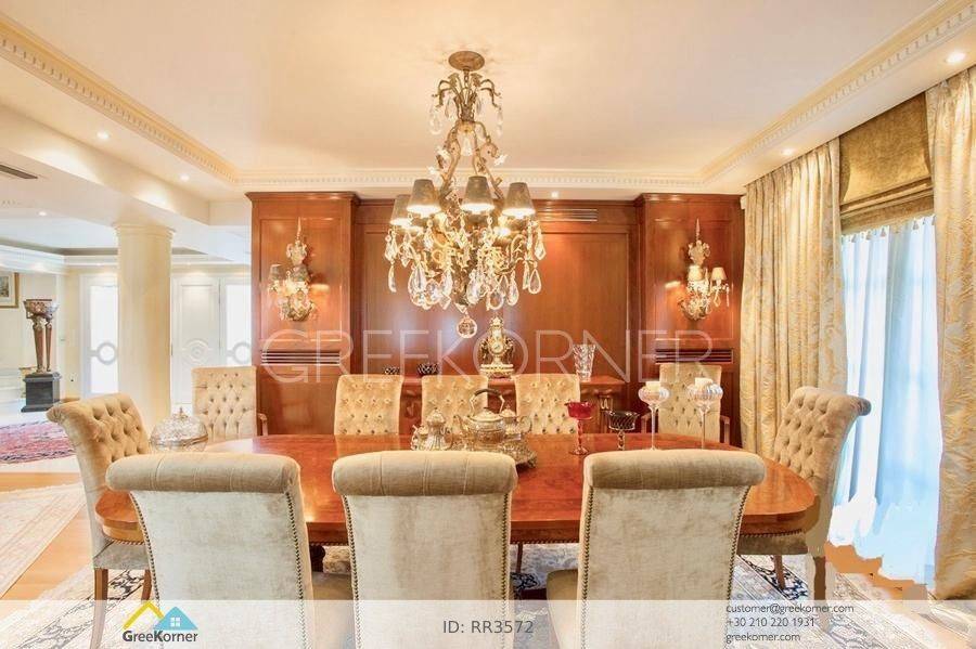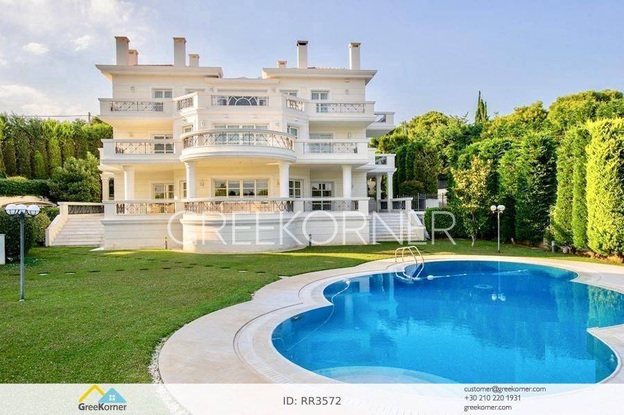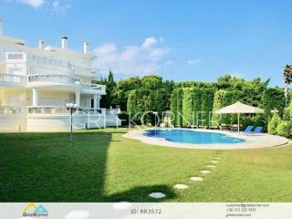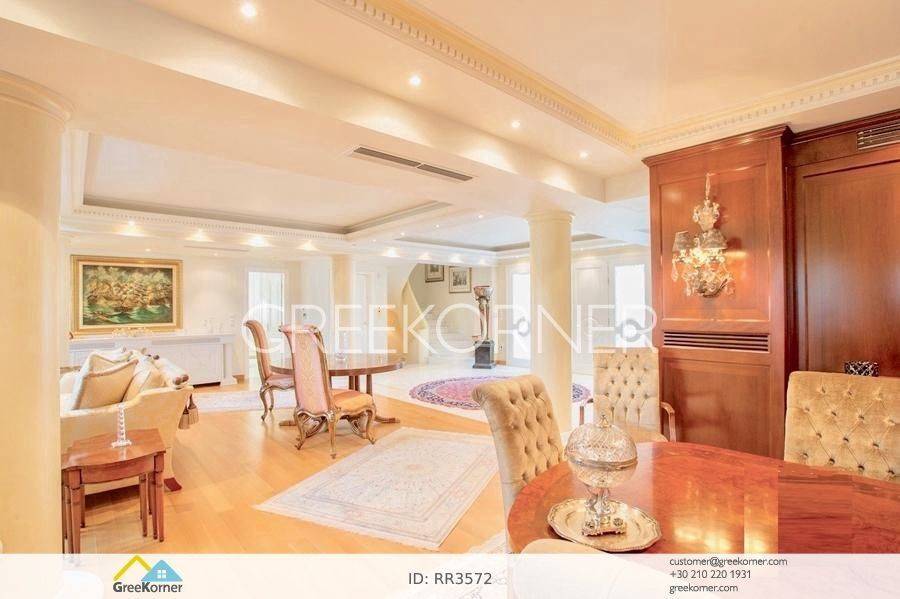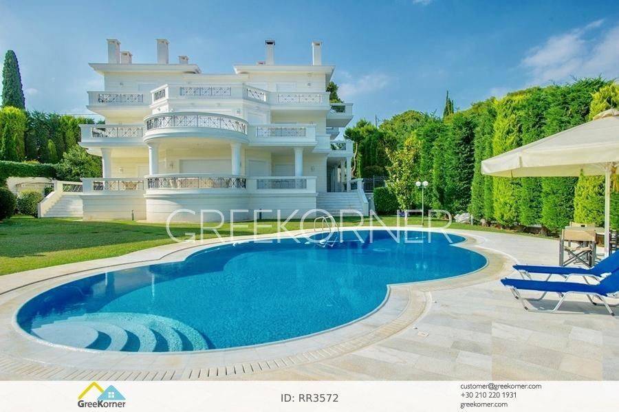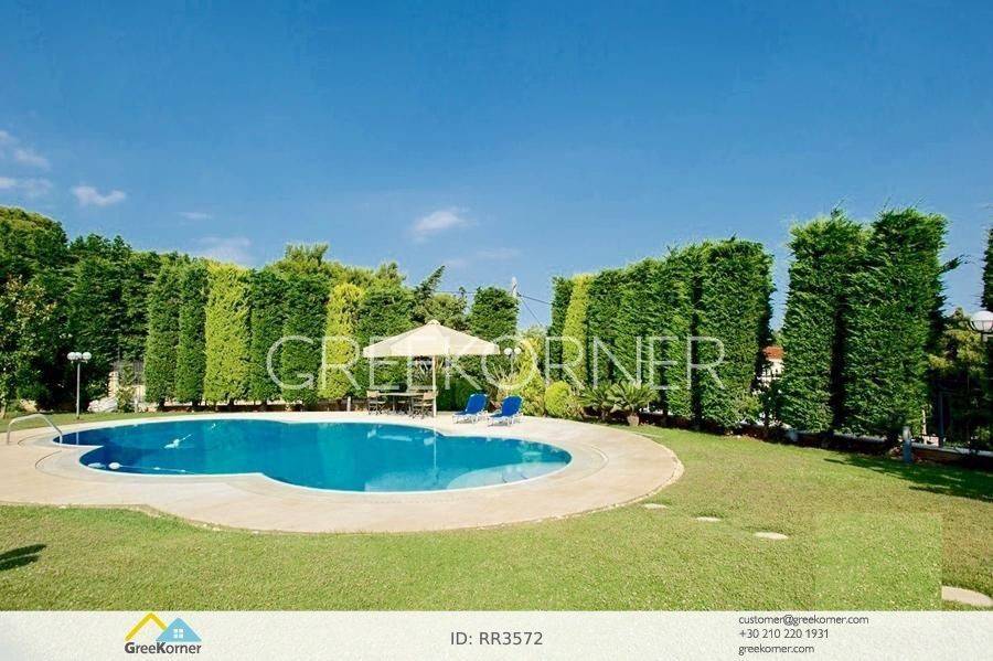 with an impressive heated pool and unobstructed views of the Mesogeia plain and the surrounding hills to the airport, even through the house. Passing through the impressive entrance with the large, double door, we enter the foyer and meet the living and dining areas which, in conjunction with the double height of the patio, gains the impression. It has 7 bedrooms suites with their respective bathrooms, guest WC, 2 kitchens, reception areas with fireplace, office, while in the basement there is an independent apartment and plenty of auxiliary spaces. The house also has a gym, hydro massage, closed garage, autonomous heating and VRV air conditioning and drilling. The verdant landscaped garden is ideal for large-scale entertainment, banquets, parties etc.