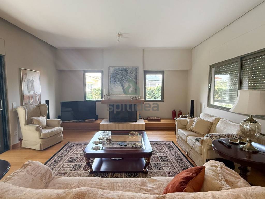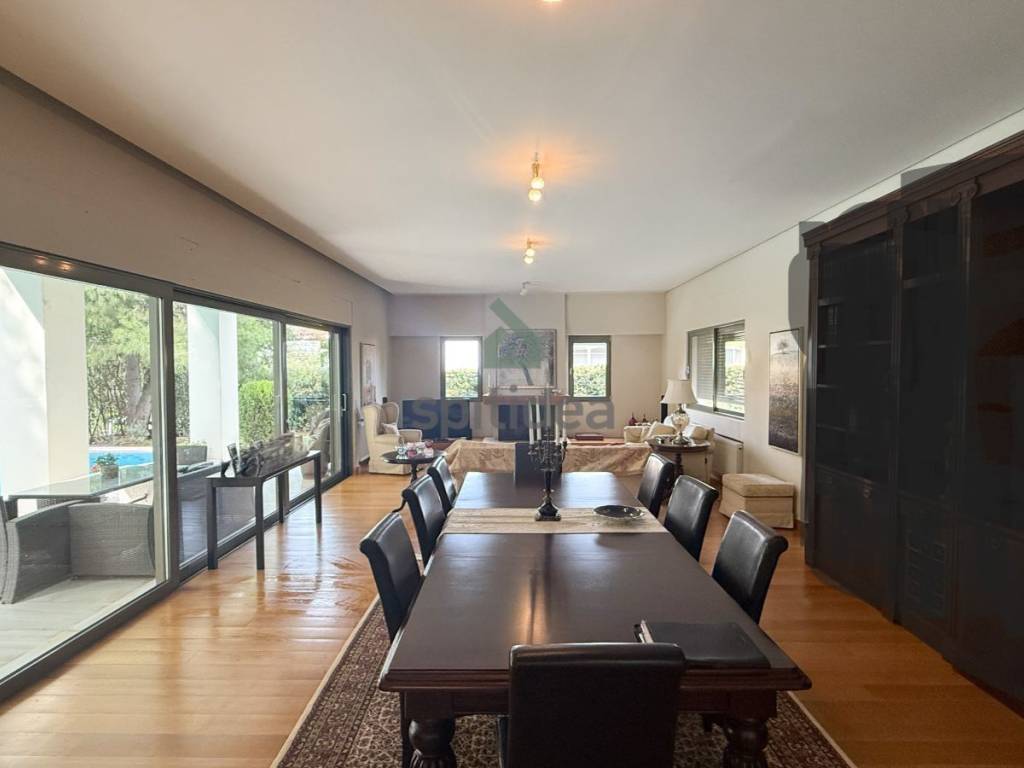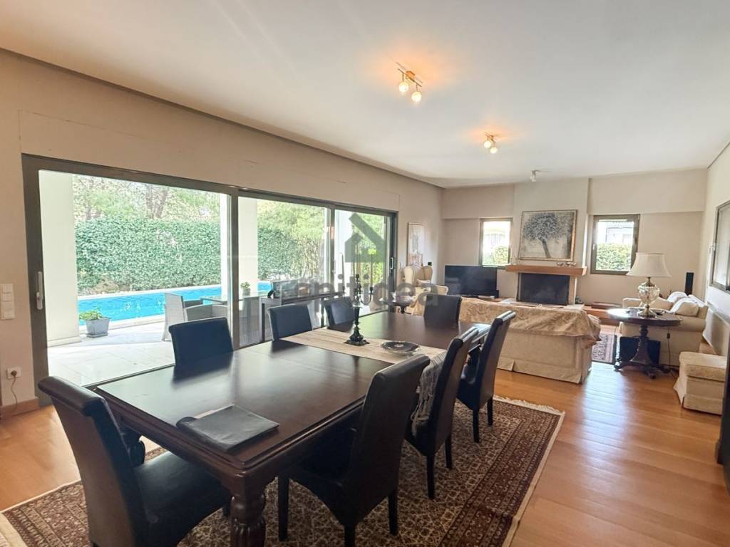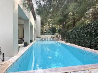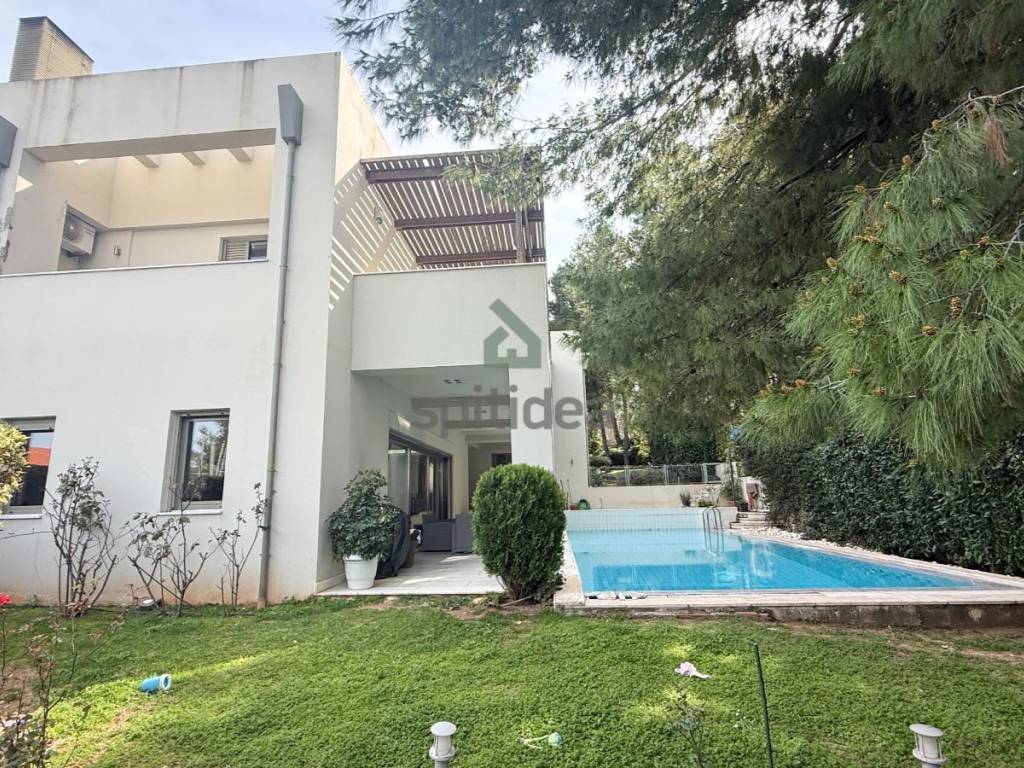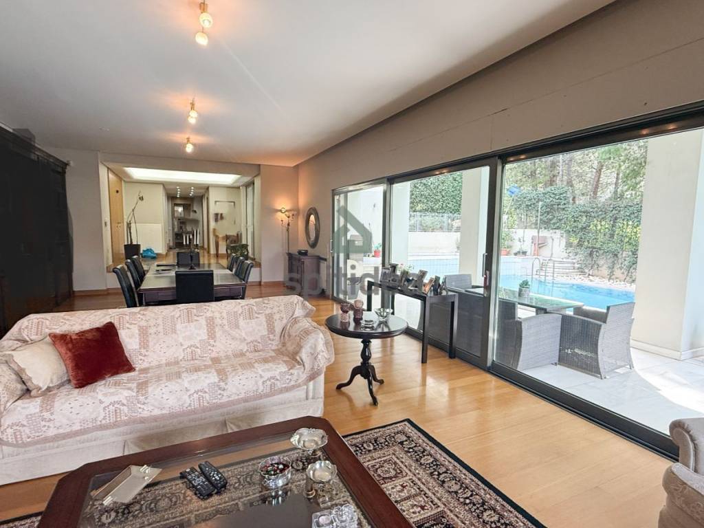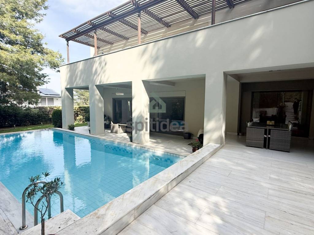 This is an excellently constructed detached house with a total area of ​​530sqm. It is divided into 3 levels which are arranged as follows: On the ground floor of 150sqm there is a large living room with fireplace, dining area, separate kitchen, one bedroom and bathroom. From the living room and kitchen we exit to a beautiful landscaped area - a terrace with a swimming pool of 60sqm and a large garden of a total area of ​​300sqm. We go up to the 1st floor of 146sqm with an internal staircase and an elevator where there are 4 master bedrooms with their own bathroom, verandas around all rooms with a view of the garden and the pool. Finally, in the semi-basement of 235sqm there is a large area with wardrobes, 2 bedrooms - a playroom with their own bathroom, storage rooms, a boiler room and 3 closed parking spaces. It has aluminum frames with double glazing and screens, electric shutters, wooden oak floors in almost all areas, individual oil heating per level, 60sqm swimming pool, 300sqm garden, alarm. It is located in a very nice and quiet neighborhood.