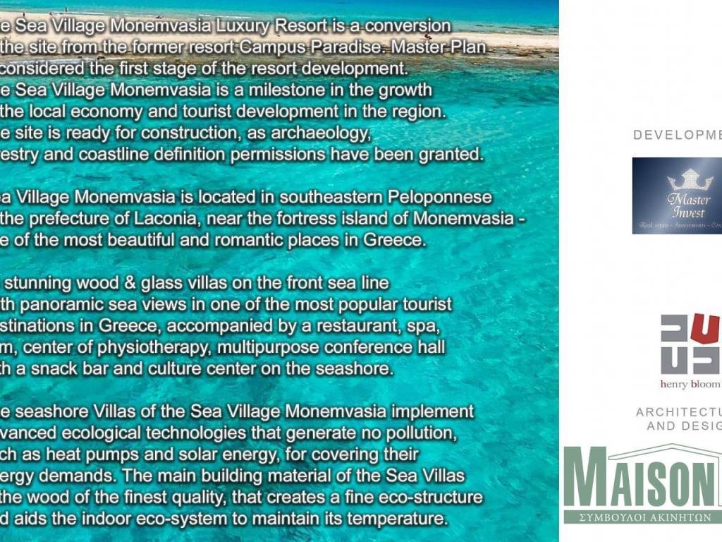 Monemvasia, seaside area with the possibility of Erecting SEA VILLAGE LUXURY VILLAS BOUTIQUE HOTEL, 18 modern villas made of wood & glass, private pools & in front of the sea. The complex has a restaurant, snack bar room, physiotherapy center, SPA, gym, ecological farm , etc.. The total area is 17,174 square meters on four levels. The complex consists of houses of modern architecture, 14 of which are with 3 bedrooms (maisonettes of 183.6 square meters of total area, 1 master bedroom, wooden floors, with balconies, wc, 2 bathrooms, living room, dining room, kitchen, private swimming pool, garden, bbq, parking spaces), and 4 with 4 bedrooms (maisonettes of 215 sq m total area, 1 master bedroom with sea view, 7 m private swimming pool, wooden floors, balconies, wc, bathrooms, living room, dining room, kitchen, garden, bbq, parking spaces).Energy class A+, property code: 16452, www.maison-estate.gr