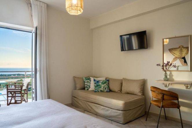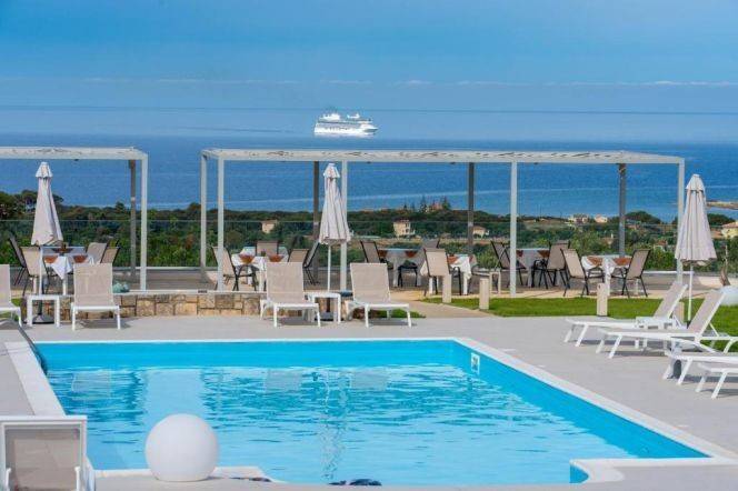 views of the sea and the spectacular sunsets of the Ionian Sea. The location of