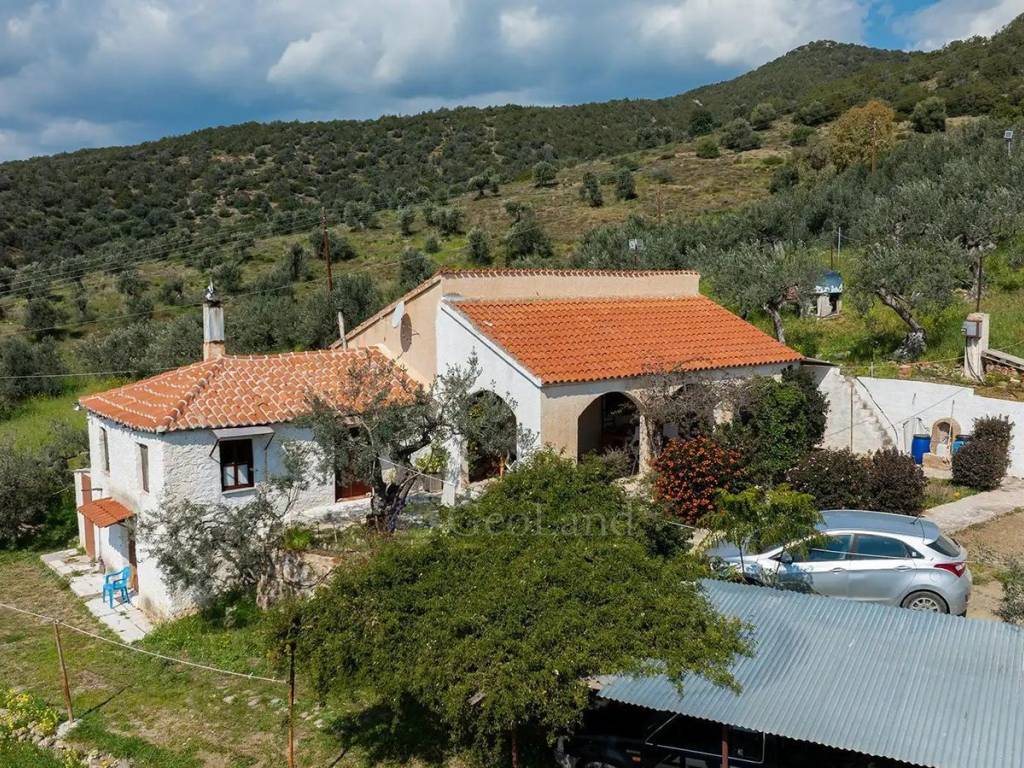 For sale, an old detached house of 128 sq.m. in good condition, located in the Achladitsa Kiafa area of Ermioni, built on a rare plot of 34,471 sq.m. that offers complete privacy, unlimited views, and high agricultural productivity. The main residence on the ground floor consists of a spacious and bright living room with dining area, a separate kitchen, two bedrooms, and one bathroom. On a lower level, there is an additional bedroom with its own external bathroom and a cellar, offering independence to its occupants. The land plot represents an excellent investment opportunity, as it includes 550 productive olive trees, two boreholes, and a well, ensuring full water autonomy, as well as a large storage/workshop space with a 24 sq.m. loft. Additionally, there is the possibility to build approximately another 300 sq.m., making the property ideal for further development or tourist exploitation.