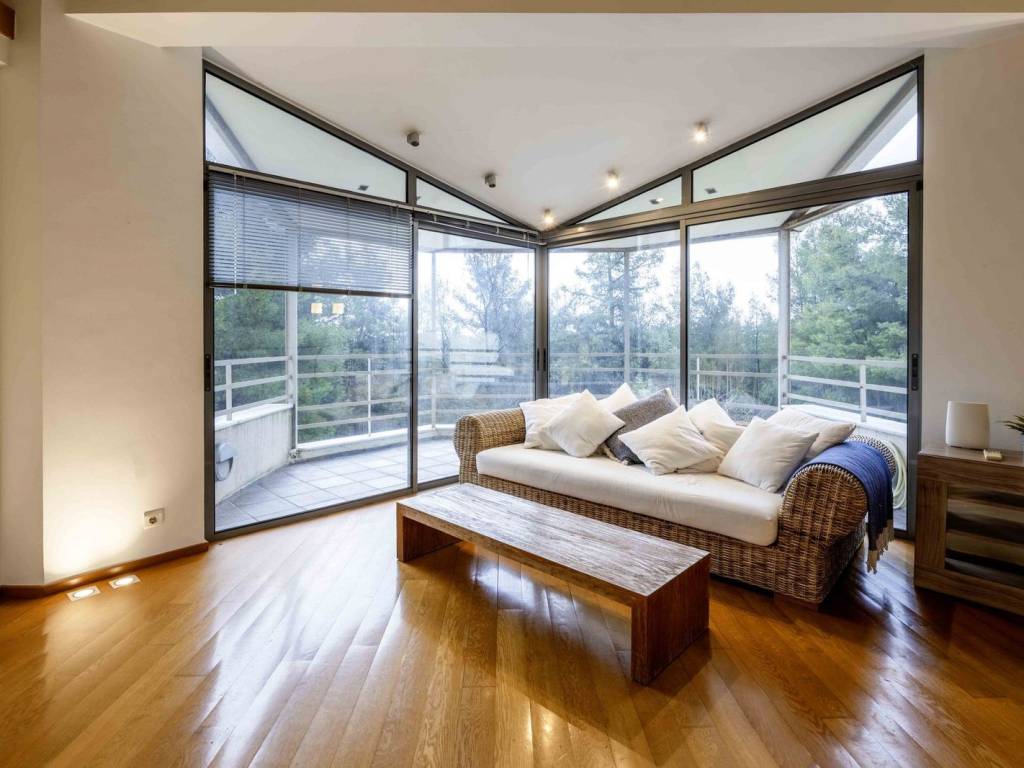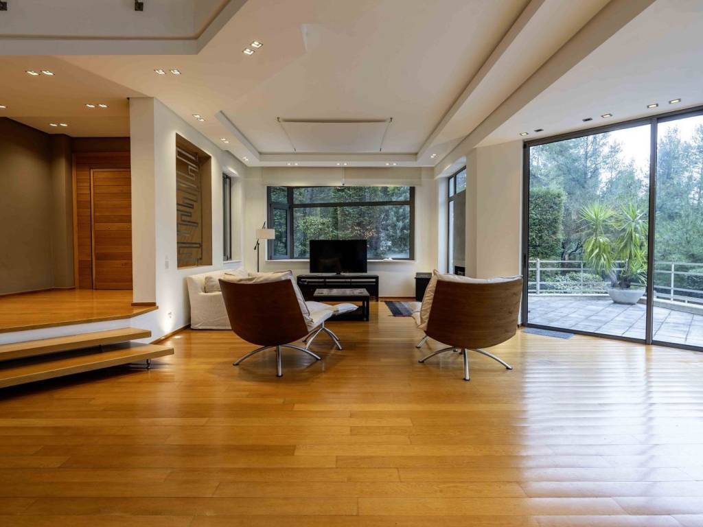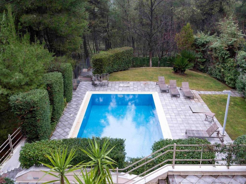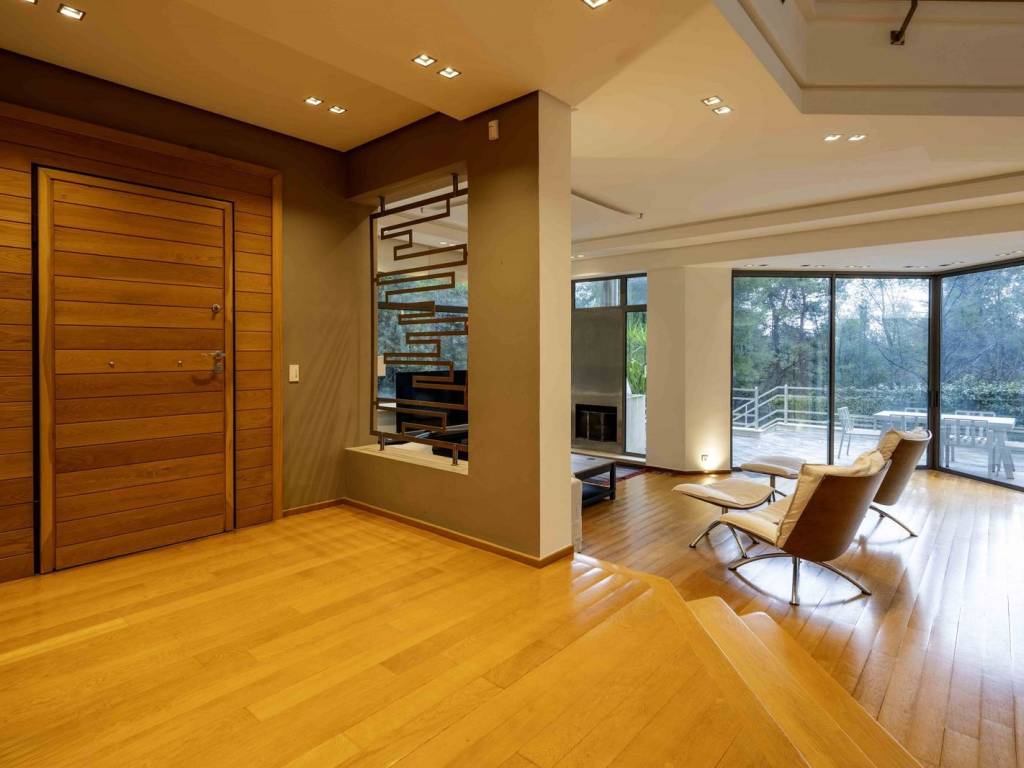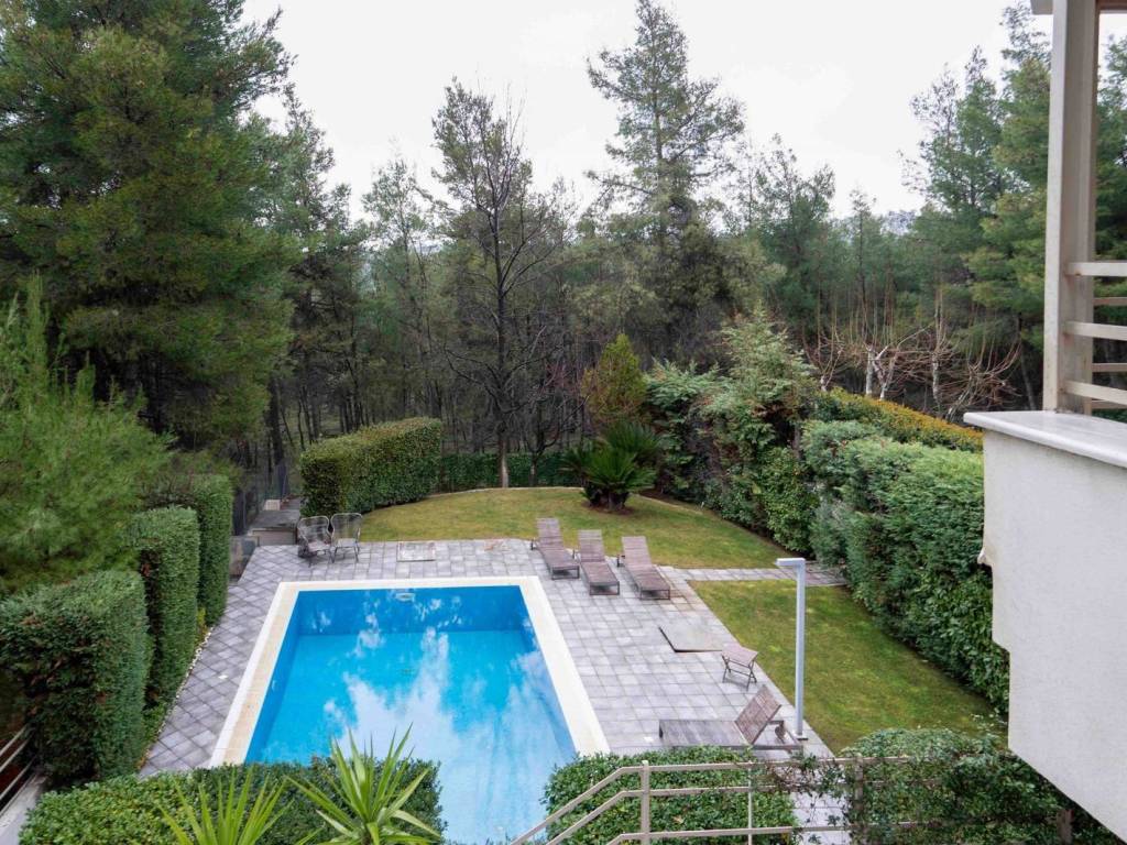This impressive semi-detached residence, featuring modern and high-end design, offers luxury and comfort in every corner. On the ground floor, you will find a spacious living room that seamlessly connects with the dining area, offering spectacular views of the garden and pool. The kitchen is fully equipped, and there is a functional office, as well as a guest WC. The first floor includes three large bedrooms, each with its own en suite bathroom, and a cozy living area for daily relaxation. The attic, located one level above, provides a tranquil and versatile space. On the semi-basement level, there is a large playroom with an independent entrance and direct access to the garden, as well as a fully equipped guest room with its own bathroom. Additionally, there is a service room with a bathroom, a laundry room, storage space, and a two parking bay garage. An elevator that serves the three main floors of the residence connects all levels. Every room in the house is bathed in natural light throughout the day and offers uninterrupted views of the garden. The 8x5m pool features an electrolysis salt cleaning system, is optionally heated, includes a counter-current swimming system and a fire extinguisher system. The home is equipped with a heat pump for underfloor heating and independent thermostats for each floor and room. The reception areas are fitted with an Instabus lighting system, while the smart security system includes an alarm and cameras. The garage features a heated ramp, and in the garden, there is a heated pet house, making the residence both highly functional and pet-friendly. The residence is perfect for families, offering versatile spaces, a large garden, and a swimming pool, ideal for outdoor activities and relaxation. Its location is ideal for nature lovers, providing easy access to mountain trekking and cycling trails, allowing residents to enjoy a healthy and active lifestyle surrounded by nature. The property is offered either furnished with high-design furniture or unfurnished. It will be available as of early May. Dionysos is located in NE Attica, in the first hills of the Penteliko Mountain, in a region with lush green surroundings, offering a totally unique and particular quality of life to its residents. It has a purely built-up character, with the presence of certain well-known cafes and restaurants in the wider region giving a cosmopolitan breeze in an admittedly very nice suburb. The settlement of Dionysos was created at the end of the 19th century, as a place of stay for the workers at the neighboring marble quarries of the Penteliko Mountain. It was named after the ancient temple of Dionysos, the ruins of which are found there. Via Dionysos Avenue it communicates easily with the nearby commercial centers of Drossia, Nea Erythrea and Kifissia as well as with the eastern coastal municipalities of Marathon and Nea Makri.