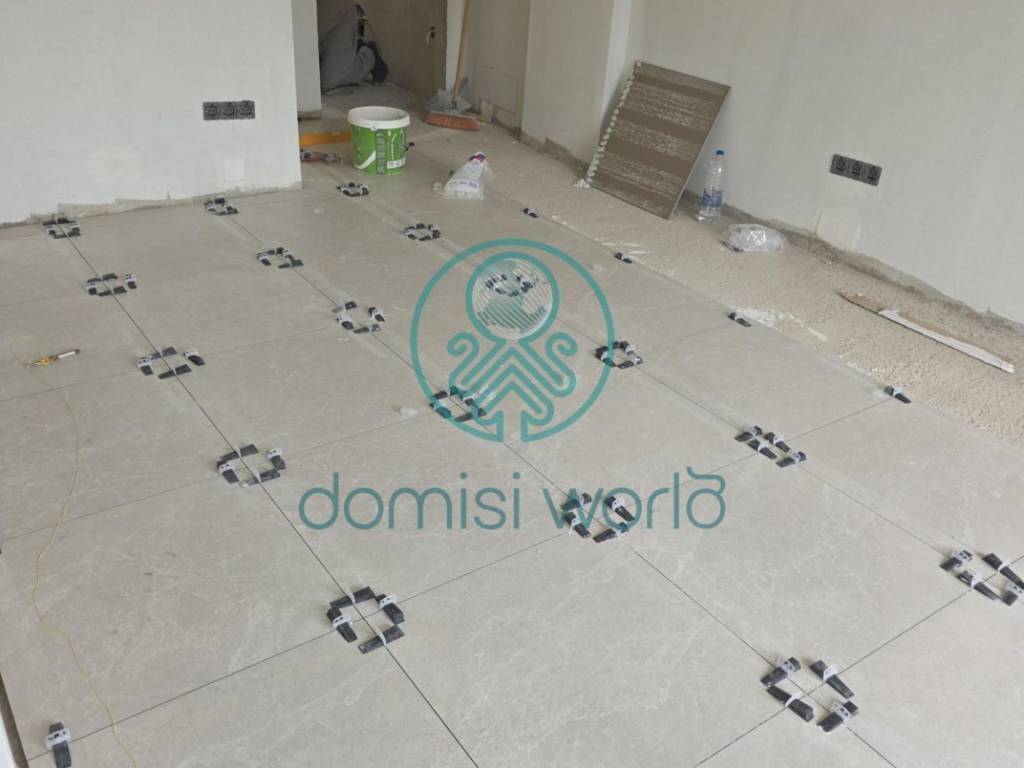 De vloer van het appartement is gemaakt van graniet in een lichte porseleinen afwerking, wat zorgt voor een elegante en moderne uitstraling.