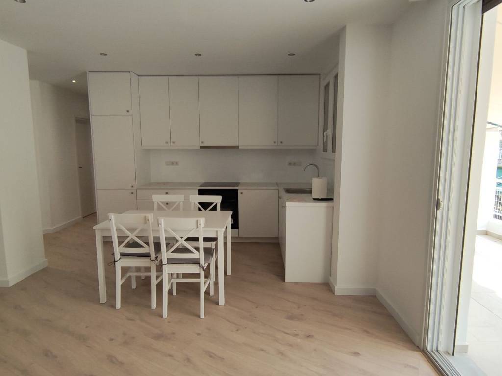 In a well‑maintained apartment building from 1980, we offer a newly renovated 60 sq.m. apartment on the 4th floor, featuring a spacious south‑facing terrace. The apartment includes a small entrance hall and a bright, generously sized living room with an open‑plan kitchen and direct access to the terrace. There are two bedrooms—one large and one smaller—both equipped with wardrobes and each opening onto small balconies at the back of the building. The renovated bathroom features a shower and a window that ensures excellent natural ventilation. The apartment is fully equipped: a fitted kitchen with a new fridge, ceramic hobs, and an oven; a bathroom with a washing machine; a living room with a sofa; and bedrooms furnished with double beds. All floors are finished with wood‑look laminate flooring. The location is excellent—just 170 meters from the Kato Patisia metro station, offering quick and easy access to the city center: only four stops to Omonia and five to Monastiraki. It is located very close to Banks, schools, Market and public transport. More properties www.mestate.gr