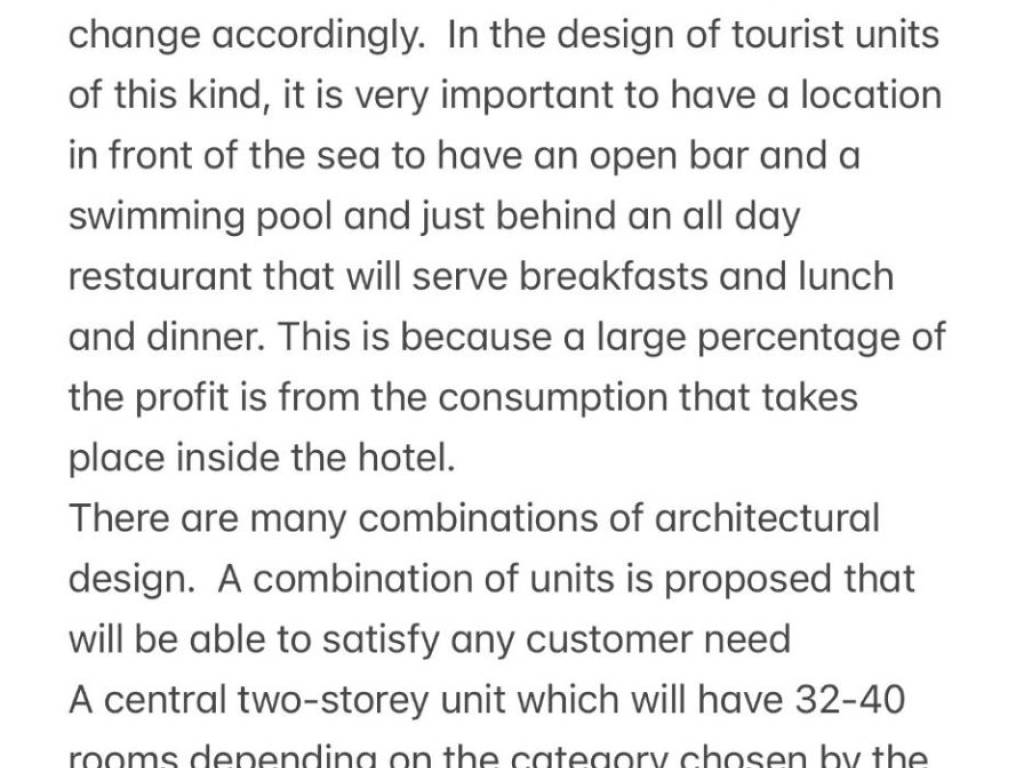 About 2,300 m2 can be built on the plot. These do not include possible basements that will result from the design. The buildings will have a maximum height of 7.50 m. This is an initial master plan from which after discussion with the investor the final plan can be derived step by step. The category of the Hotel unit plays a role because the design requirements change accordingly. In the design of tourist units of this kind, it is very important to have a location in front of the sea to have an open bar and a swimming pool and just behind an all day restaurant that will serve breakfasts and lunch and dinner. This is because a large percentage of the profit is from the consumption that takes place inside the hotel. There are many combinations of architectural design. A combination of units is proposed that will be able to satisfy any customer need A central two-storey unit which will have 32-40 rooms depending on the category chosen by the investor Behind 2 independent two-storey units that will have 12 rooms each. Further back I propose to build 2 two-storey units with 4 two-storey maisonettes each with a private pool. At the entrance of the plot there will be a parking space for cars. The surrounding area is an important part of the design and will be determined after the final location of the buildings in collaboration with the landscape architects A discussion with the investor will be needed to reach the final form of the master plan with the locations of the buildings. The external appearance of the buildings will be determined after discussion with the investors. I am sending you some photos of types of buildings, open bars and restaurants