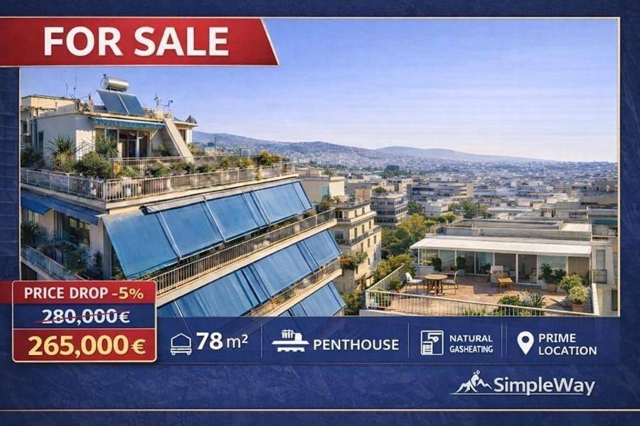 Pangrati - Apartment 78sqm bedrooms 2, levels 1, 5th, penthouse, year built 1969, energy class E, living room, kitchen, bathroom, wc, heating type: central (natural gas), air condition, luminous, corner, solar heater, balconies, large balconies, tents, elevator, aluminum frames, wood & mosaic floors, secure door, residential zone.
