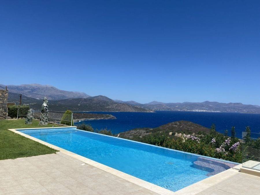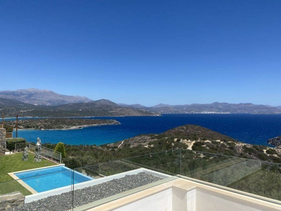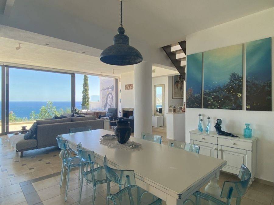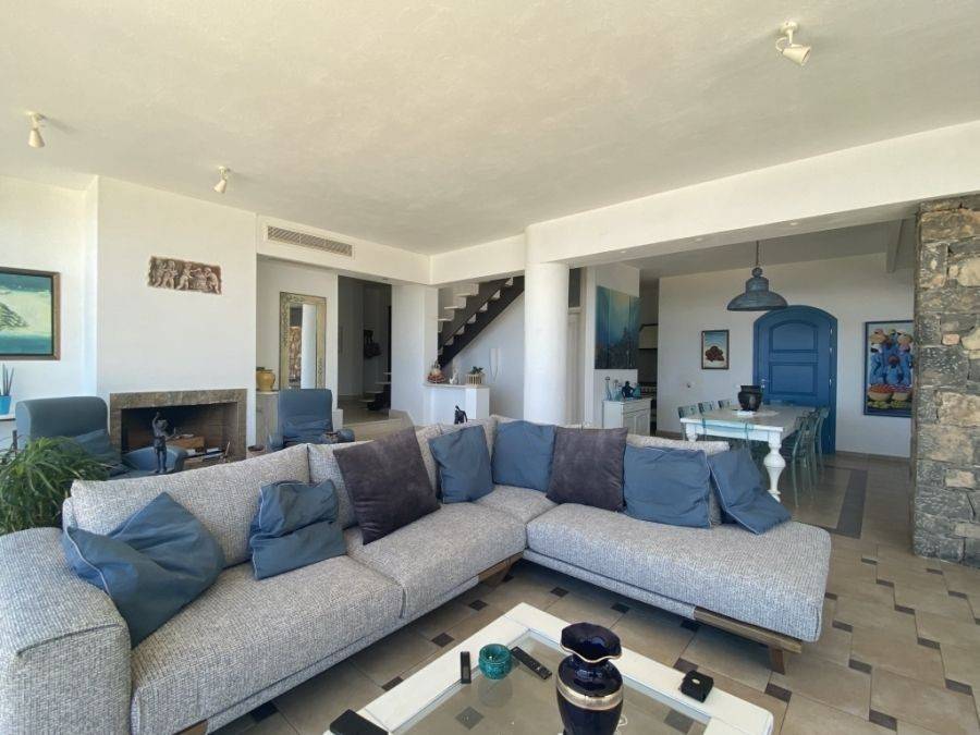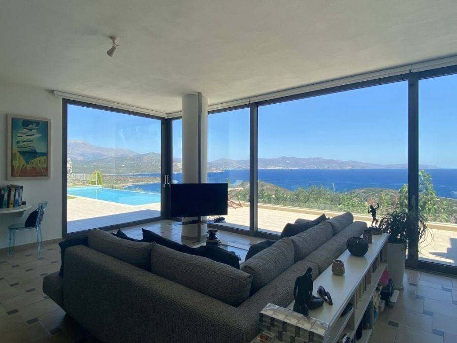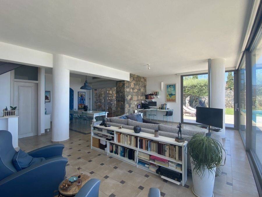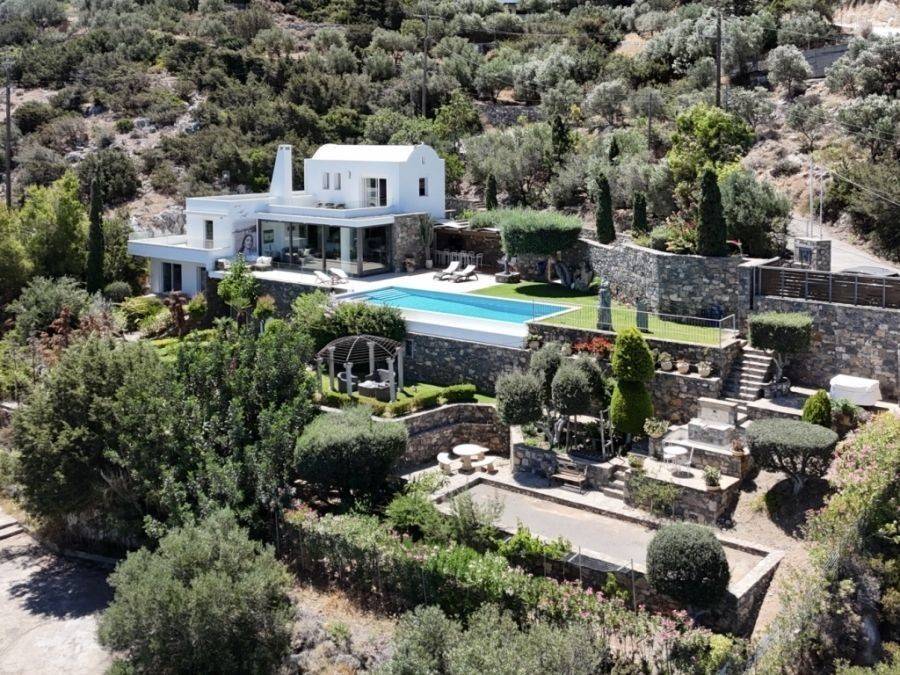 A wonderful villa of 275m2 + 70m2 garages, with the most fantastic panoramic views is available for sale. It is located only 300m from the sea, 10km from the capital of eastern Crete, Agios Nikolaos and 75km from the international airport of Heraklion. An electronic security gate and a private driveway leading to the villa and also there are two secure garages. Within a land plot of 4,010 m2 this stylish villa opens to a spacious living room with sliding glass doors and windows that offers amazing sea views. There is a kitchen fully equipped, including electric cooker with induction hob and extractor fan, double sink, fridge freezer with ice maker and washing machine. Also there is a WC for the guests and a bedroom with en-suite bathroom with Jacuzzi. This bedroom has its own veranda where there is a large round external sofa. Stone steps ascend to the master bedroom which includes an unusual free standing bath tub. There is a spacious walk in dressing room, also equipped with mini-bar fridge and safe. It has a large terrace. The two guest suites are downstairs and each bedroom has its own terrace and en-suite shower.. The 5th bedroom can be a separate studio with external access as this space has all services available there (kitchen and bathroom).Additionally there are two spacious store rooms, one of which is used for the house machinery (boiler, alarm etc.). All the furniture and white goods such as statues and sculptures and other works of art have been bought from Italy. The villa includes solar panel, boiler, central heating and air-conditioning. Outside there is a beautiful landscaped garden with grass, flowers and trees ,bbq, a dining area, a large swimming pool and night lights that makes a nice atmosphere. It is a good choice for those who are looking for a different type of villa with panoramic amazing sea views.