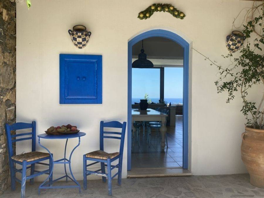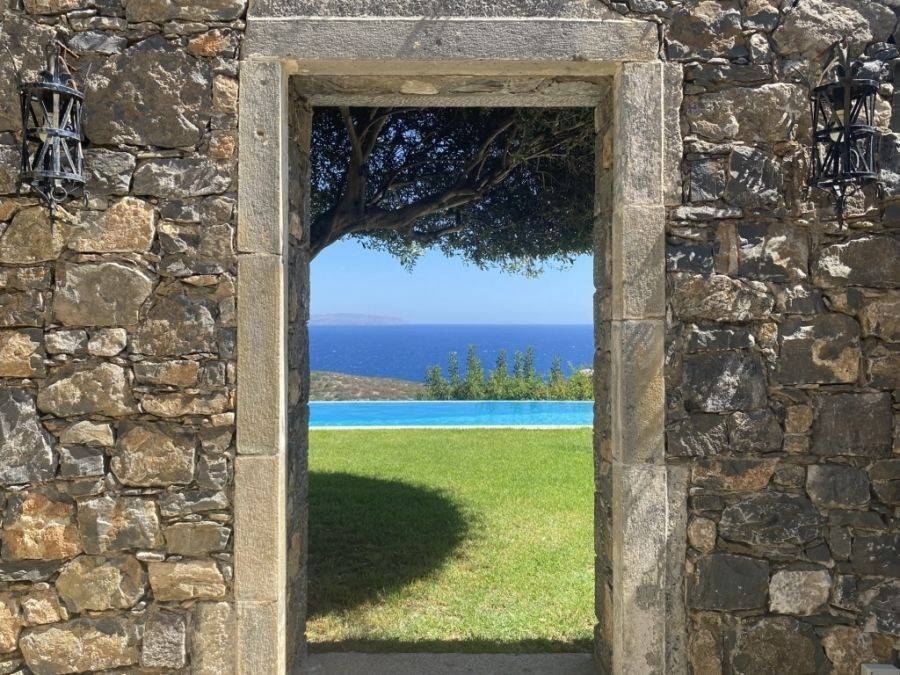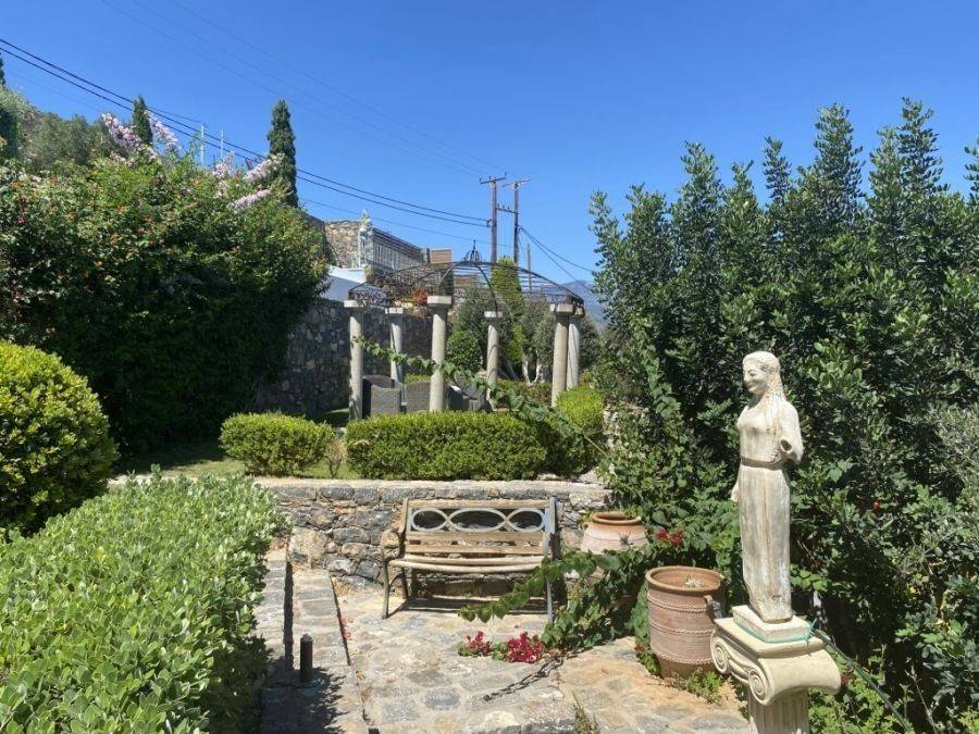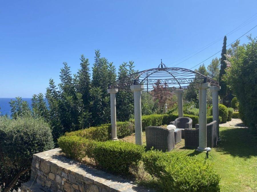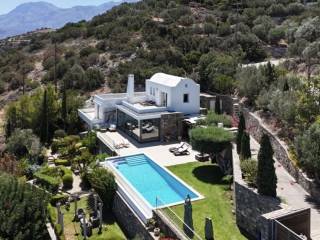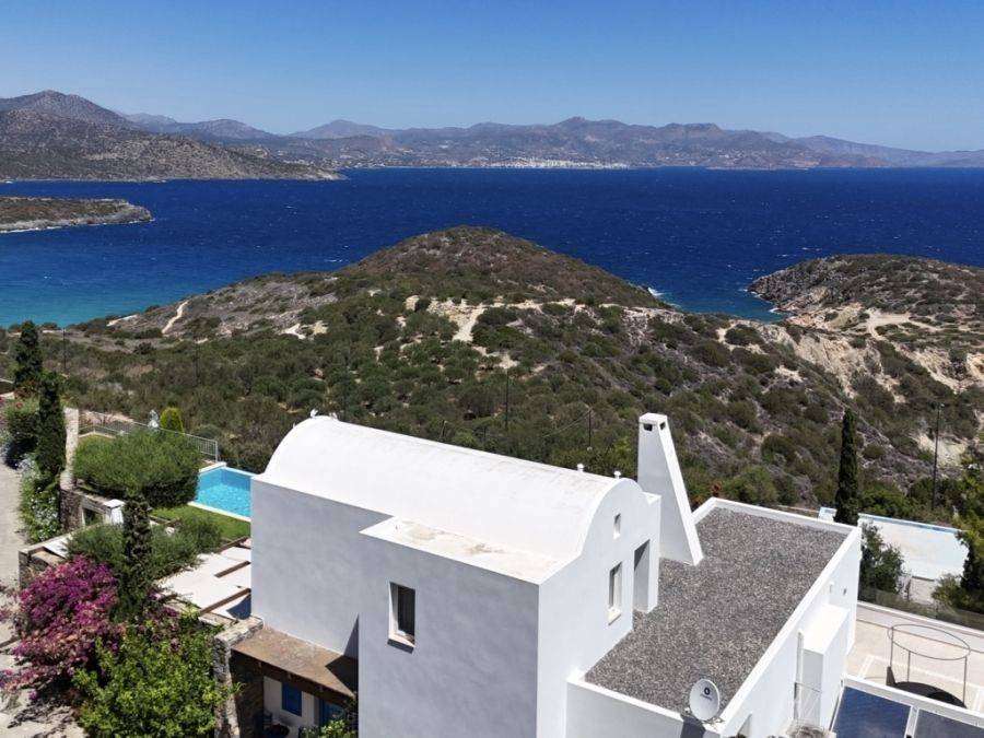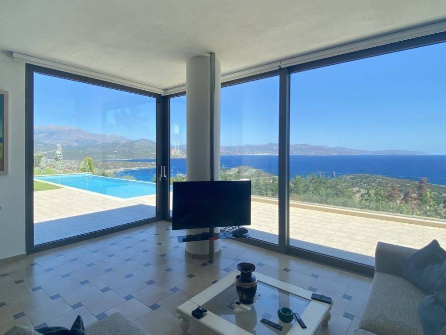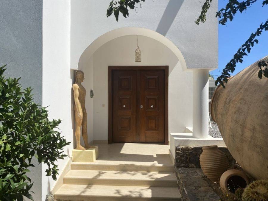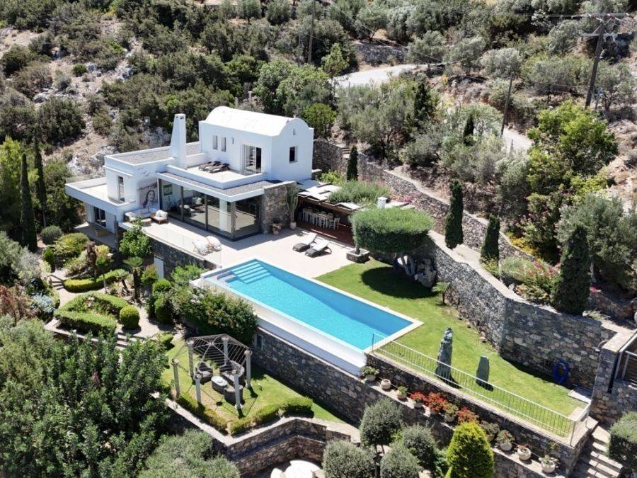 A wonderful villa of 275m2 + 70m2 garages, with the most fantastic panoramic views is available for sale. It is located only 300m from the sea, 10km from the capital of eastern Crete, Agios Nikolaos and 75km from the international airport of Heraklion. An electronic security gate and a private driveway leading to the villa and also there are two secure garages. Within a land plot of 4,010 m2 this stylish villa opens to a spacious living room with sliding glass doors and windows that offers amazing sea views. There is a kitchen fully equipped, including electric cooker with induction hob and extractor fan, double sink, fridge freezer with ice maker and washing machine. Also there is a WC for the guests and a bedroom with en-suite bathroom with Jacuzzi. This bedroom has its own veranda where there is a large round external sofa. Stone steps ascend to the master bedroom which includes an unusual free standing bath tub. There is a spacious walk in dressing room, also equipped with mini-bar fridge and safe. It has a large terrace. The two guest suites are downstairs and each bedroom has its own terrace and en-suite shower.. The 5th bedroom can be a separate studio with external access as this space has all services available there (kitchen and bathroom).Additionally there are two spacious store rooms, one of which is used for the house machinery (boiler, alarm etc.). All the furniture and white goods such as statues and sculptures and other works of art have been bought from Italy. The villa includes solar panel, boiler, central heating and air-conditioning. Outside there is a beautiful landscaped garden with grass, flowers and trees ,bbq, a dining area, a large swimming pool and night lights that makes a nice atmosphere. It is a good choice for those who are looking for a different type of villa with panoramic amazing sea views.