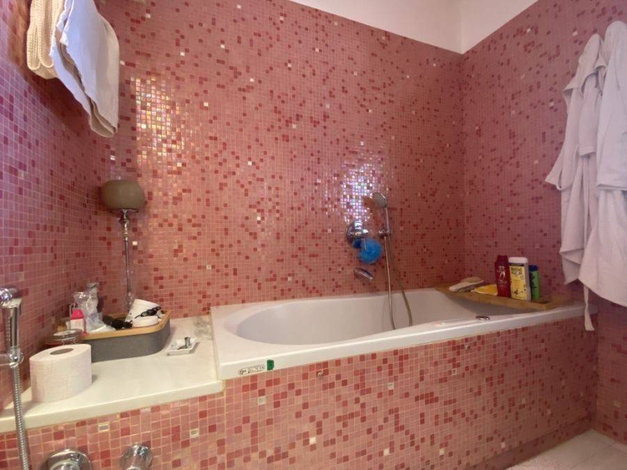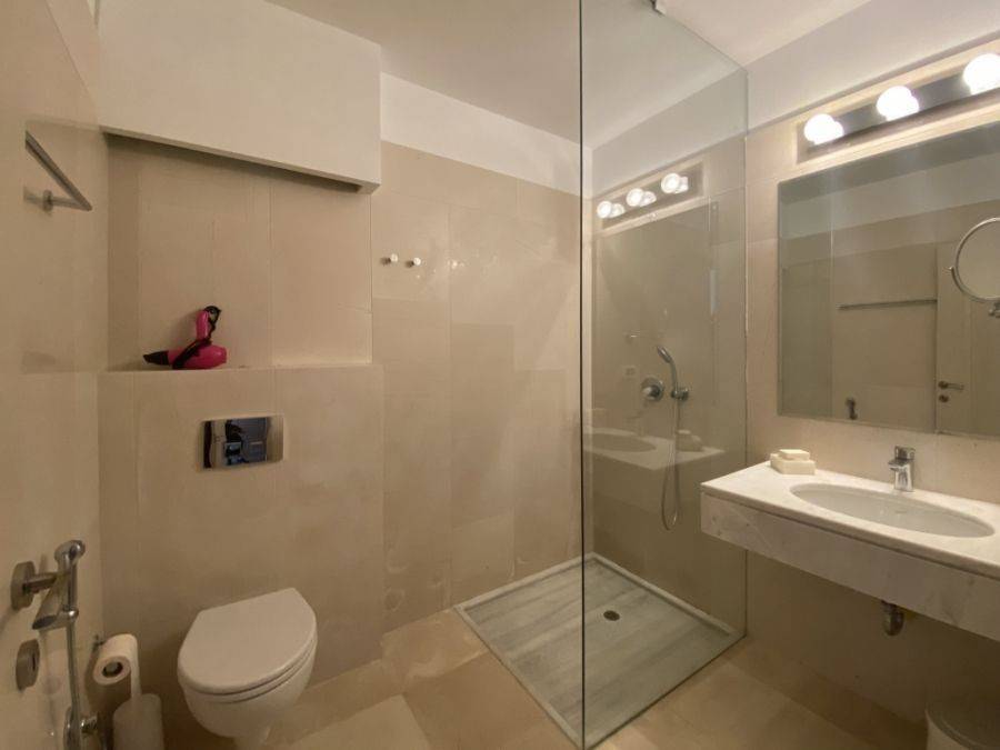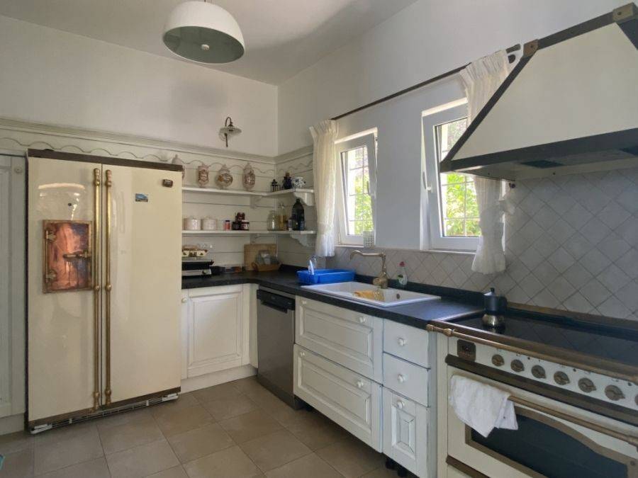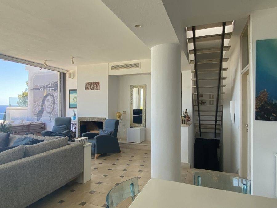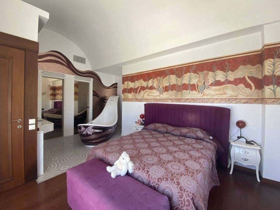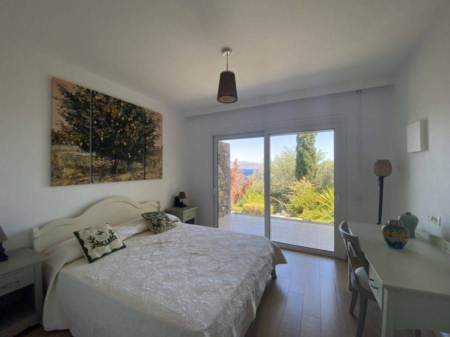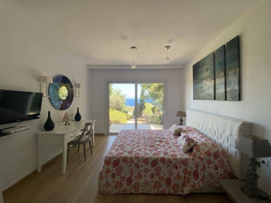 A wonderful villa of 275m2 + 70m2 garages, with the most fantastic panoramic views is available for sale. It is located only 300m from the sea, 10km from the capital of eastern Crete, Agios Nikolaos and 75km from the international airport of Heraklion. An electronic security gate and a private driveway leading to the villa and also there are two secure garages. Within a land plot of 4,010 m2 this stylish villa opens to a spacious living room with sliding glass doors and windows that offers amazing sea views. There is a kitchen fully equipped, including electric cooker with induction hob and extractor fan, double sink, fridge freezer with ice maker and washing machine. Also there is a WC for the guests and a bedroom with en-suite bathroom with Jacuzzi. This bedroom has its own veranda where there is a large round external sofa. Stone steps ascend to the master bedroom which includes an unusual free standing bath tub. There is a spacious walk in dressing room, also equipped with mini-bar fridge and safe. It has a large terrace. The two guest suites are downstairs and each bedroom has its own terrace and en-suite shower.. The 5th bedroom can be a separate studio with external access as this space has all services available there (kitchen and bathroom).Additionally there are two spacious store rooms, one of which is used for the house machinery (boiler, alarm etc.). All the furniture and white goods such as statues and sculptures and other works of art have been bought from Italy. The villa includes solar panel, boiler, central heating and air-conditioning. Outside there is a beautiful landscaped garden with grass, flowers and trees ,bbq, a dining area, a large swimming pool and night lights that makes a nice atmosphere. It is a good choice for those who are looking for a different type of villa with panoramic amazing sea views.