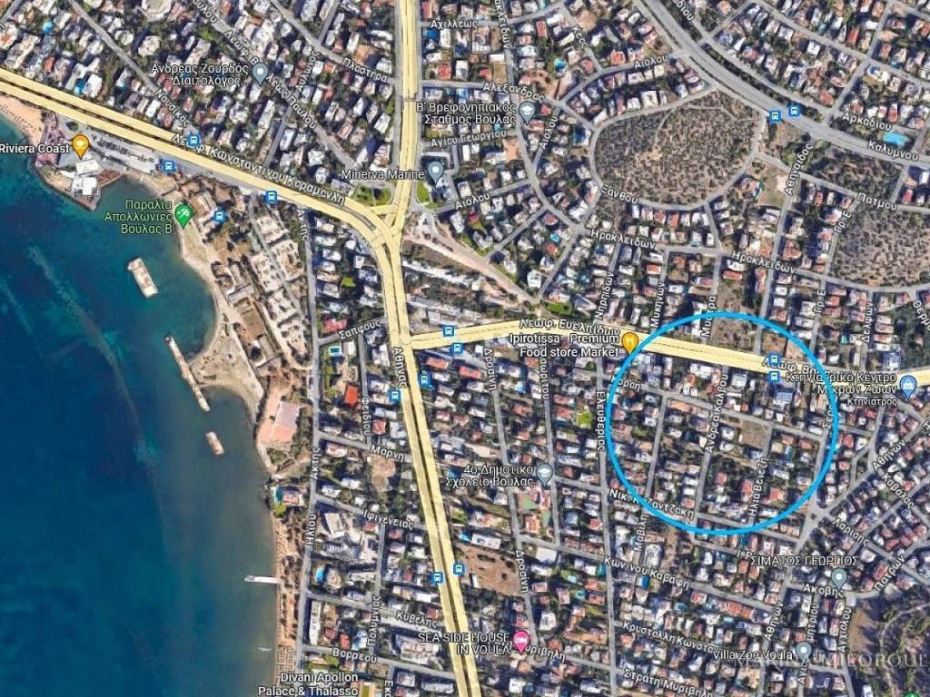 VOULA - Pigadakia. Plot on Evelpidon Avenue, 1297 sq m. Facade 24.5. Building factor: 0.6 Coverage: 20-30% Zone price: 1350€. Located very close to a local market, 800 meters from the sea, 1.5 km from the organized beach of Apollon Hotel, 2 km from Voula Square and 18 km from the airport.