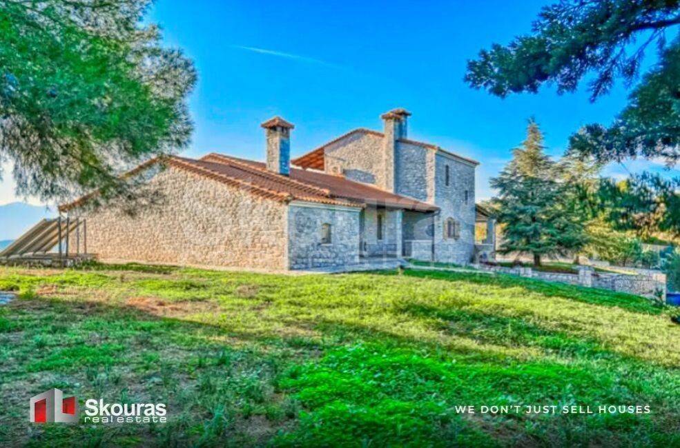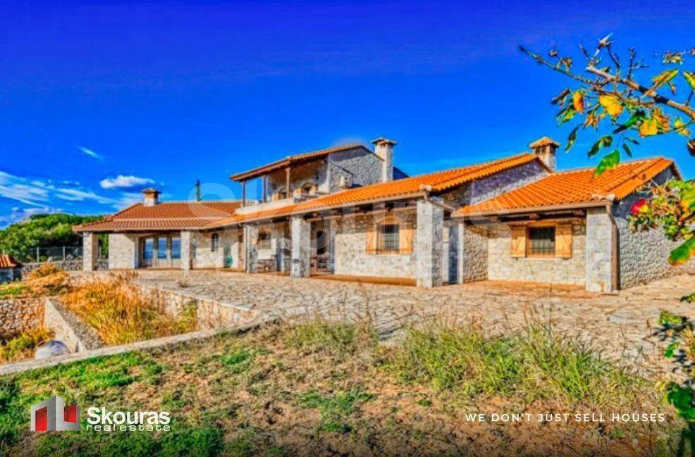 In a privileged location in Agios Adrianos, just 10 minutes from Nafplio, an impressive stone-built villa of 400 sq.m. is available for rent, set on a private plot of 4,000 sq.m., offering uninterrupted views of the Argolic Gulf and the historic town. A property that combines absolute tranquility, privacy, and refined aesthetics. The residence is developed over three levels and stands out for its spacious, bright interiors and its elegant, stately design. On the main level, there is an open-plan kitchen with a dining area and a living room with a fireplace, leading to the impressive central lounge with a second fireplace and a formal dining space. On the same level, there is a remarkable 50 sq.m. master suite, featuring a jacuzzi, en-suite bathroom, and a walk-in closet. The upper floor hosts a spacious bedroom with a private bathroom and balcony, enjoying unique, unobstructed views. On the ground floor, there is a third bedroom with a private bathroom, storage areas, and a closed garage for two vehicles, while an additional four parking spaces are available outdoors. The surrounding area is a true highlight, featuring a beautifully landscaped garden with lawn and mature trees, creating an ideal setting for relaxation. The built-in BBQ, traditional wood-fired oven, and private chapel within the plot add a distinctive character, where nature, tradition, and luxury coexist harmoniously. The residence is equipped with autonomous oil heating with radiators, air conditioning, a solar water heater, and a boiler, while wooden window frames with double glazing enhance energy efficiency and the sense of quality. Additional features include a security door, alarm system, insect screens, and water tanks. With an east orientation and unobstructed views, the home is filled with natural light throughout the day, offering a truly exceptional lifestyle. Skouras Real Estate #1 Greek Real Estate Company in the Peloponnese 4 Offices: Nafplio | Kalamata | Corinth | Porto Heli 3000+ Properties | 18+ Years of Experience | Support in 5 Languages Marketing & Website - European Property Awards 2020 Marketing Techniques & Development - EPPA 2022 & 2024 Call Center: +30 27520 29529 Mobile: +30 6949687414 Email: cst@skourasrealestate.gr Property Manager: Christos Stamatelopoulos More than 3,000 properties available at: www.skourasrealestate.gr Note: Property information is based on details provided by the owners. Skouras Real Estate bears no responsibility for any inaccuracies. For property viewings, presentation of an ID card or passport is required. Map locations are approximate.