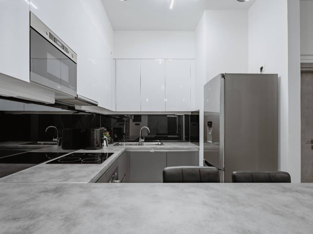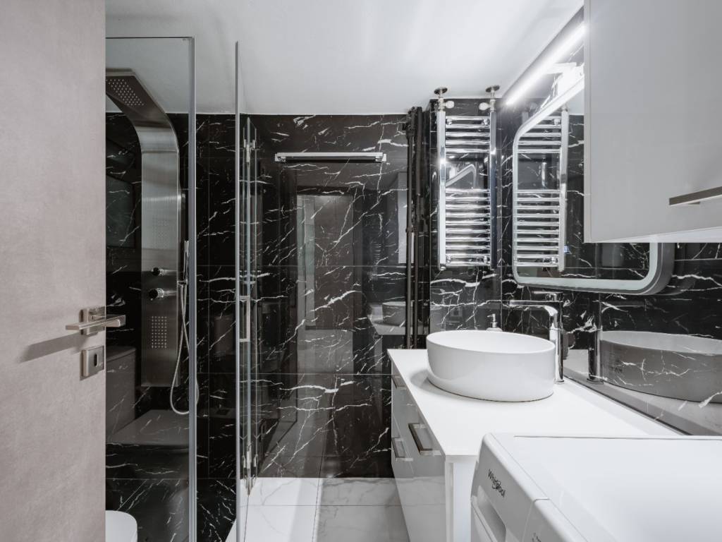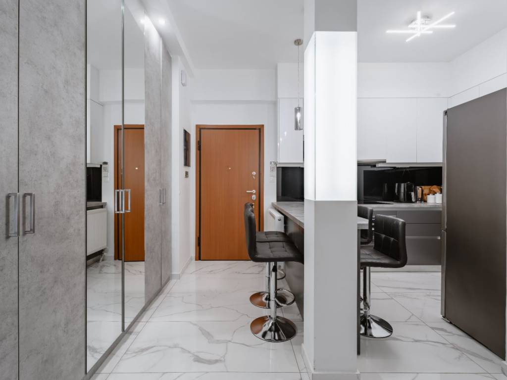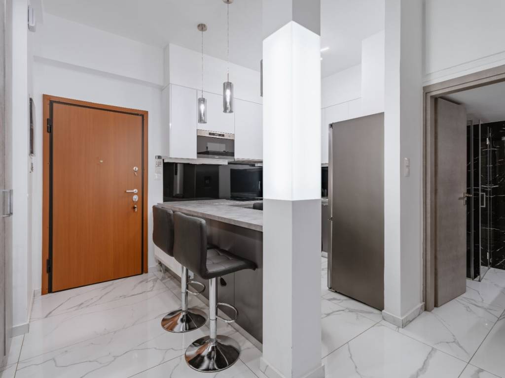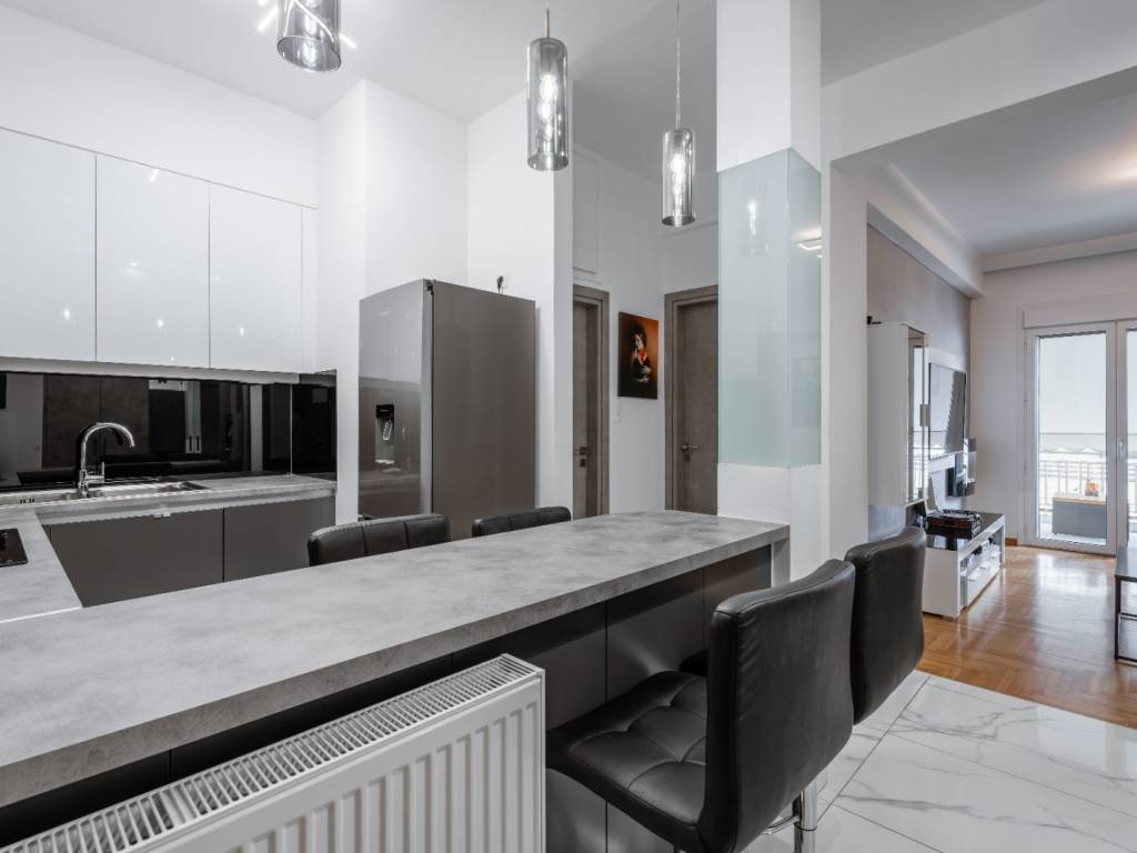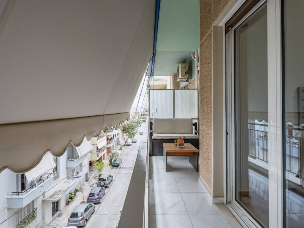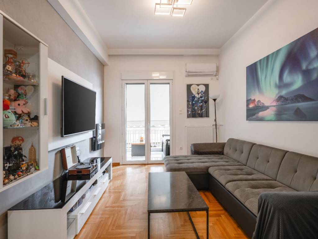 Το διαμέρισμα είναι πλήρως ανακαινισμενο (υδραυλική και ηλεκτρολογική εγκατάσταση, νέος ηλεκτρικός πίνακας), διαθέτει καινούργια ηχομονωτικά κουφώματα με ηλεκτρικά παντζούρια. Η κουζίνα είνι καινούργια και διαθέτει καινούργιες εντοιχισμένες ηλεκτρικές συσκευές (φούρνος, κεραμικές εστίες, πλυντήριο πιάτων, φούρνος μικροκυμάτων) καθώς επίσης και φωτισμό led κάτω από τα κρεμαστά ντουλάπια. Τα πατώματα στο σαλόνι και στο υπνοδωμάτιο είναι ξύλινο παρκέ και στους λοιπούς χώρους πλακάκι μεγάλων διαστάσεων σε λευκό χρωματισμό τύπου μαρμάρου. Το μπάνιο είναι πλήρως ακαινισμένο με καμπίνα ντους, νιπτήρα επικαθήμενο σε έπιπλο μπάνου και λεκάνη με καπάκι με μηχανισμό. Το υπνοδωμάτιο έχει κρυφό φωτισμό led και ξύλινη επένδυση στο κεφαλάρι του κρεβατιού. Στο διάδρομο υπάρχει εντοιχισμένη ντουλάπα 4 τμημάτων. Το μπαλκόνι έχει τέντες