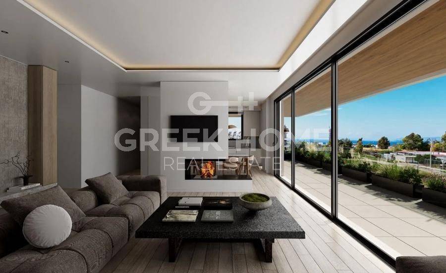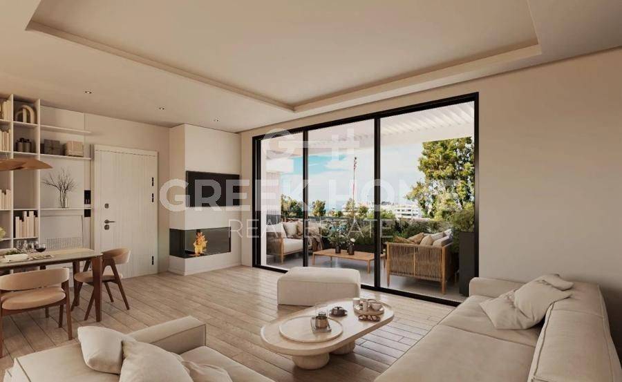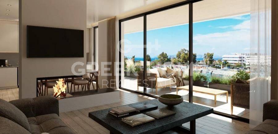 Glyfada - Apartment 128sqm plot 600sqm, bedrooms 3, 2nd, under construction, year built 2026, energy class A++, living room, kitchen, 2 bathrooms, heating type: autonomous (heat pump), air condition, parking covered,2, quiet, dual aspect apartment, luminous, corner, sea view, frontage, painted, storage space 13sqm, solar heater, external thermal insulation, fireplace, balconies, large balconies, elevator, loft storage, garden, aluminum frames, double glazed windows, door screen, wood & tile floors, secure door, video doorbell, luxurious, under floor heating, private pool, satellite, internet, pets allowed, close to sea (up to 1000m), close to park (up to 1000m).