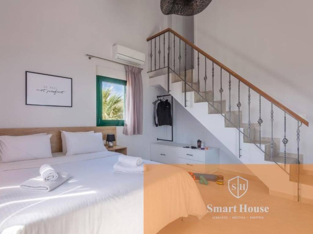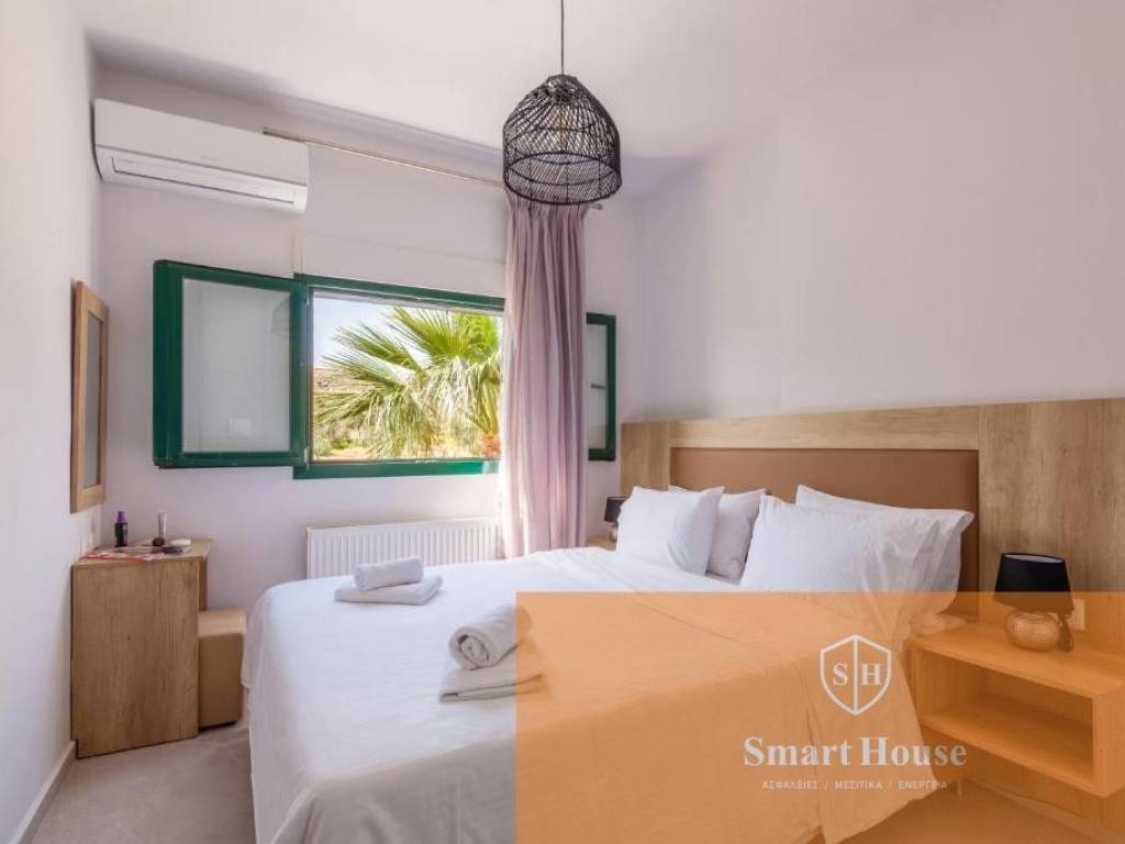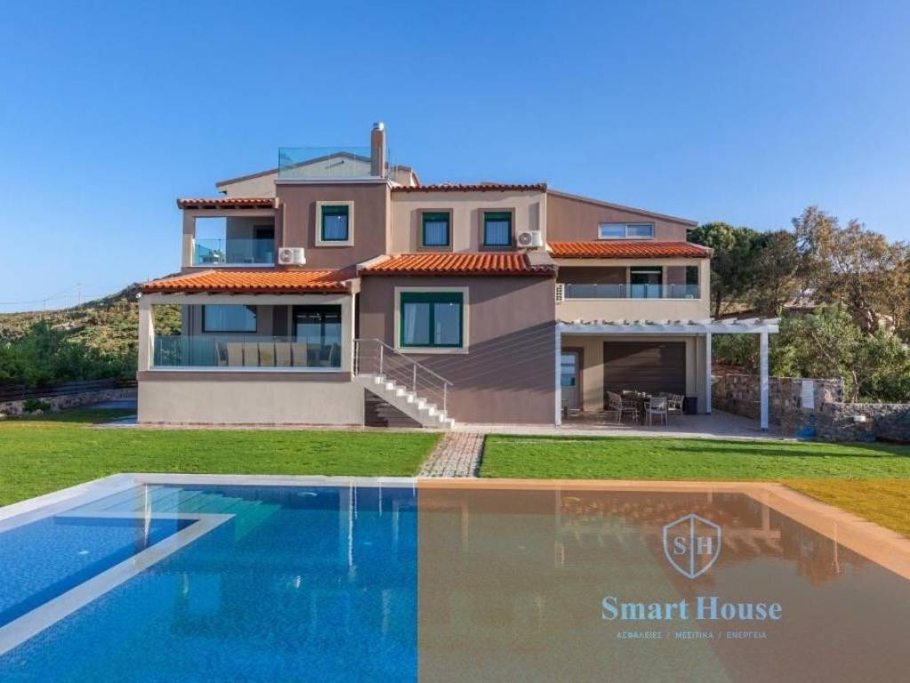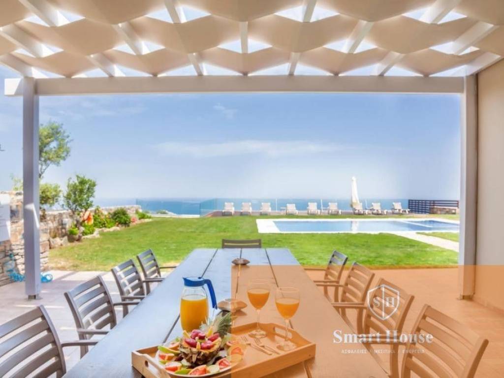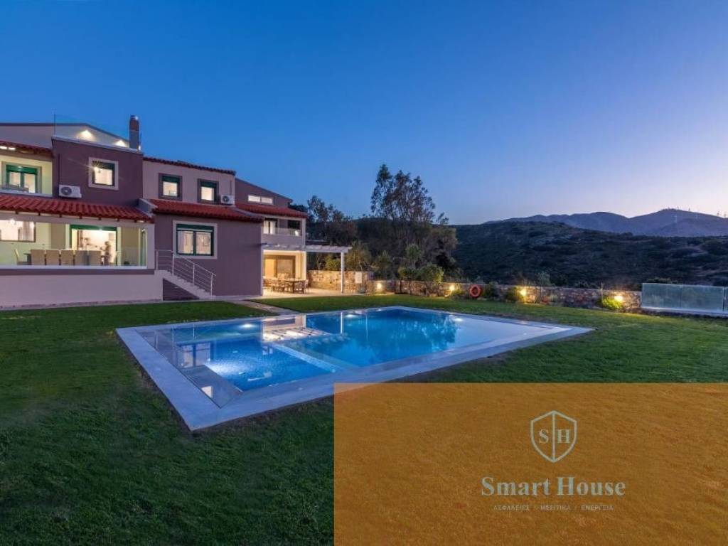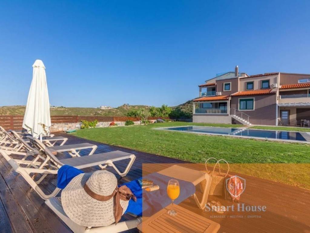 Set in an idyllic location, above the famous resorts of Lygaria and Agia Pelagia, offering the most breathtaking views over the Aegean Sea, Villa is set to impress. This 11-bedroomed villa with a large private swimming pool, fully air-conditioned, able to sleep up to 22/26 guests, is a superb example of Greek hospitality. The grounds surrounding and the location of the villa offer total privacy to the property, therefore are the perfect retreat for large groups looking for a relaxing holiday under the Cretan sun. It is composed by a main house (9 bedrooms, 7 bathrooms, lounge and kitchen) and a Guest House (2 bedrooms, 2 bathrooms, 1 kitchen), rented together for a total of 11 bedrooms and 8 bathrooms. Outside, Villa is a true oasis! There are paved terraces and gardens with lawn for sunbathing. Spending long hours under the shining sun, or strolling around the gardens, will be a true delight! A covered dining area with brick-built barbecue is available for delicious meals. The newly added private swimming pool measures 9m x 6m (depth 1.4m) with comfortable sunbeds and lovely garden views. Private parking (gated) is also available.