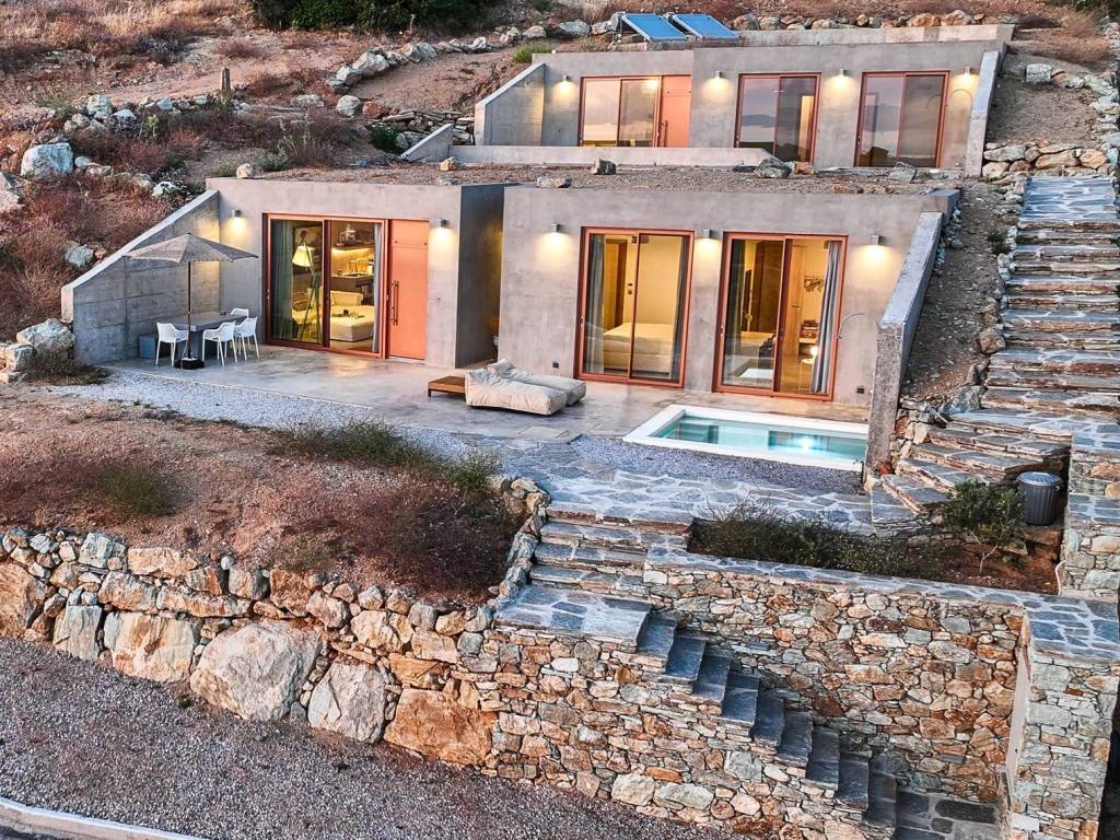Just moments from the turquoise waters of Agia Paraskevi Beach, this beautifully designed earth villa complex with two swimming-pools in Karystos, Evia, offers two stylish, fully autonomous earth homes on a generous 677.54 sq.m plot within city planning. With a total of 6 bedrooms, 3 full bathrooms, 1 WC, 2 modern kitchens, 2 living areas, and two 7 sq.m plunge pools, the villas provide both comfort and flexibility. Built with sustainability in mind, they feature geothermal energy and independent air-conditioning units. The two villas—97 sqm and 73 sqm—can remain separate or be seamlessly united into a stunning 205 sqm two-level residence (including an extra 35 sqm of building allowance) via an interior staircase or elevator. Whether as a private retreat or an investment opportunity, this unique property combines modern living with the peaceful charm of Evia’s coastline. Detailed description: -Property location: Karystos - Evia island -Plot : 677,54 sq.meters -Property: The Earth complex embraces the earth’s contours and measures 170 sq. meters in total offering 6 bedrooms, 3 full bathrooms, 1 WC, 2 full kitchens and 2 living rooms alongside exterior spaces with 2 plunge pools. -Heating and cooling via autonomous air-conditioning units throughout the property and geothermal energy. -Plunge pools size: 6 sq. meters each -Year of construction completion: 2025 The sale price includes: *35 sq.meters surplus to build according to national rules of construction *a selection of furniture and electric appliances The Earth complex consists of 2 autonomous design villas (97,10 sq.m + 72,55 sq.m) which can be united into a single earth villa of 170 sq. meters (+ 35 surplus) = 205 sq. meters in 2 levels via interior stairway or elevator (lift). This unique earth complex is crafted from high quality materials such as concrete, glass, steel and pressed cement that seamlessly integrates with the natural landscape and offers versatile viewpoints of the Aegean Sea, the Cycladic nature and Karystian rock, thus, offering ample ways to reconnect with nature. The earth villa’s sustainability features, organic aesthetics and lush rooftop greenery all enhance its eco-consciousness. This eco-friendly 170 sq. m design earth complex also features storage spaces, back yards and 2 ramps for car access to all entrances without having to use stairs. LOCATION Discover paradise in the most beautiful corner of southern Evia, driving 10 mins from Karystos town and a mere 1,5 hours trip from central Athens. Arriving at Agia Paraskevi cycladic peninsula will make you feel that you've left the world behind - Amazing turquoise sea views and unforgettable sunsets towards the Cyclades (Petalioi islands, Kea, Kythnos and Andros islands) and the magical blue Aegean Sea. At only 10 minutes drive (8 km) you have Karystos town with its cosmopolitan flair. The picturesque coastal town presents visitors with a beautiful marina and port boasting a great selection of fine dining restaurants, fresh fish tavernas, cocktail bars, trendy cafes and dance clubs, alongside, clothes stores and traditional foodies shops. Karystos has an outdoor theater and a cinema, plus, a number of amazing vineyards that you can schedule to visit for local wine and cuisine tasting. Discover Karystos archaeological museum, monuments and archaeological sites. In Karystos town you will also find supermarkets, bakeries and drycleaners, as well as, gyms, beauty salons and resort spas. ACCESS FROM ATHENS Reachable from Athens in two ways. Either by ferry or driving via Chalkida. In further detail: -Reaching the property FROM ATHENS or ATHENS AIRPORT THROUGH RAFINA PORT: From the port of Rafina, which is very close to Athens Airport, take the ferry crossing to Marmari (1 hour duration). Then drive along the coastal road following the signs to Karystos town which is only a 10-minute drive - simply 12 km and an additional 8 km from there to reach the virgin peninsula of Agia Paraskevi and My Hidden Iposkafo earth homes. -Reaching the property FROM ATHENS or ATHENS AIRPORT THROUGH AGIA MARINA PORT: Alternatively, you can also cross to Evia island by ferry via the port of Agia Marina and reach Nea Styra. The crossing is shorter (40 minutes duration) and then you take the route from Nea Styra via Kapsala village in order to arrive to Karystos town. The whole drive from Nea Styra port to Karystos town will take you 35 minutes - 33 km and an additional 8 km from there to reach the virgin peninsula of Agia Paraskevi and My Hidden Iposkafo earth homes. -DRIVING FROM GREECE MAINLAND OVER THE BRIDGE OF CHALKIDA: An interesting drive that does not involve a ferry crossing! Simply drive from any location on mainland Greece -with the aid of your gps- to get to the bridge of Chalkida that will bring you to central Evia island. From there, you will have to take the route towards southern Evia by passing through the towns of Eretria, Aliveri and Nea Styra to finally reach Karystos town and Agia Paraskevi peninsula where My Hidden Iposkafo earth homes are located. Chalkida town is less than 2 hours - 120 km away from Karystos town and an additional 8 km from there to reach the virgin peninsula of Agia Paraskevi.