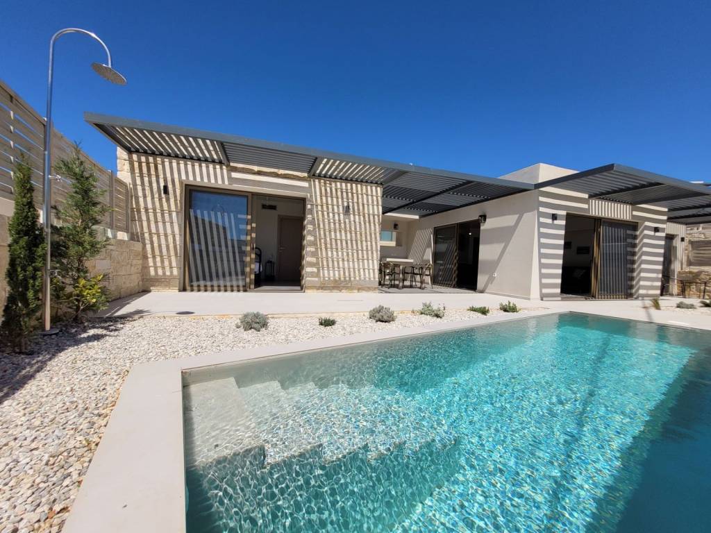 The main residence features a bright open-plan living and dining area with a contemporary kitchen, complemented by a comfortable bedroom with an en-suite shower room and a guest WC. Large floor-to-ceiling patio doors flood the interior with natural light and open directly onto the pool terrace.
