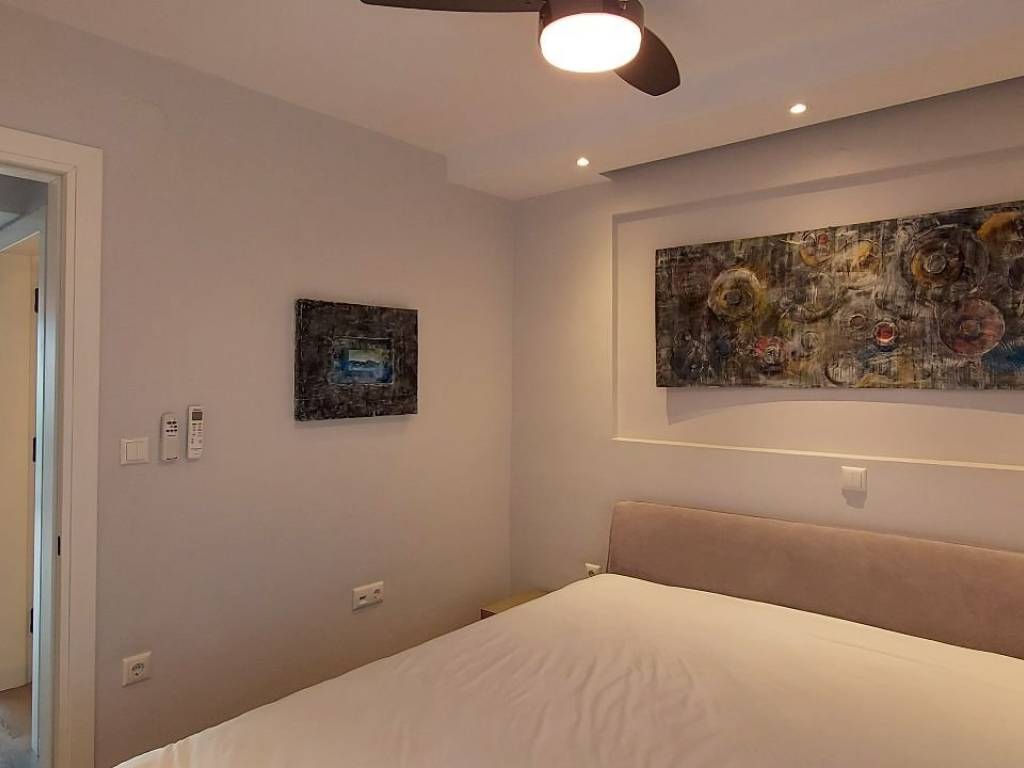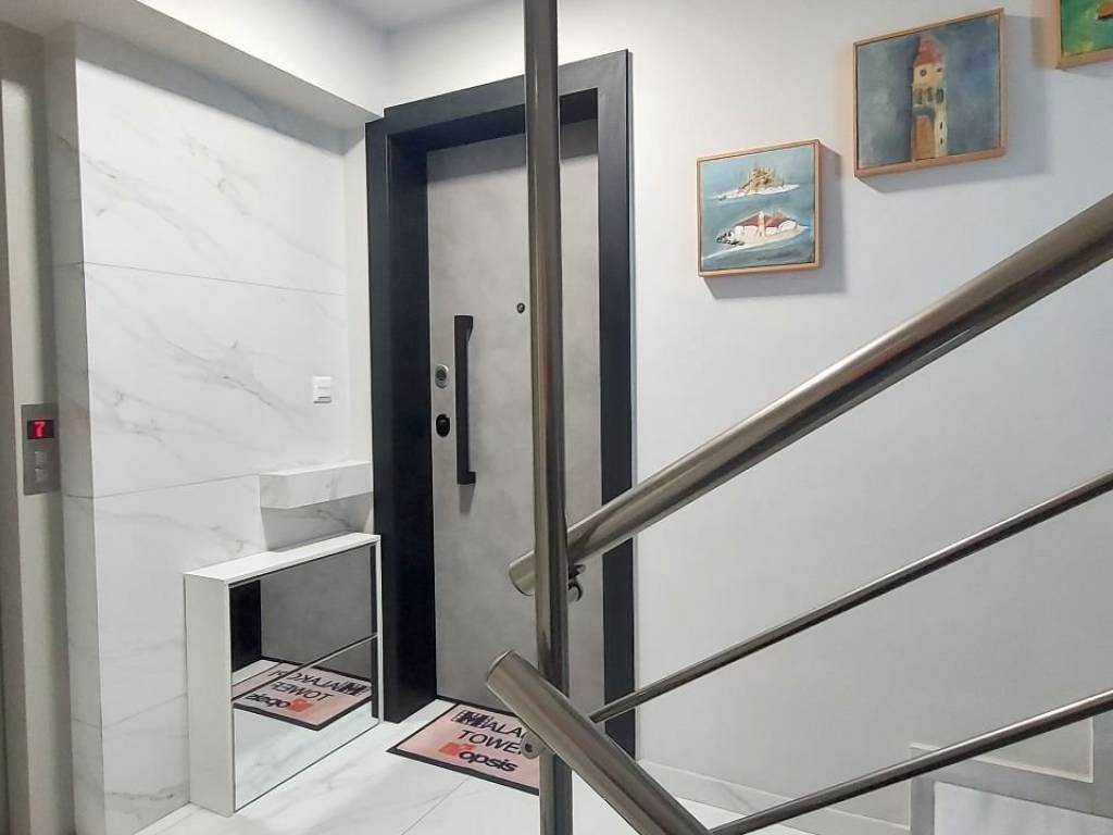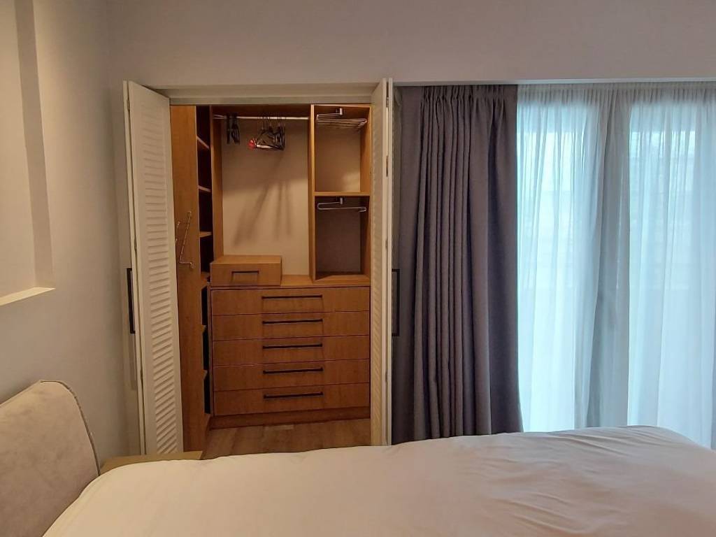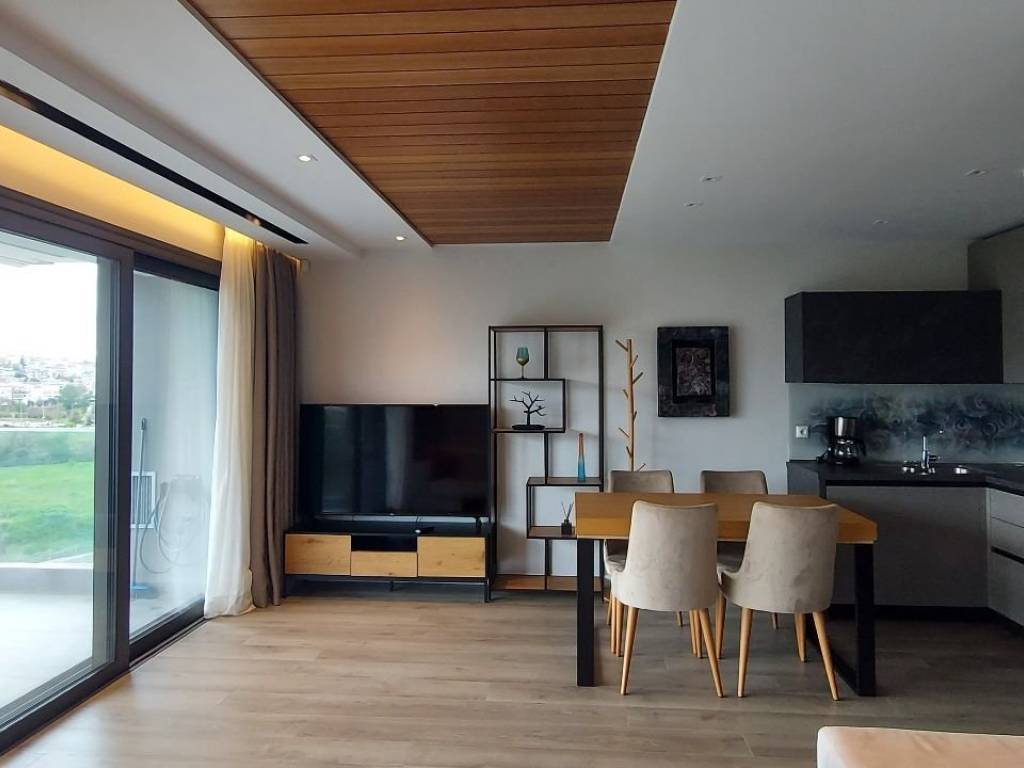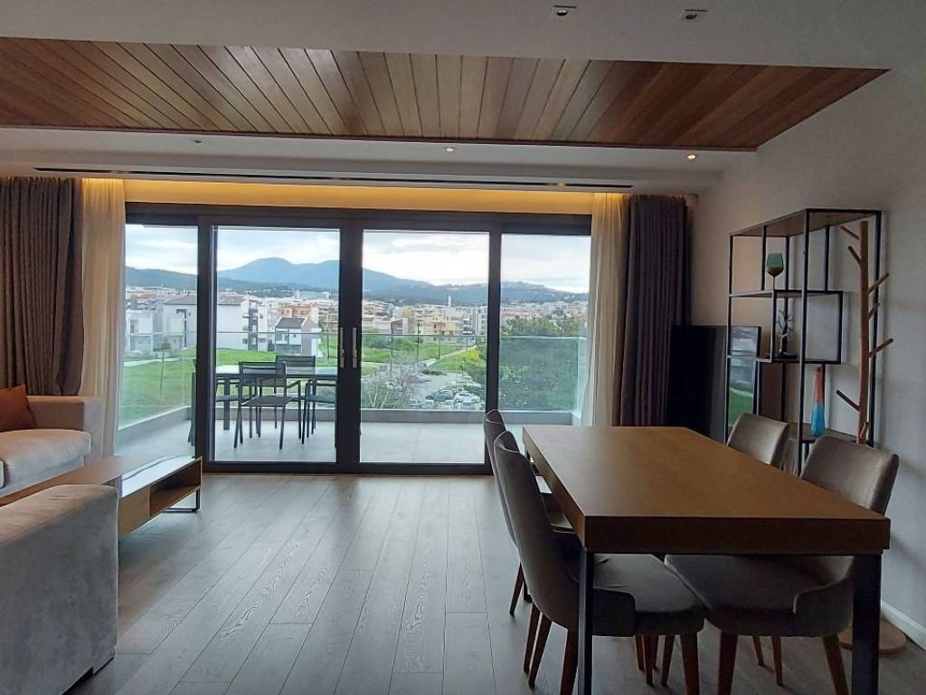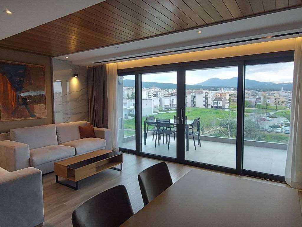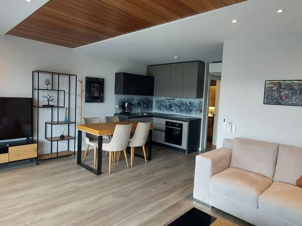 Luxury studio apartment for rent in the premium newly built building MALAKOPI TOWER, consisting of furnished premium apartments. The apartment features: Security alarm system Italian STOSA kitchen, fully equipped with FRANKE electrical appliances (refrigerator, dishwasher, induction cooktop, oven, and microwave) Washing machine Samsung 7kg Living room with a three-seater and a two-seater sofa, TV unit, and 60'' LG television Dining table with 4 chairs and a balcony table with 4 chairs Bedroom Walk-in wardrobe Bed 160×200 with anatomical mattress by Royal Crown 32'' TV The apartment is equipped with KNX Association smart-home system and awnings on both balconies. Climate & insulation Air conditioning in the bedroom (plus ceiling fan) and in the living room Aluminum window frames with multi-glazing and sound-reducing membrane for thermal and acoustic insulation Heating & energy Autonomous natural gas boiler with underfloor heating Solar water heater Energy class A+ (estimated annual heating cost: €150) All ceilings are finished with plasterboard and iroko wood. The apartment includes spot lighting and dimmable hidden LED lighting throughout. Internet is included in the rental price. No pets allowed.